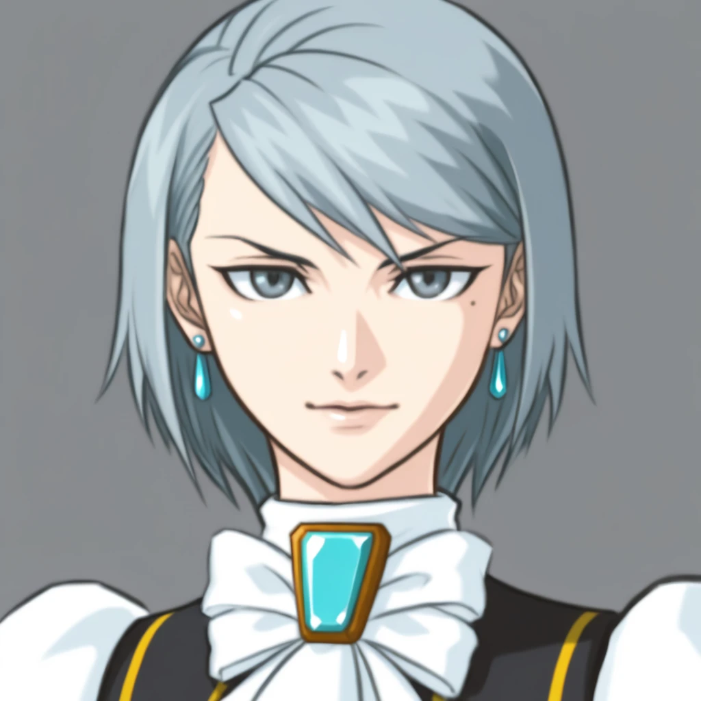 General Appearance Tags: grey hair, short hair, grey eyes, mole under eye