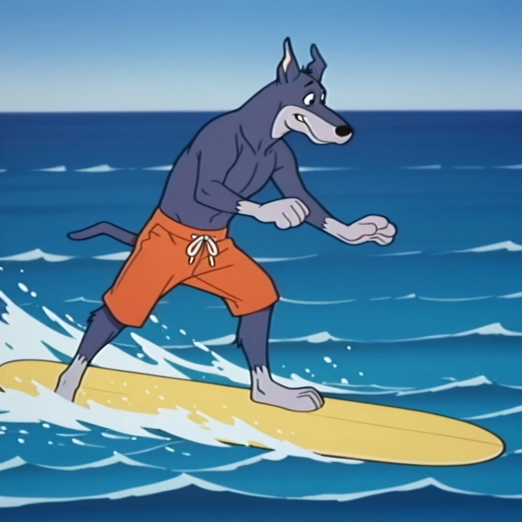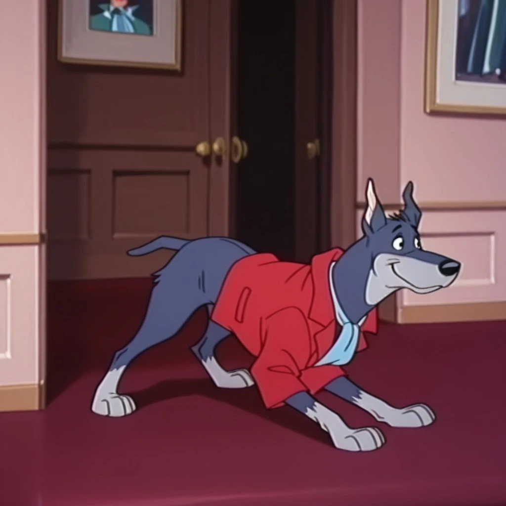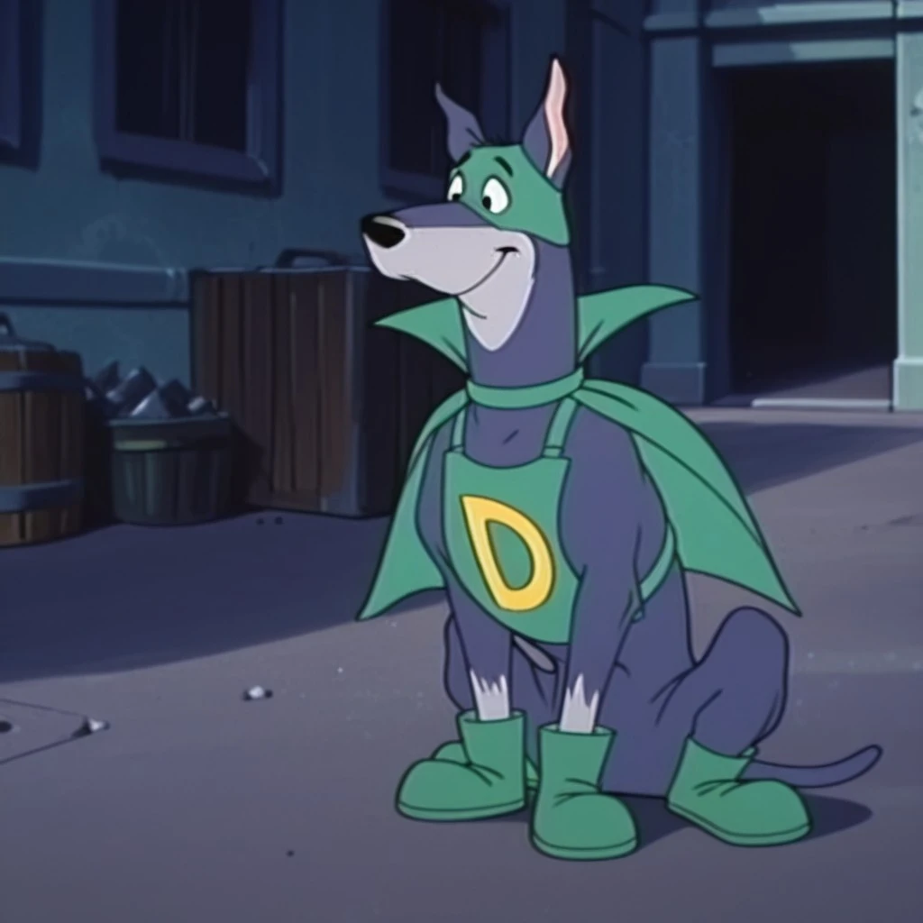 dynomuttHBil, feral, male, Doberman, Blue-gray fur, black eyes, green chest plate, green cape, green mask, green boots, green collar, green gloves,
