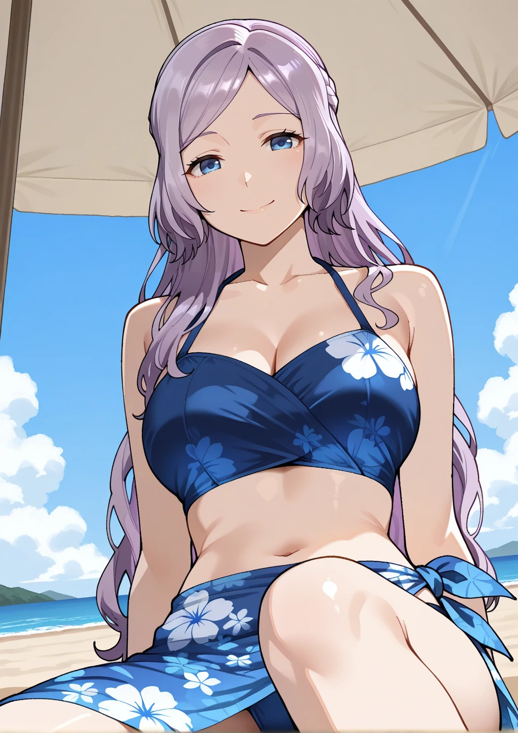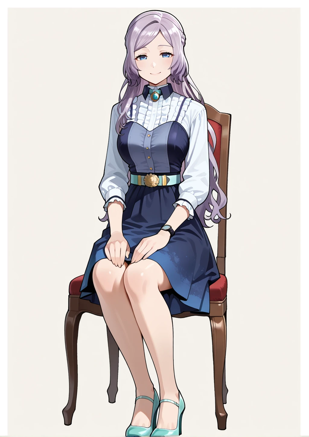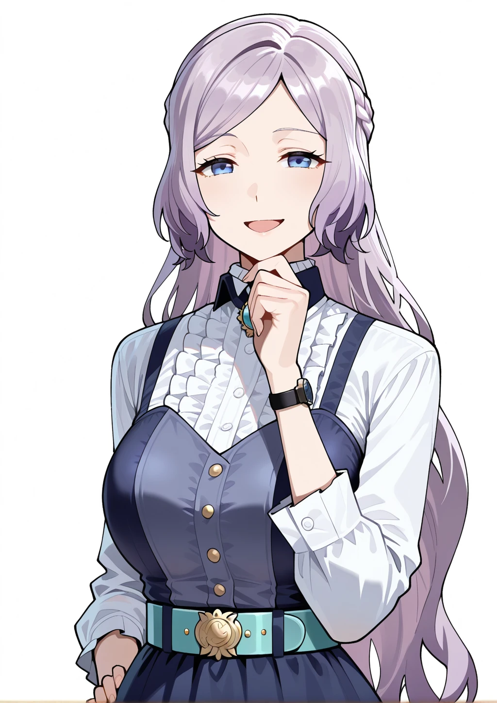 AwajiNogiku, long hair, wavy hair, light purple hair, swept bangs, blue eyes, half updo, braid, white collared shirt, frilled shirt, black collar, aquamarine brooch, dark blue bustier, dark blue midi skirt, black wristwatch, aqua belt, aqua pumps