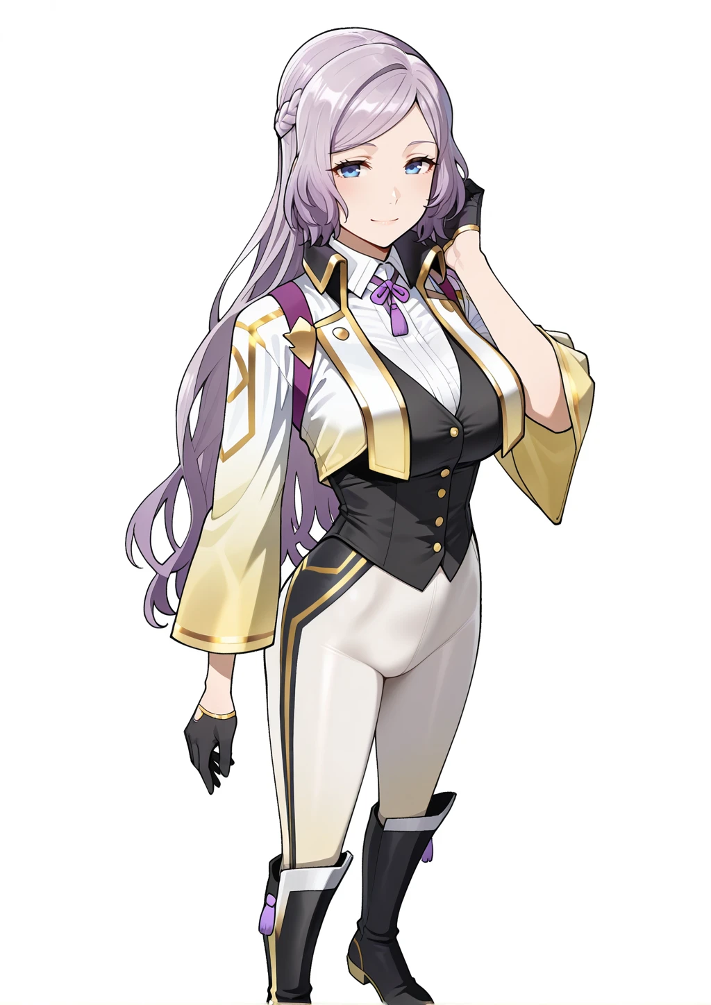AwajiNogiku, long hair, wavy hair, light purple hair, swept bangs, blue eyes, half updo, braid, yellow kagekidan_uniform, gradient jacket, wide sleeves, gold trim jacket, purple sash shoulder strap, purple string tie, white collared shirt, black vest, half gloves, white pantyhose, black knee boots, purple trim boots, gradient trim boots, yellow tassel