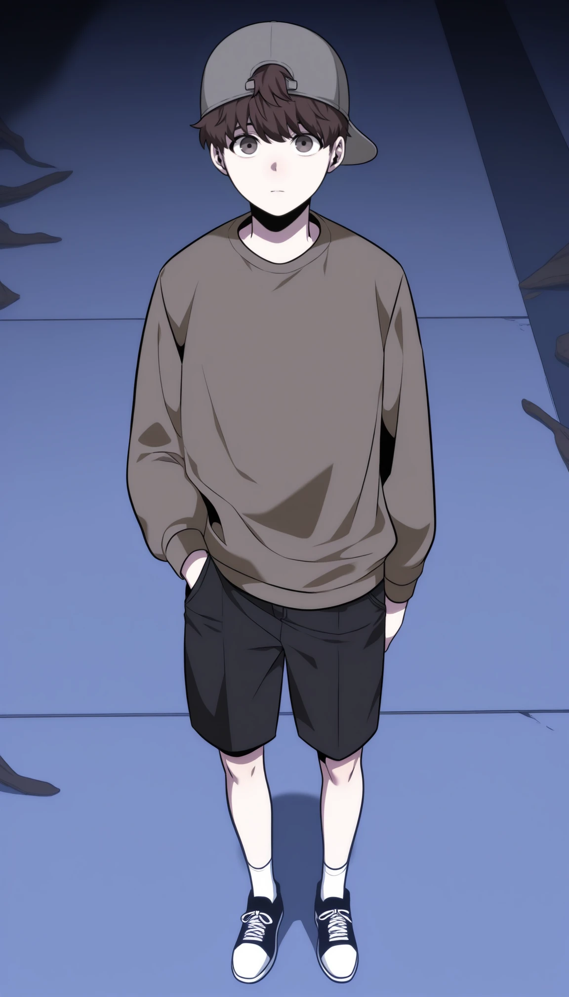young boy, lee_gilyoung, 1boy, shirt, backwards hat, shorts, socks, shoes