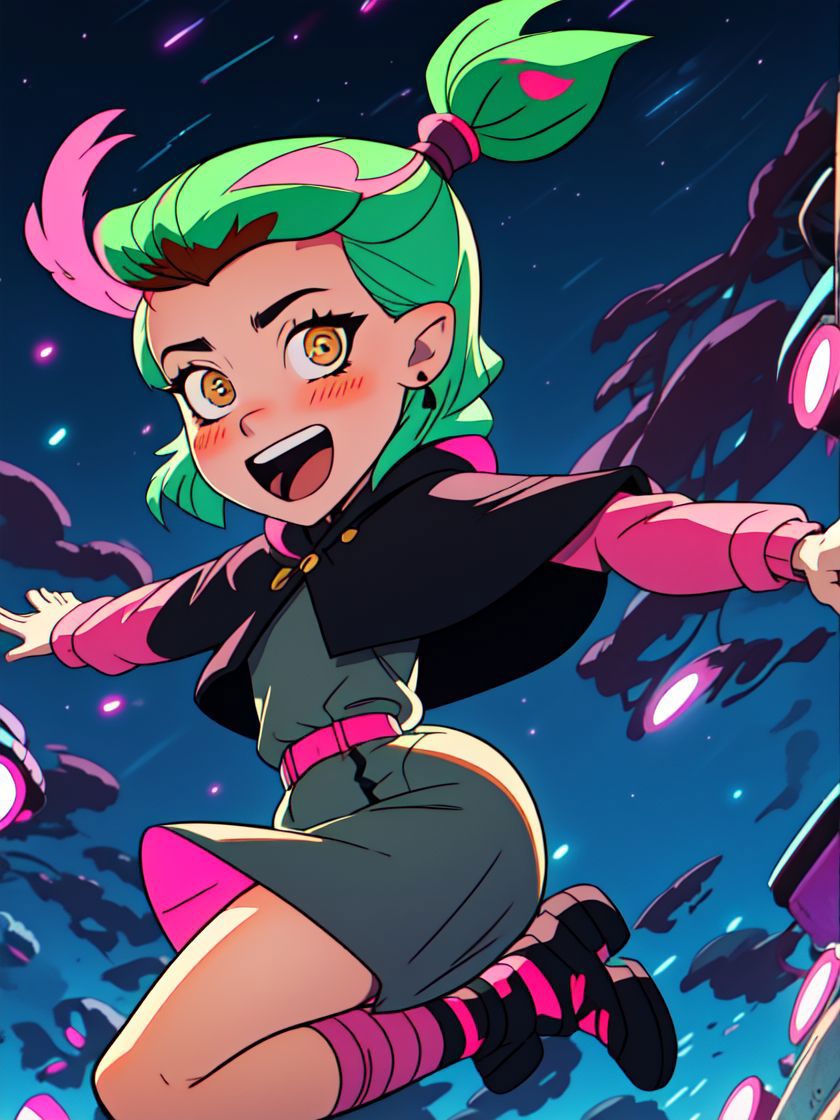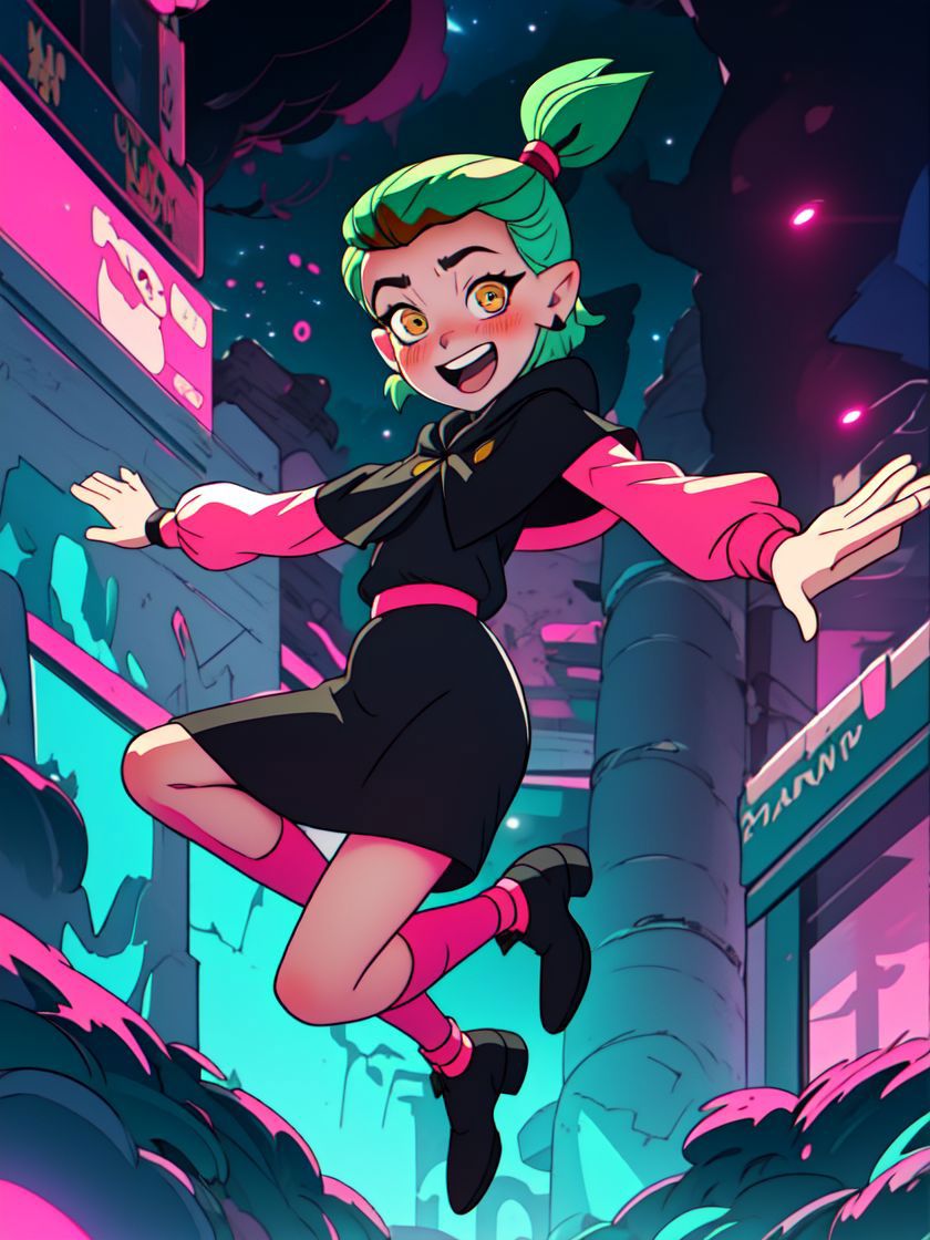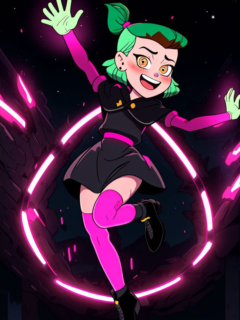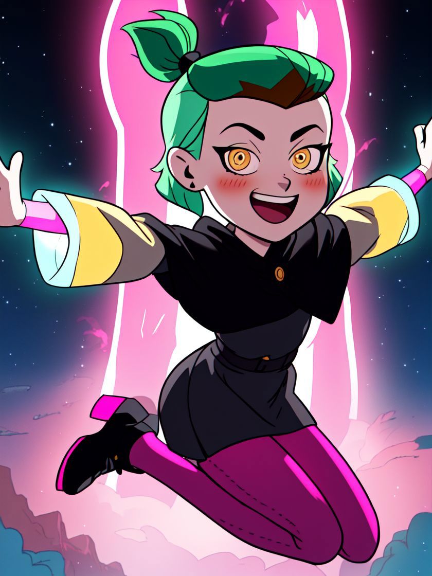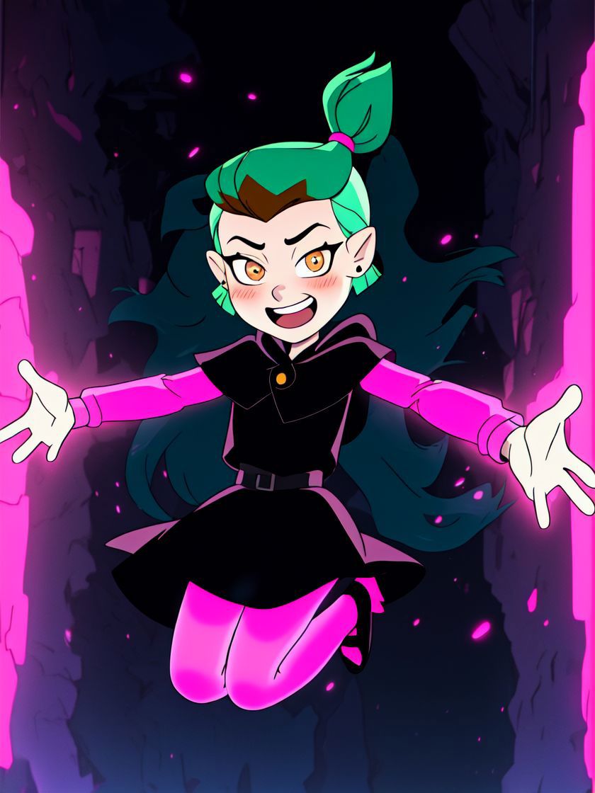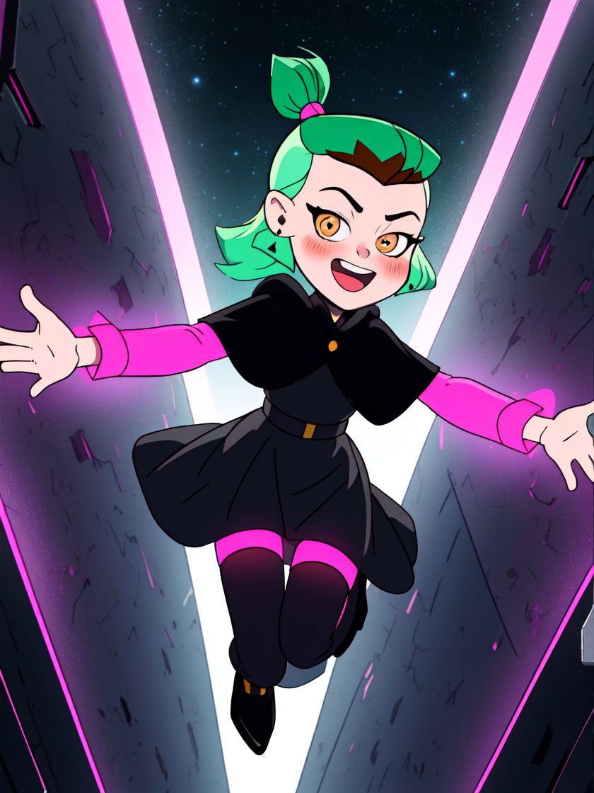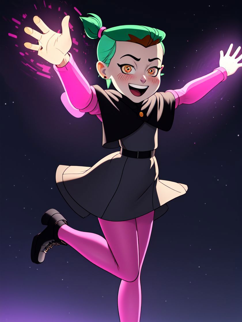 AmityS1, green hair, yellow eyes, ponytail, pink sleeves, pink legwear, black capelet, black footwear.