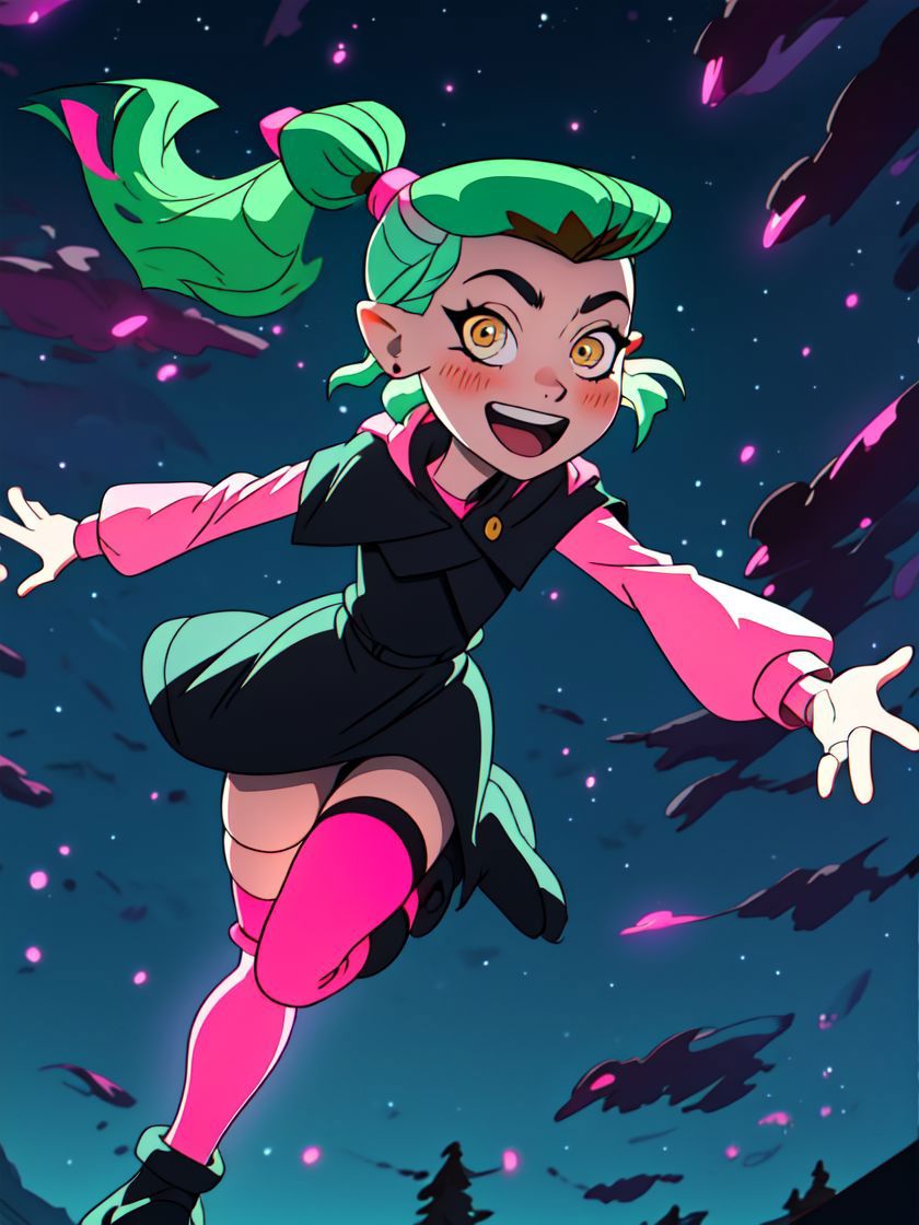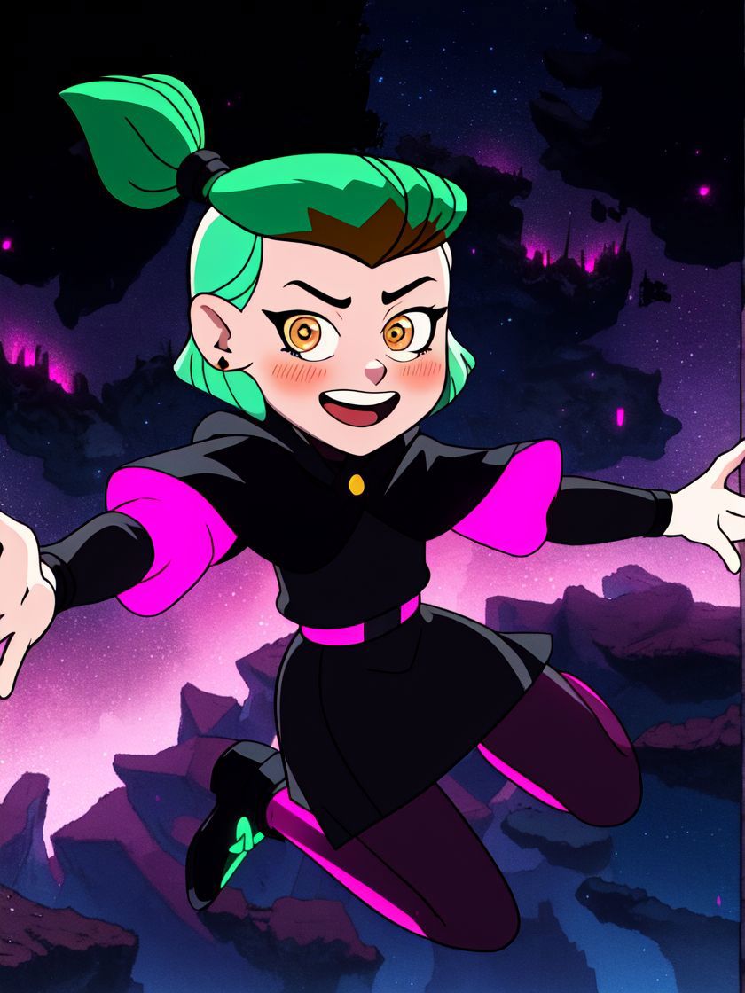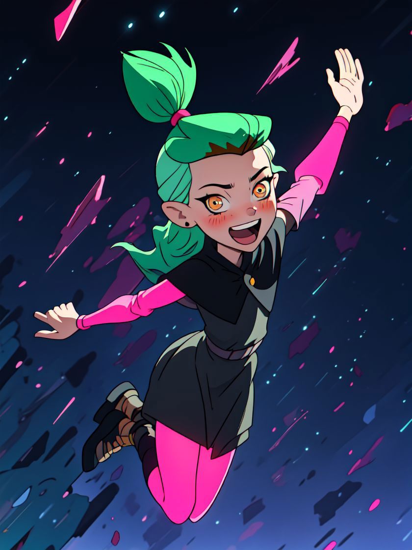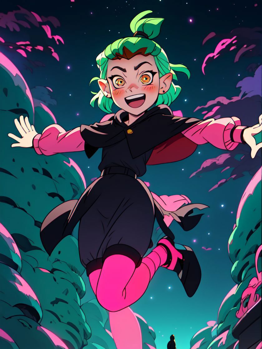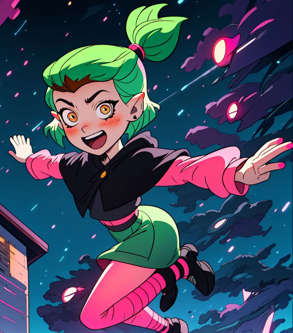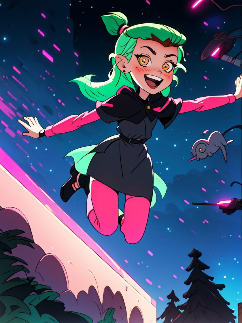 AmityS1, green hair, yellow eyes, ponytail, pink sleeves, pink legwear, black capelet, black footwear.