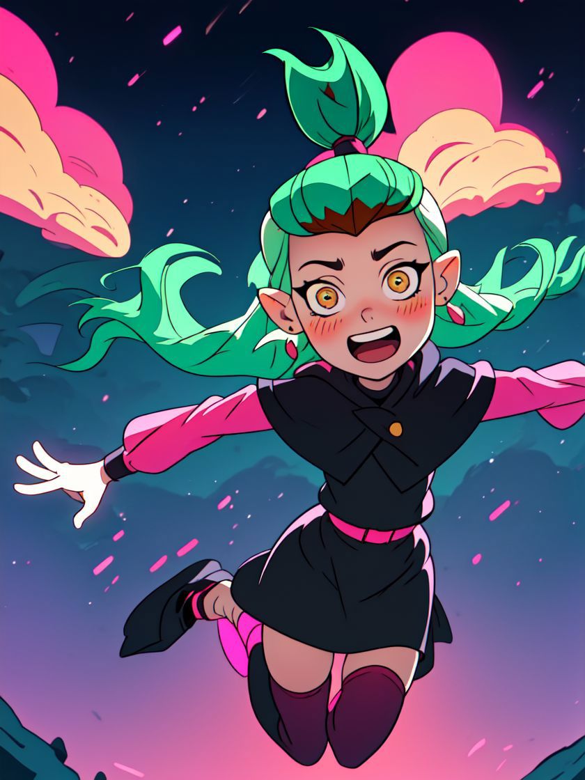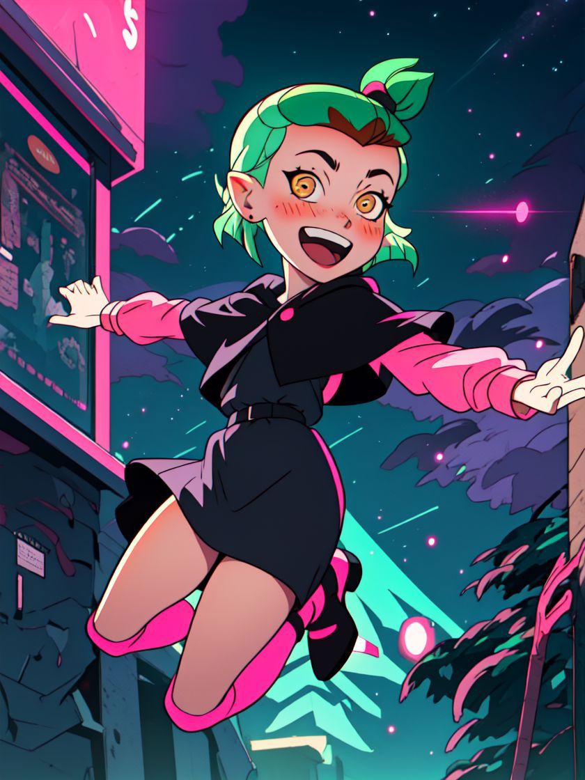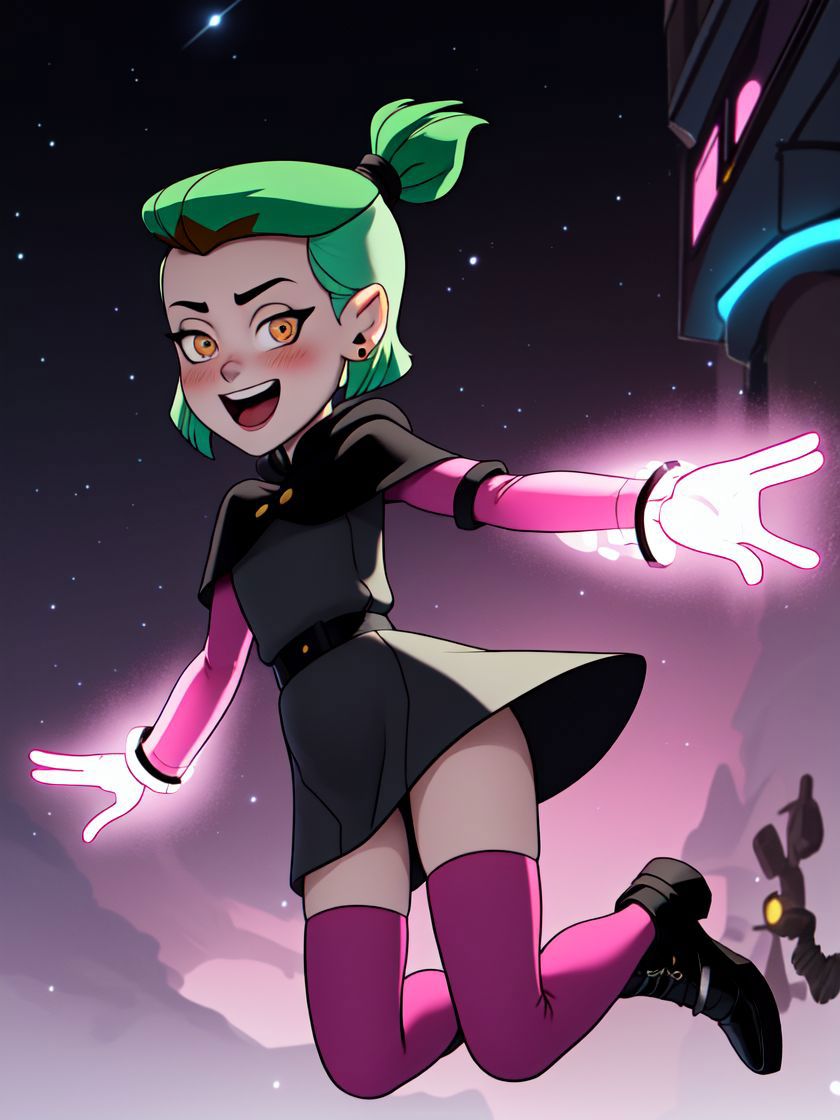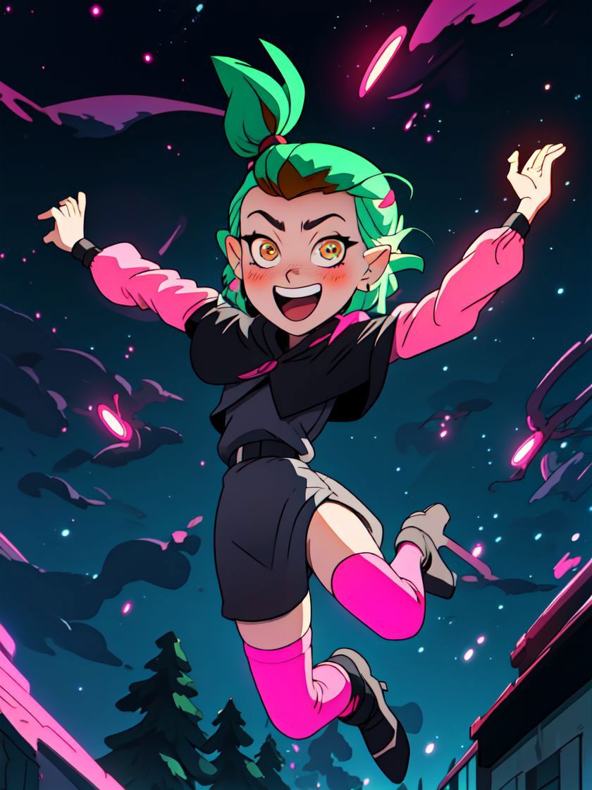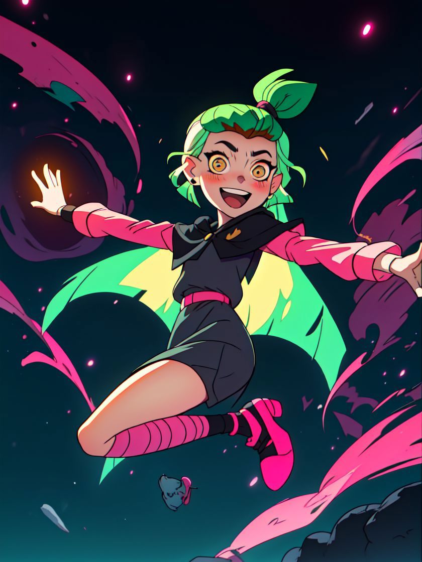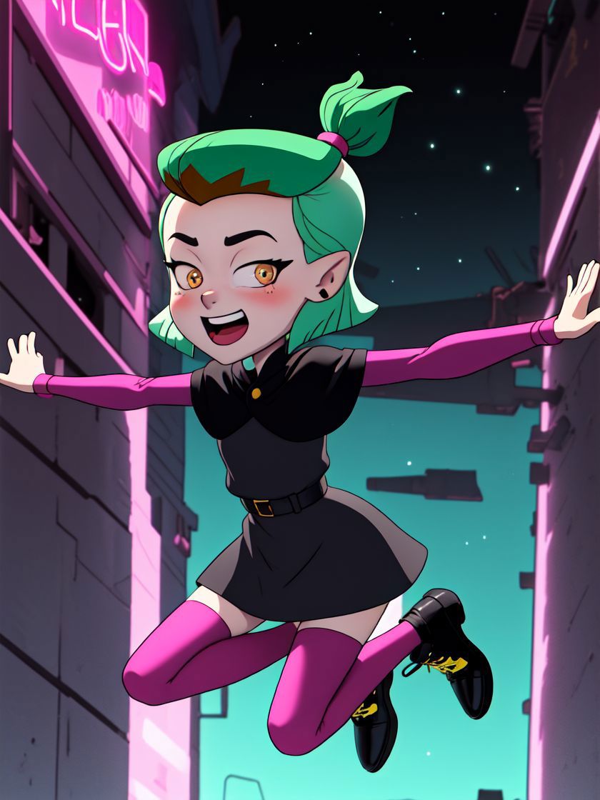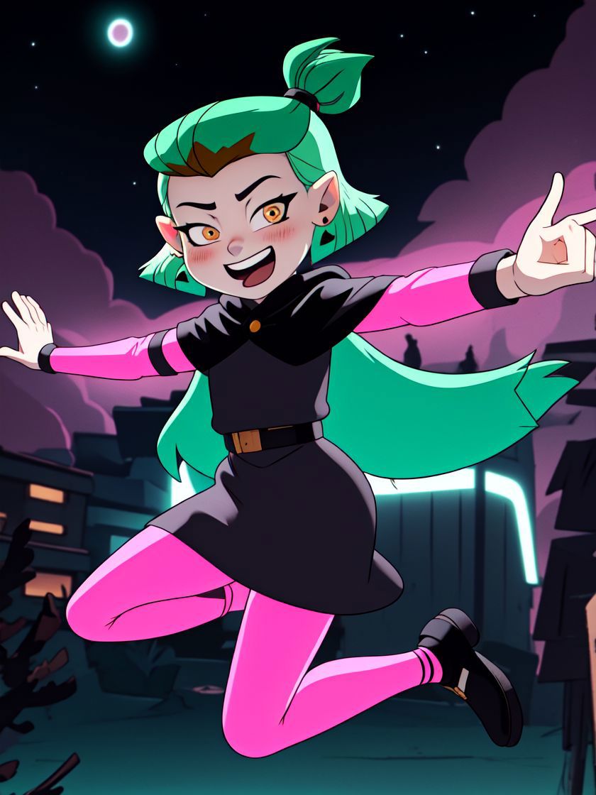 AmityS1, green hair, yellow eyes, ponytail, pink sleeves, pink legwear, black capelet, black footwear.