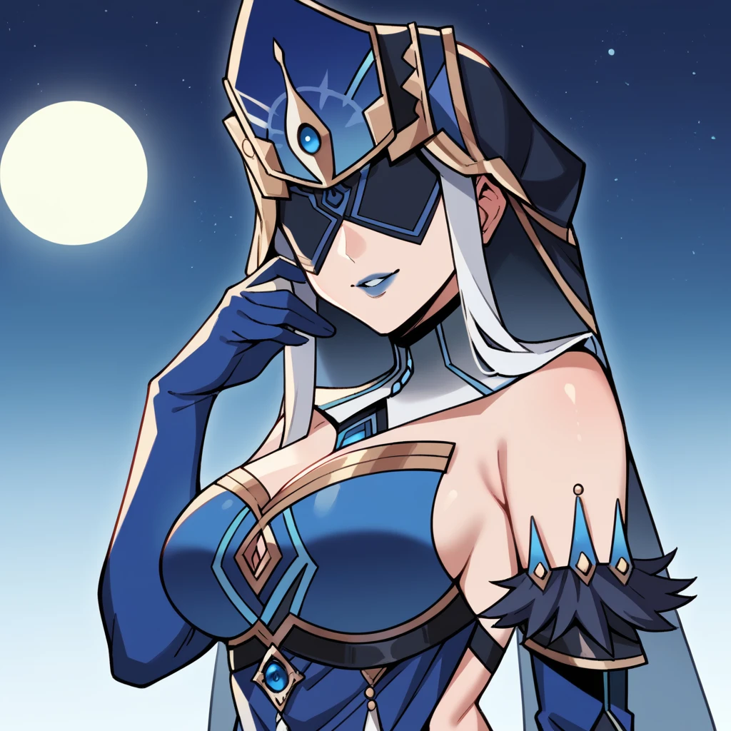 Maiden, covered eyes, eye mask, blue lips, makeup, hood on, blue headwear,The Outfit: