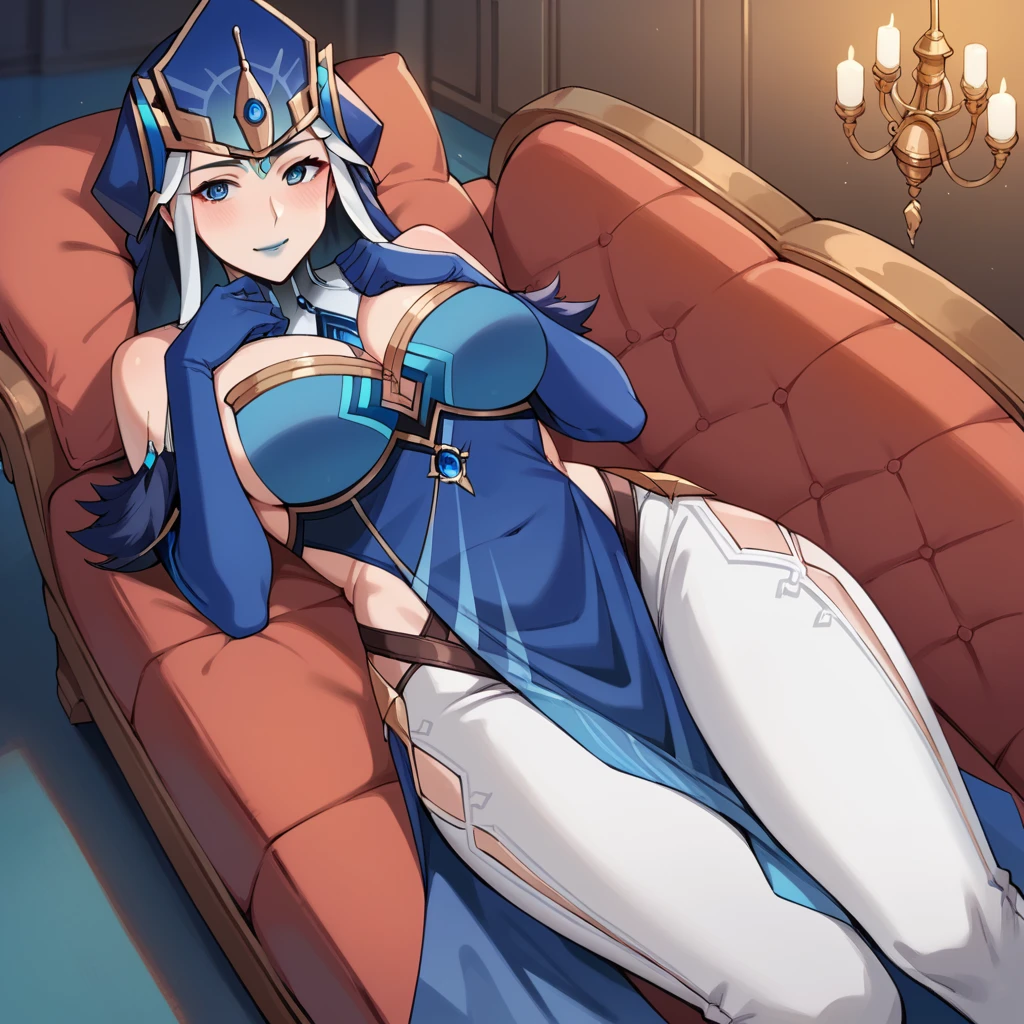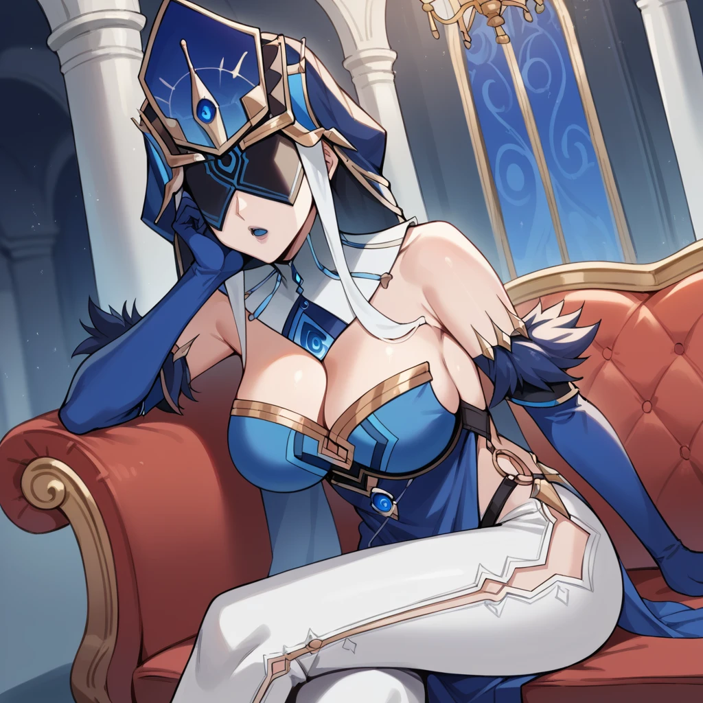 blue dress, detached collar, cleavage, strapless dress, sleeveless, detached sleeves, blue sleeves, fur-trimmed sleeves, blue gloves, elbow gloves, gem, pelvic curtain, white pants, side cutout, jewelry, gold trim, sideboob, P.S: I've included no fan-made images with her face unmasked, so do what you want with her eye color, hair color, etc. if you wish to remove her mask/hood. My sample image shows what you will get without the mask and no additional prompts.