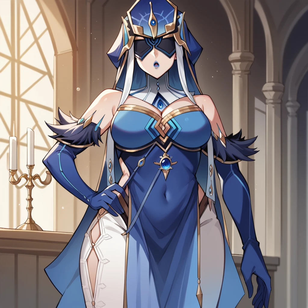 MrrMaidenGI, veil, hood, blindfold, mask, covered eyes, blue gem, lipstick, white stole, halterneck, cleavage, sleeveless dress, white gorget, turtleneck, dark blue dress, blue headwear, light blue trim, detached sleeves, fur-trimmed sleeves, black sleeves, blue gloves, elbow gloves, gradient gloves, bare shoulders, side cutout, white pants, gradient pants, gradient pelvic curtain, leg cutout, clothing cutout, hip vent, gold trim, jewelry, o-ring, thigh cutout, belt, ankle boots, black footwear,Mirror Maiden v1.0 (Pony)