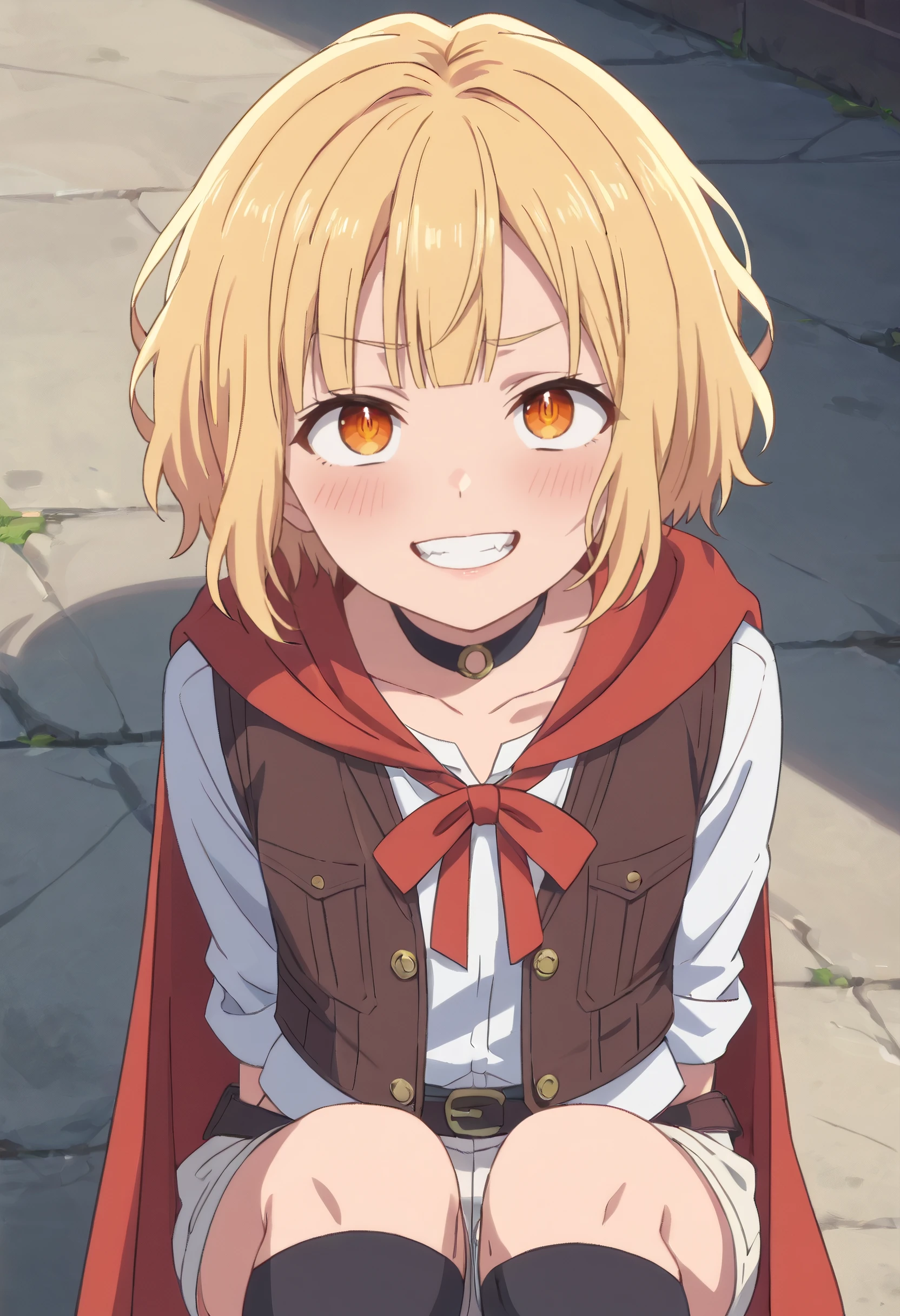 ReezeJacket, short hair, shirt, choker, long sleeves, collarbone, jacket, black choker, skirt, thighhighs, cape, shorts, white shorts, black legwear, black cape, red ribbon, ribbon, vest, neck ribbon,