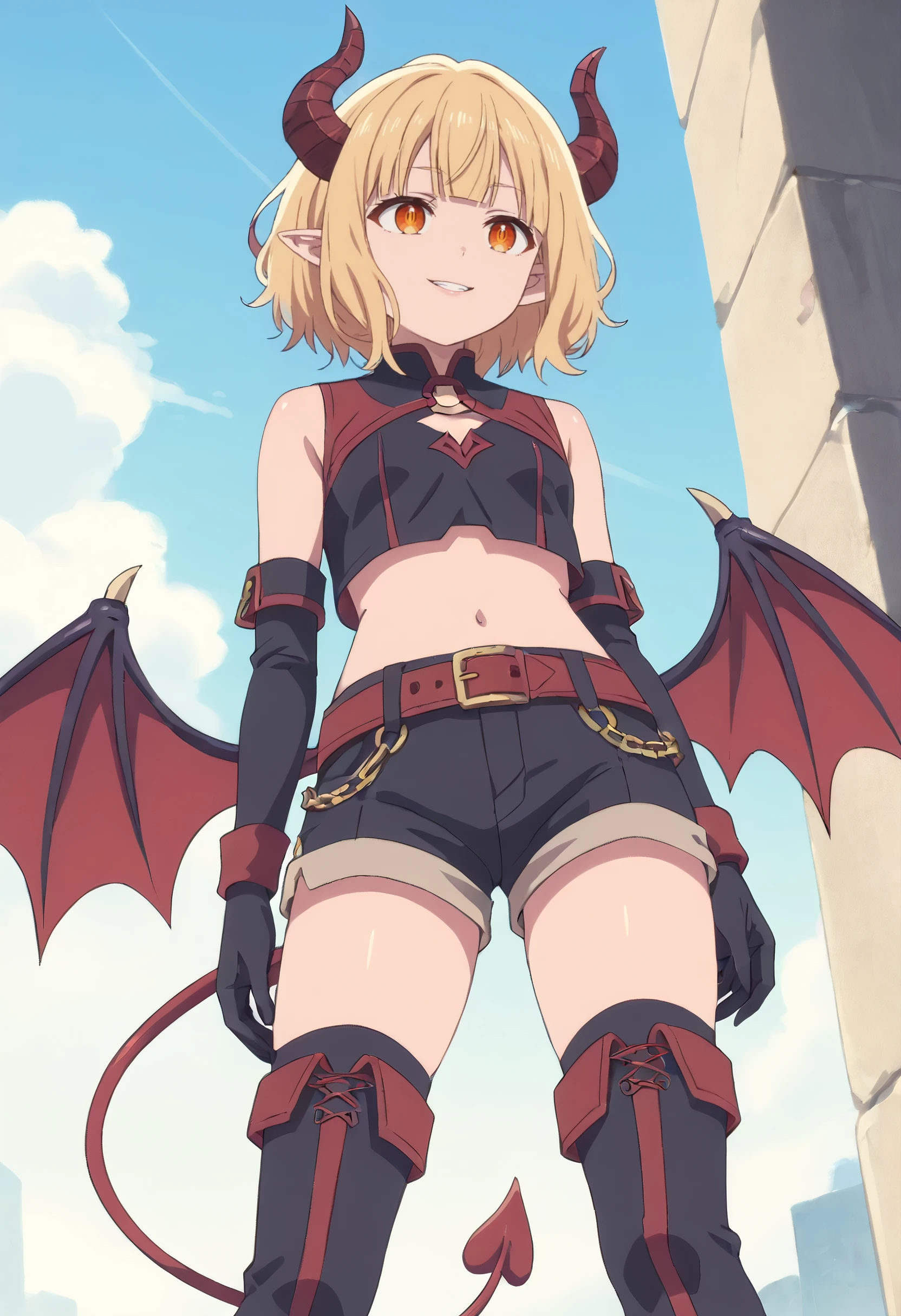 ReezeTransformed, short hair, gloves, horns, wings, pointy ears, demon wings, midriff, bat wings, navel, demon horns, red wings, demon girl, black gloves, belt, demon tail, tail, crop top, fang, shorts, low wings, boots, thighhighs,