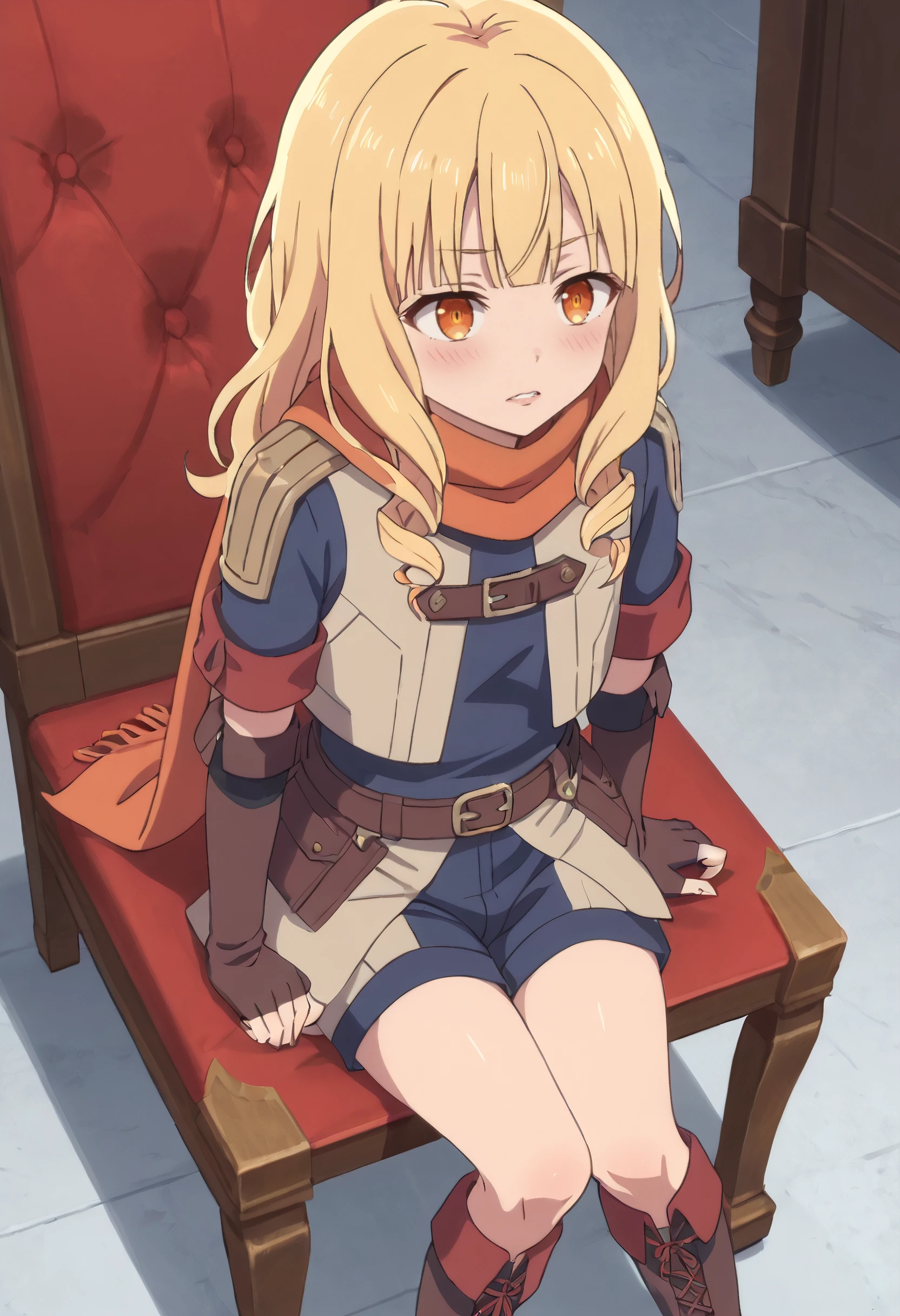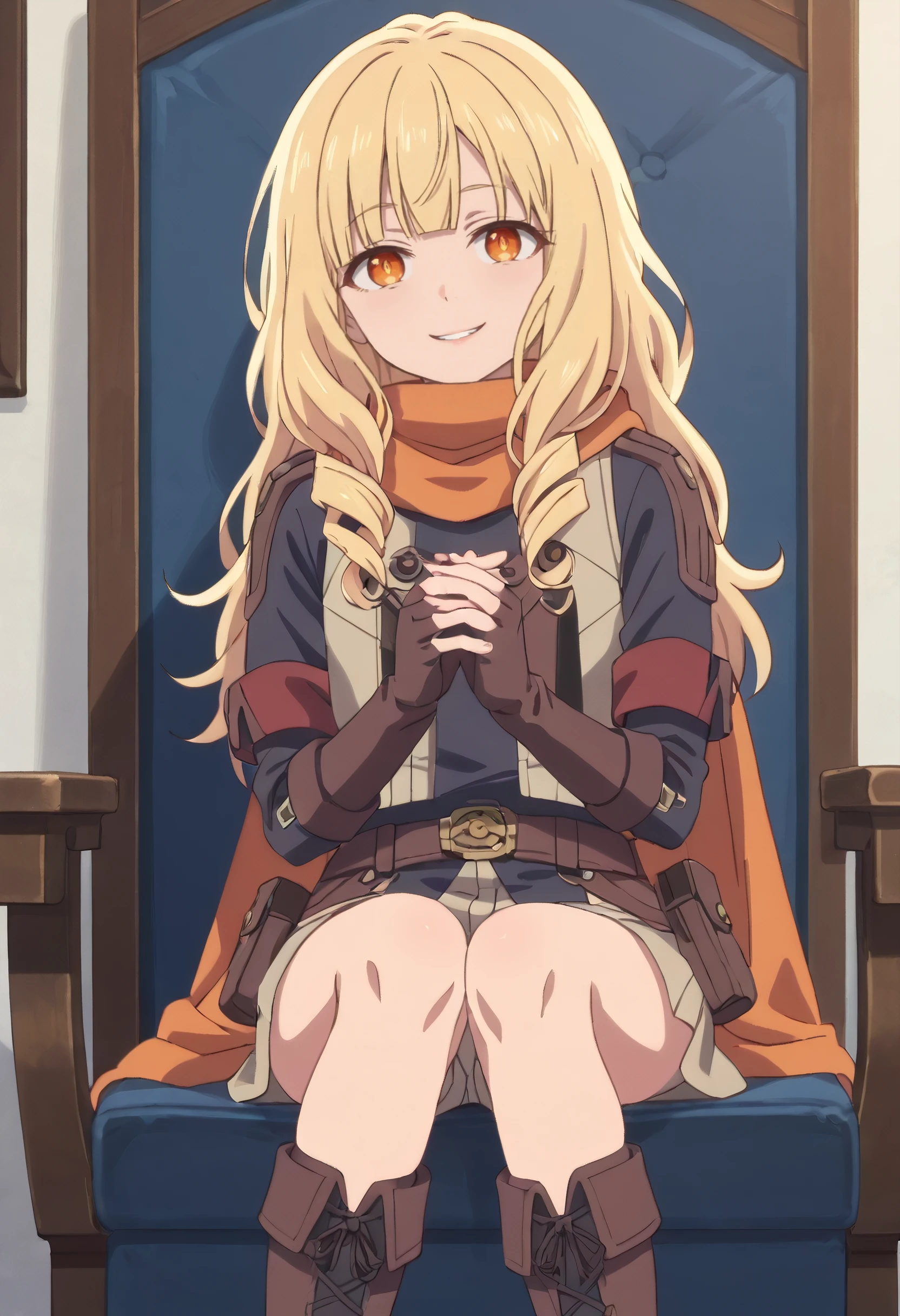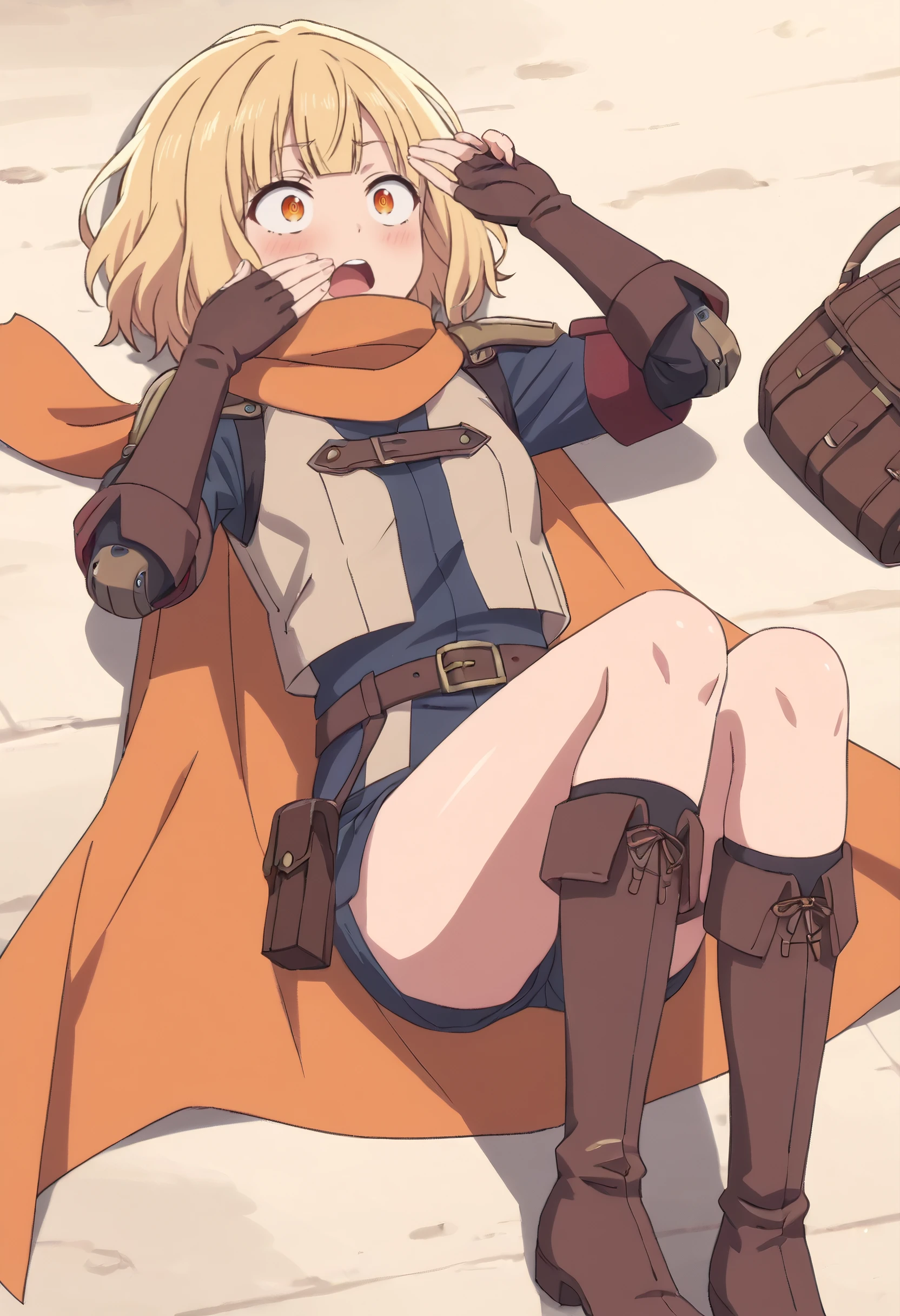ReezeShortHairArmor, short hair, scarf, gloves, long sleeves, shirt, thighhighs, skirt, jacket, fingerless gloves, belt, orange scarf, cape, boots, elbow gloves, military, coat, shorts, military uniform,