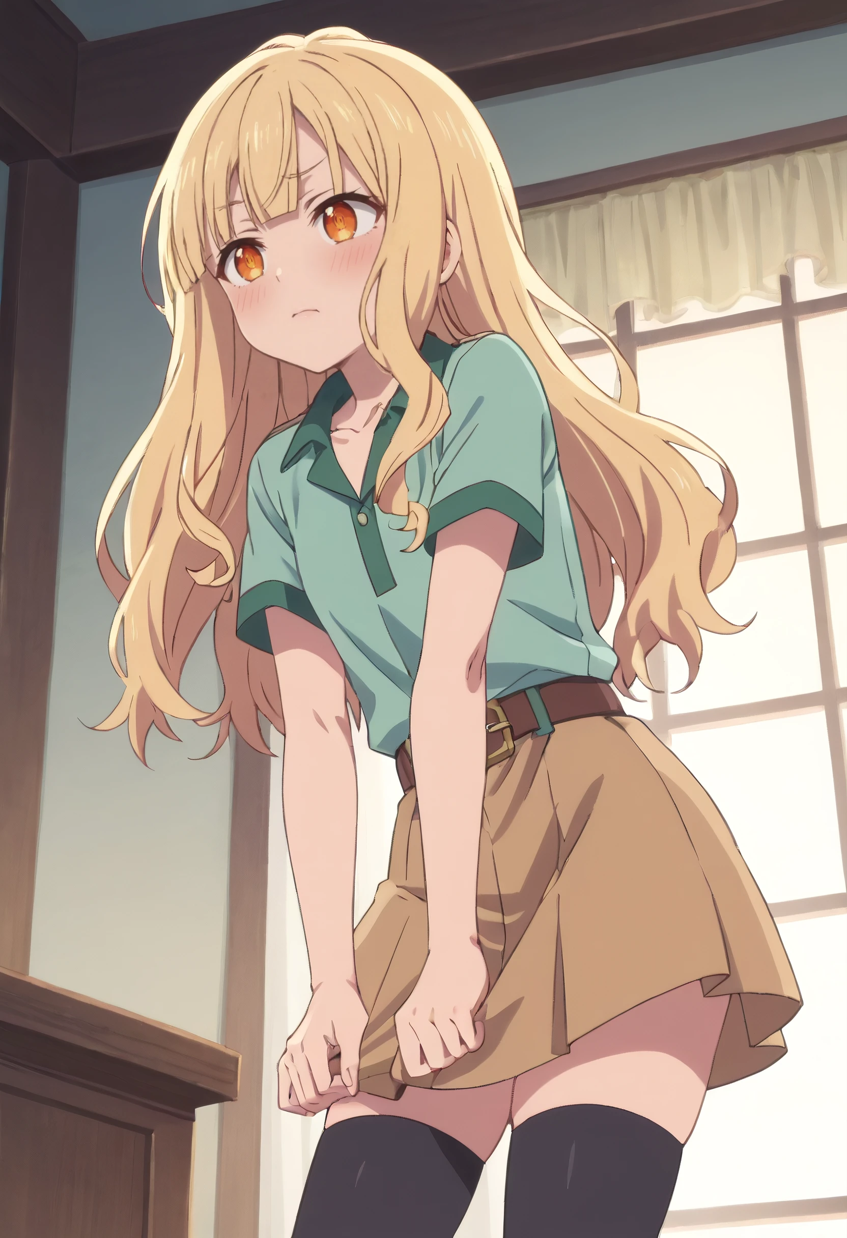 ReezeDress, short sleeves, shirt, belt, green shirt, skirt, brown belt, collared shirt, dress, thighhighs, collarbone, black legwear,