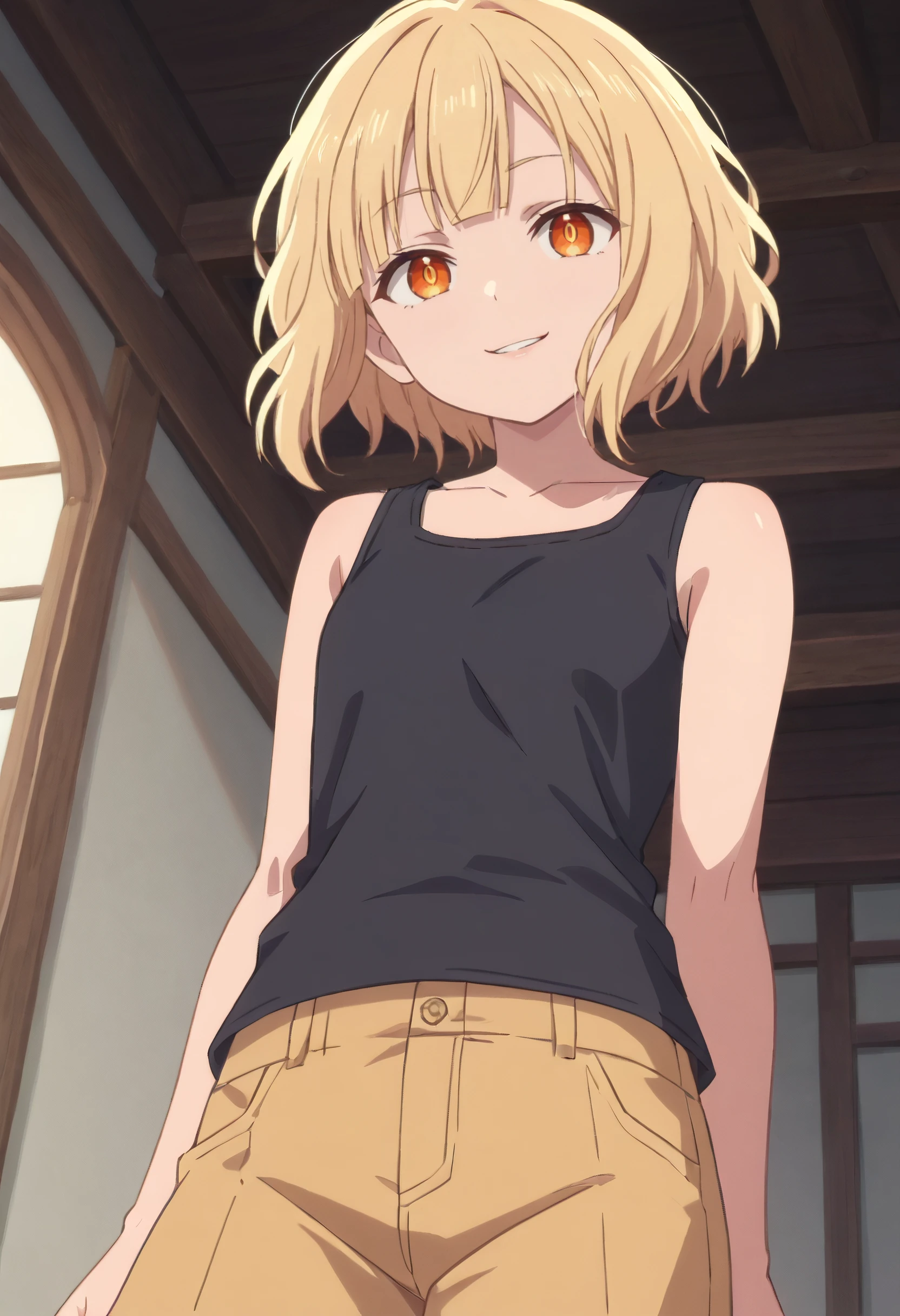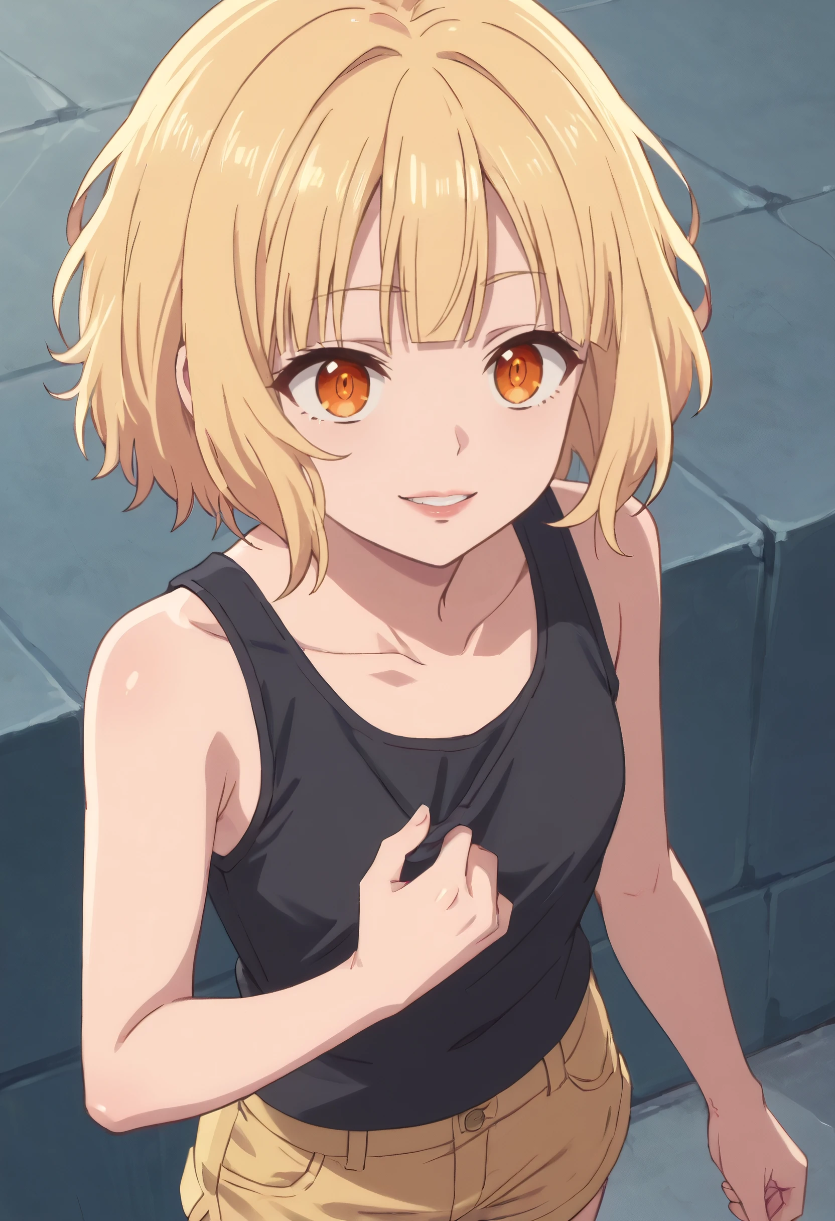 ReezeTanktop, short hair, shirt, tank top, bare shoulders, sleeveless, collarbone, black shirt, bare arms, shorts, sleeveless shirt, black tank top,