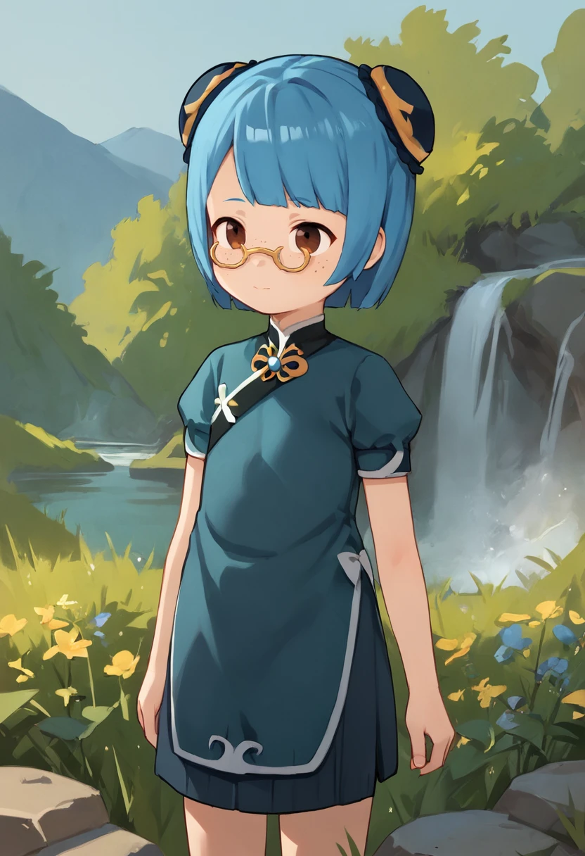 blue hair, short hair, hair bun, double bun, hair ornament, bun cover, brown eyes, glasses, yellow-framed glasses
