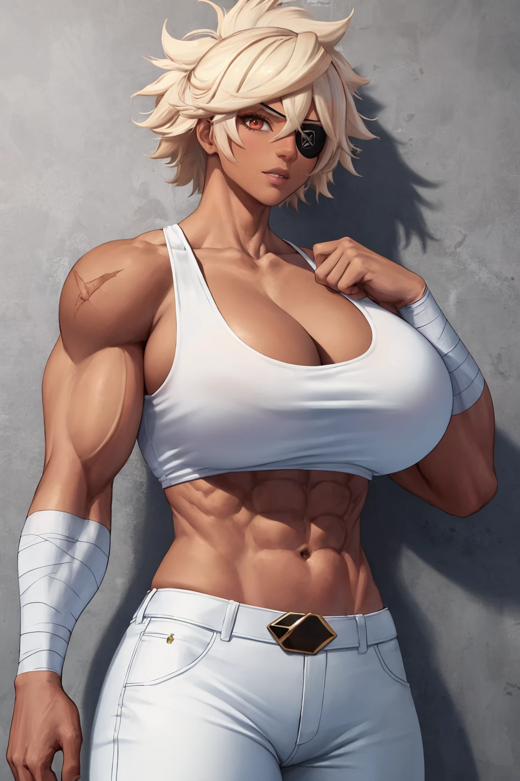 debdia, eyepatch, muscular female, dark-skinned female, huge breasts, cleavage, crop top, white pants, bandages, scar