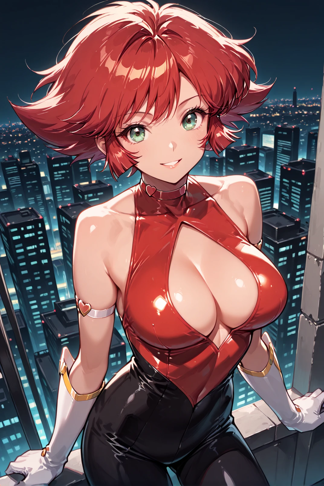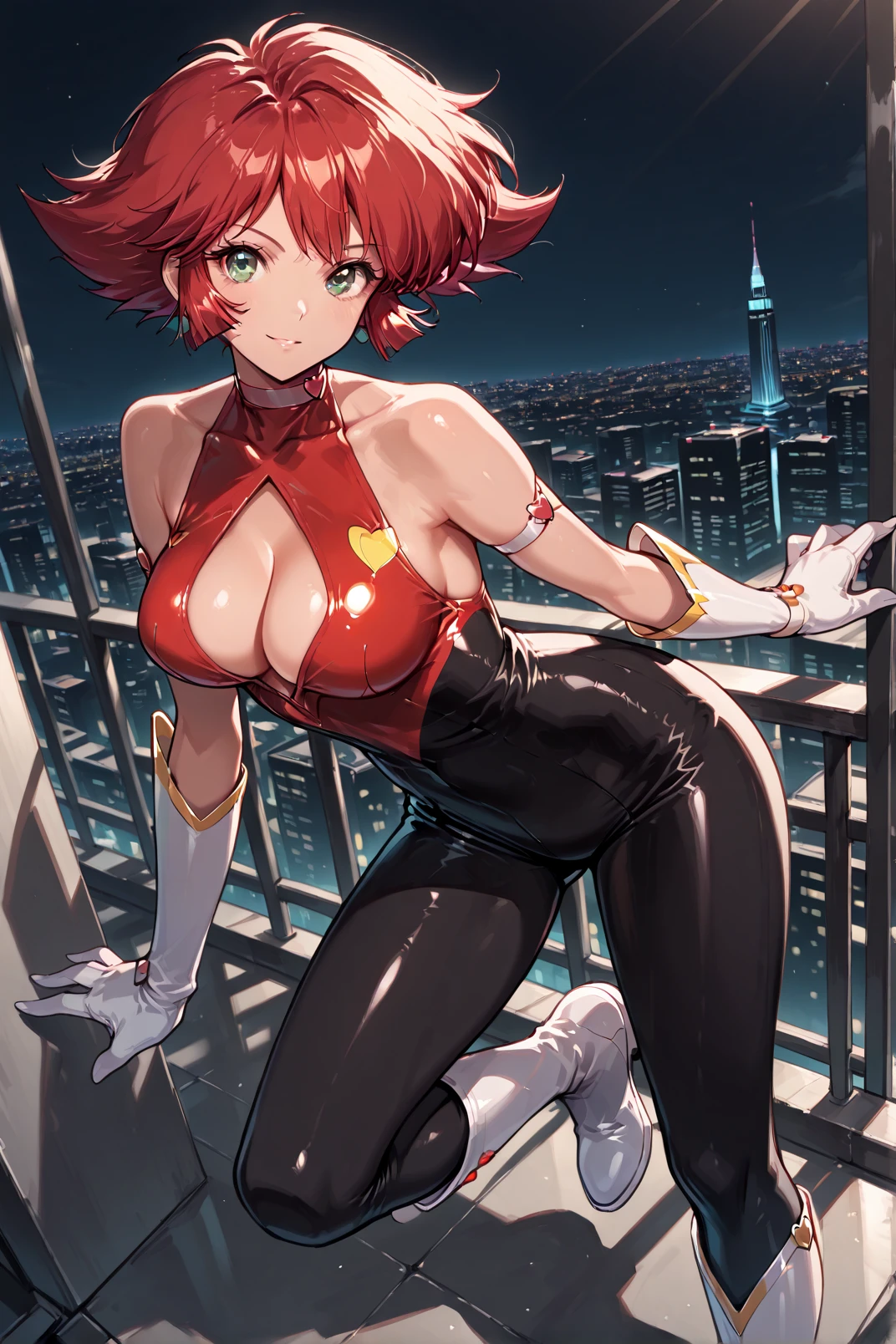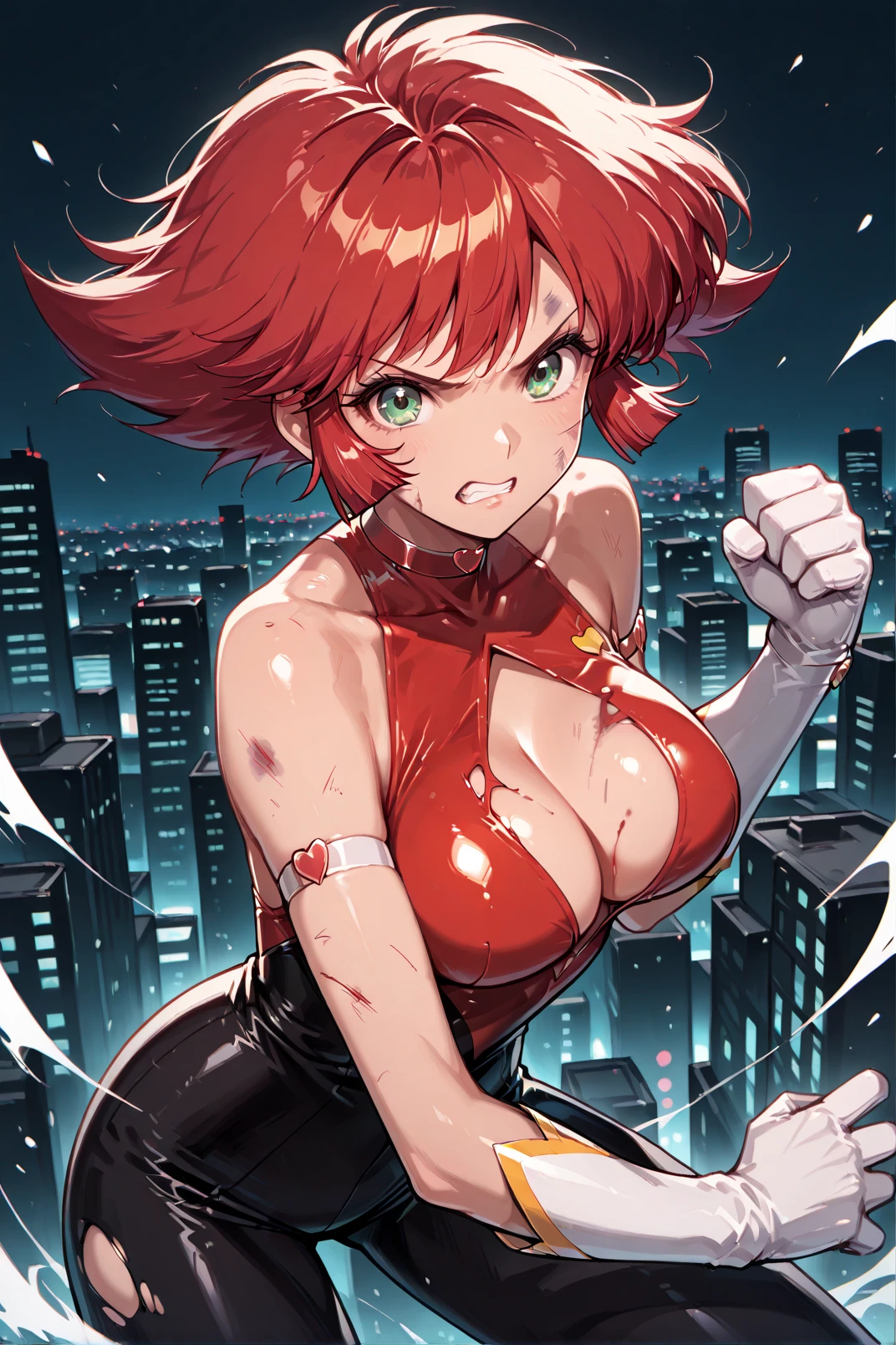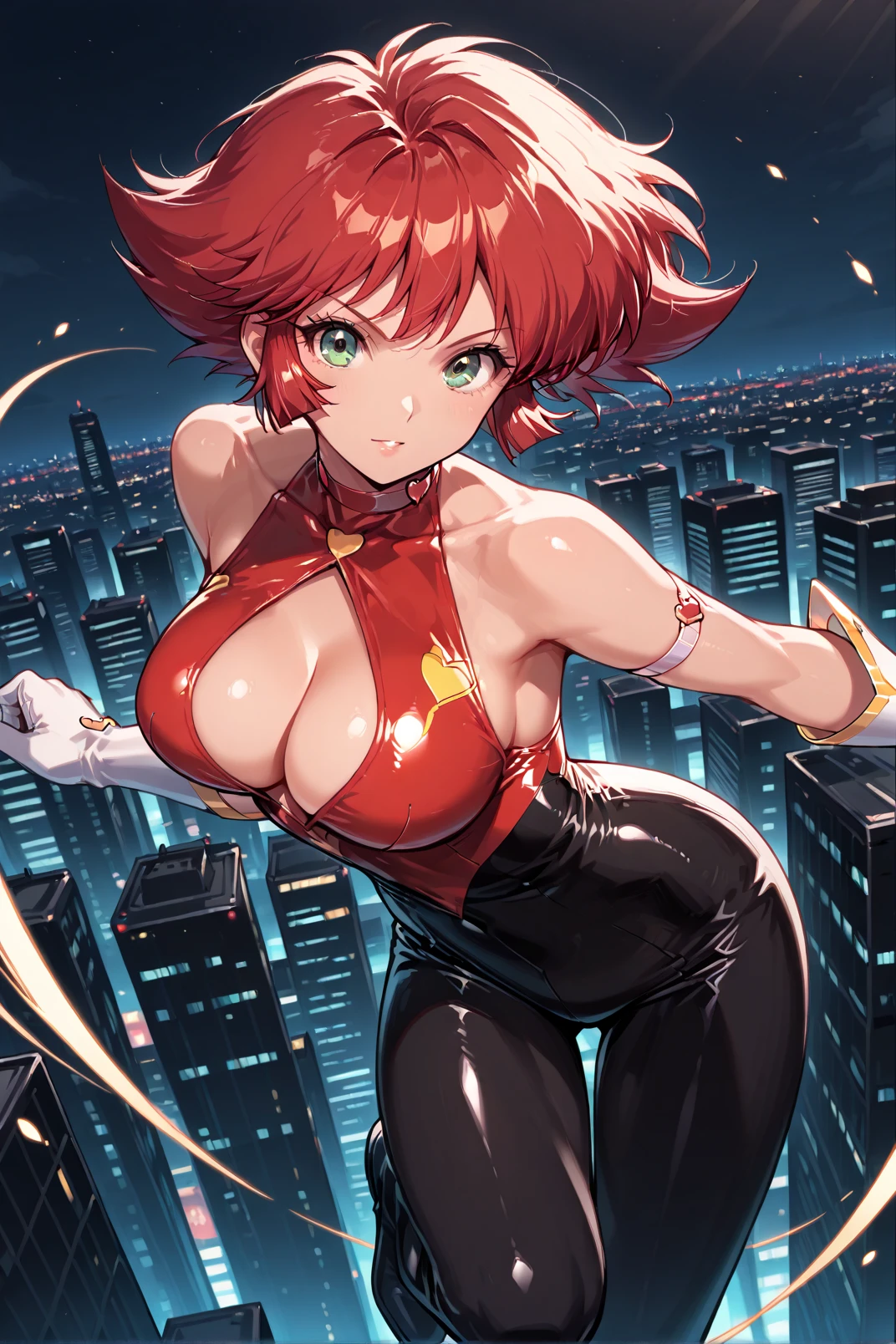 cutie_honey, red hair, short hair, green eyes, body suit, white gloves