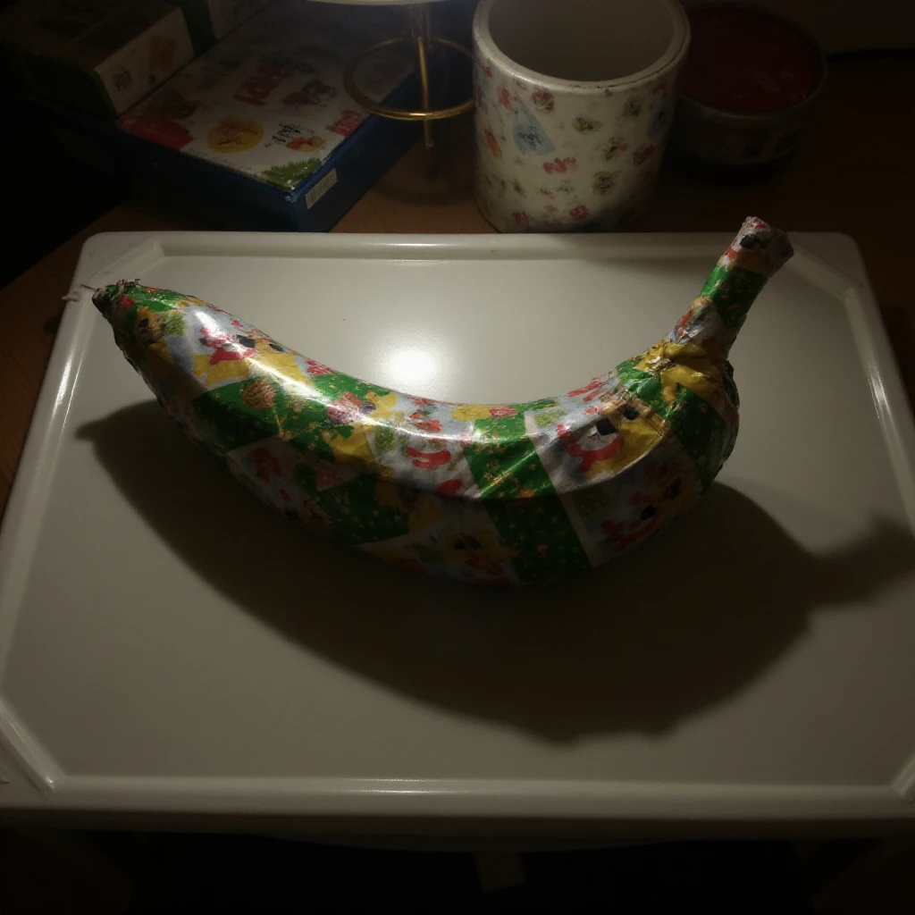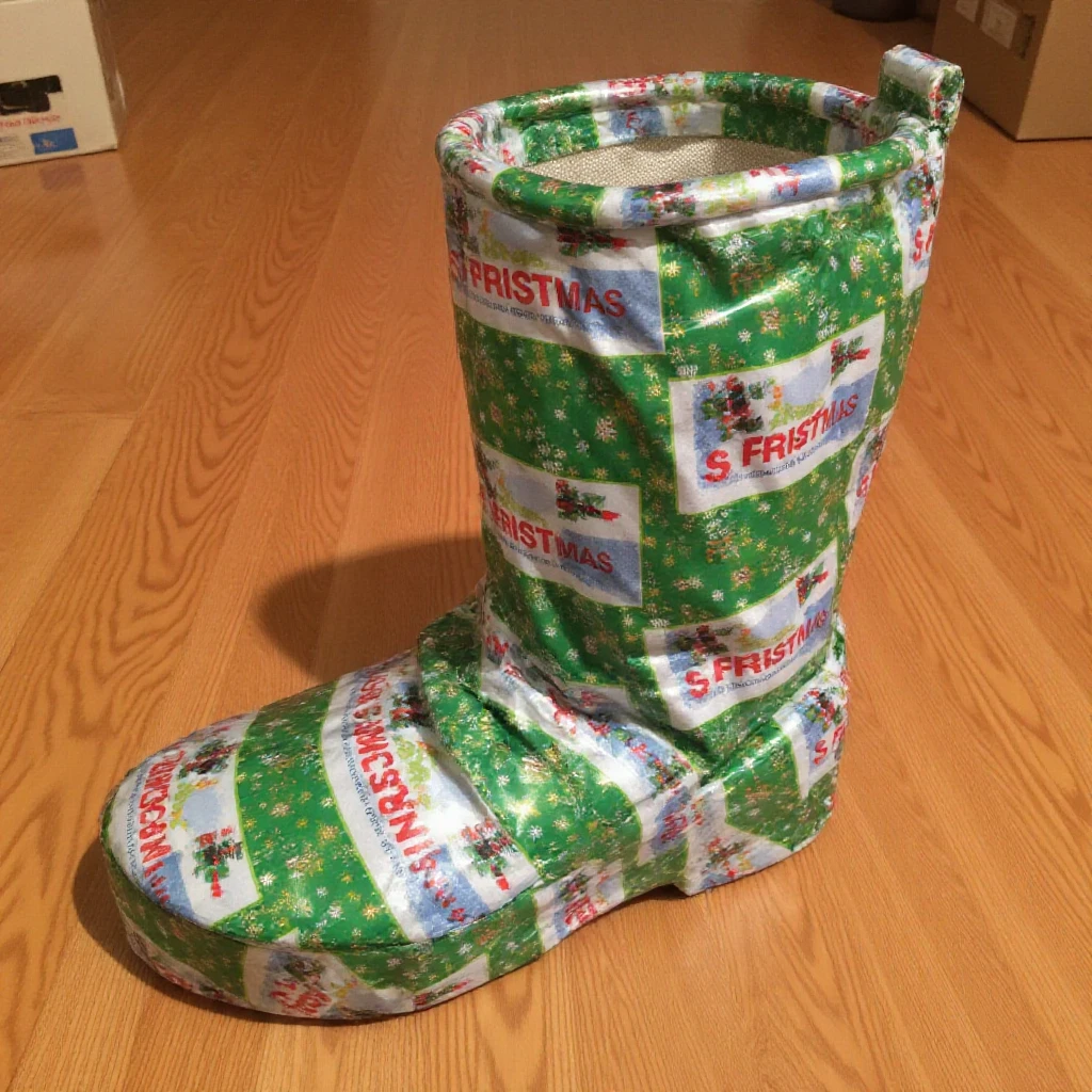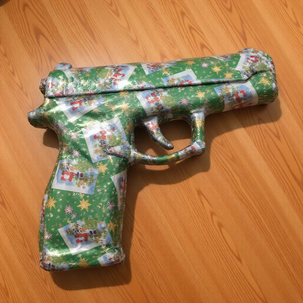 a (dimly/well) lit (high/low) photograph of a ff-gift (item/object) wrapped for christmas. it is on (surface).