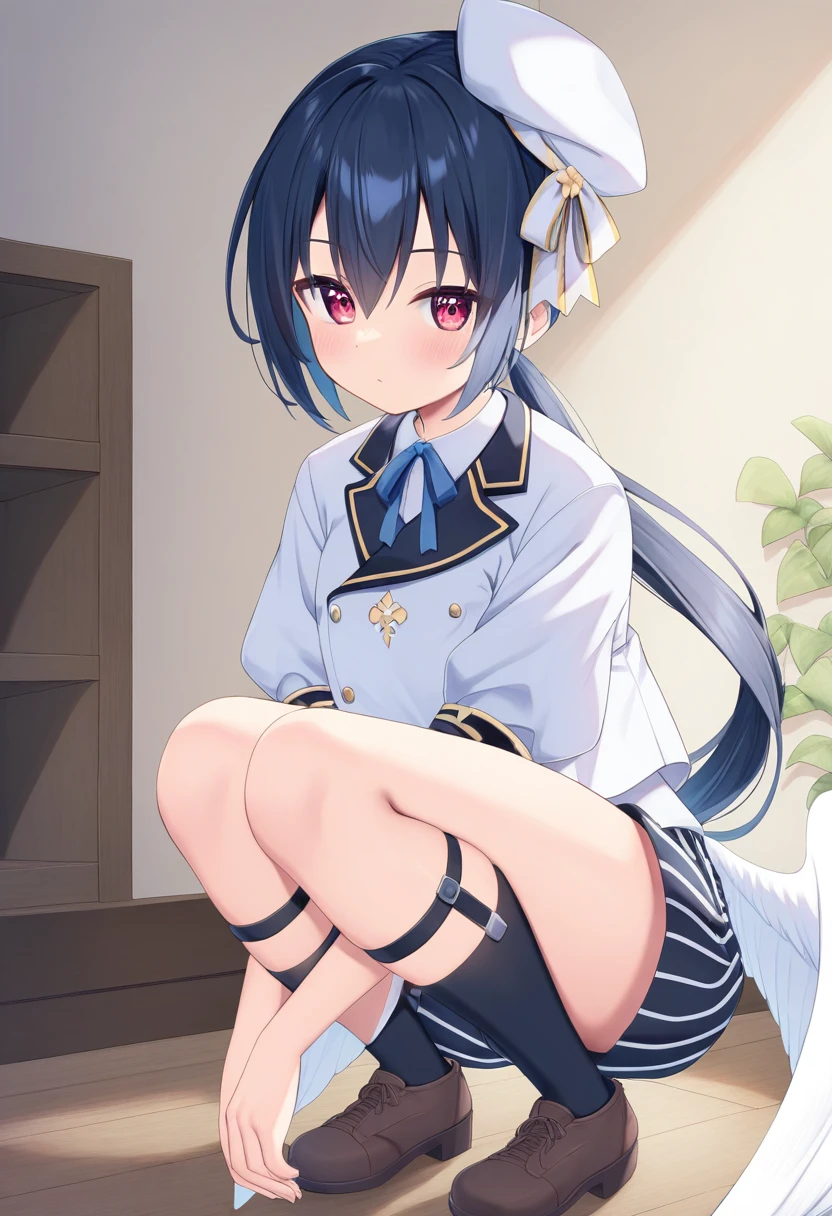 azuri(maimai), 1girl, aged down, short hair, white shirt, black hair, short sleeves, red eyes, white beret, hat ribbon, white ribbon, neck ribbon, blue ribbon, hair between eyes, tied long hair, low ponytail, collared shirt, white uniform, white jacket, double-breasted, black shorts, vertical-striped shorts, black socks, legwear garter, black kneehighs, puffy sleeves, puffy short sleeves, buttons, brown footwear, tilted headwear, feathered wings, white wings, hat ribbon, collared jacket, shorts ribbon