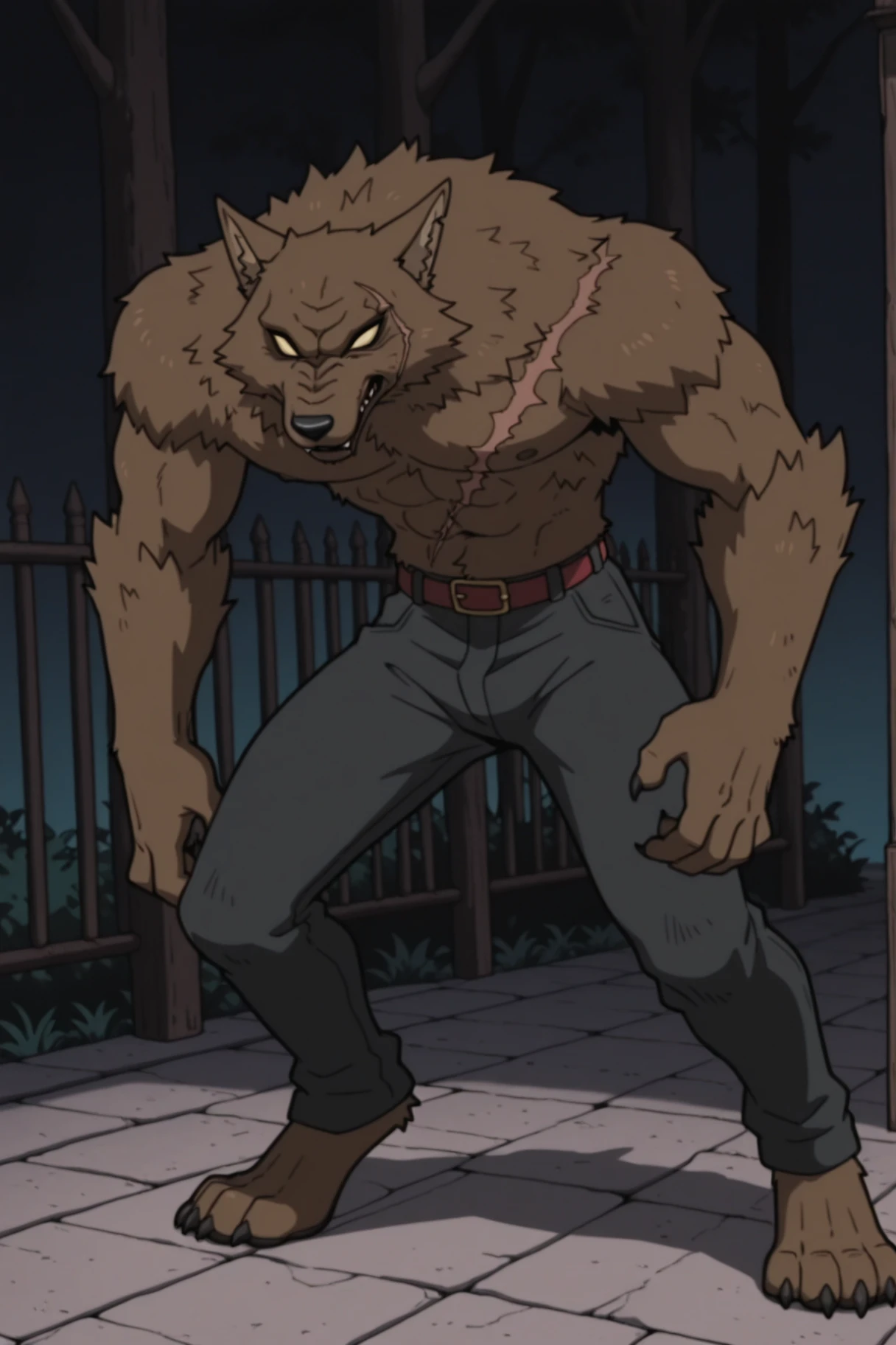 Trigger word: 4l3c, werewolf, brown fur, colored sclera, no pupils, scar across body, scar on face, Clothes:black pants,