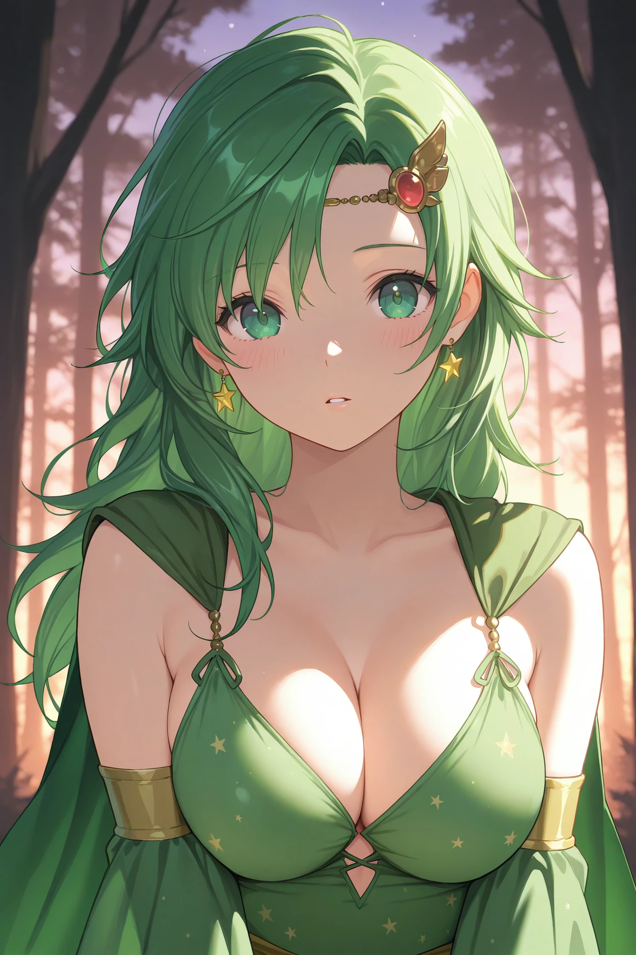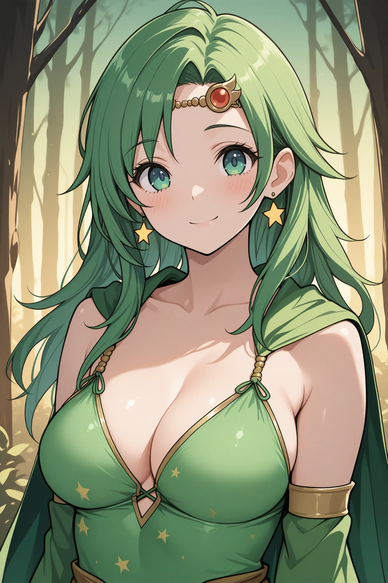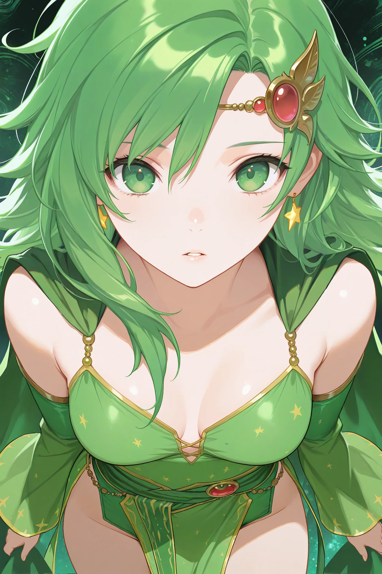 Add "hair ornament, circlet, star earrings, green cape, green dress, cleavage, pelvic curtain, green leotard, detached sleeves, bridal gauntlets, green thighhighs, thigh boots, high heel boots" for her typical look.