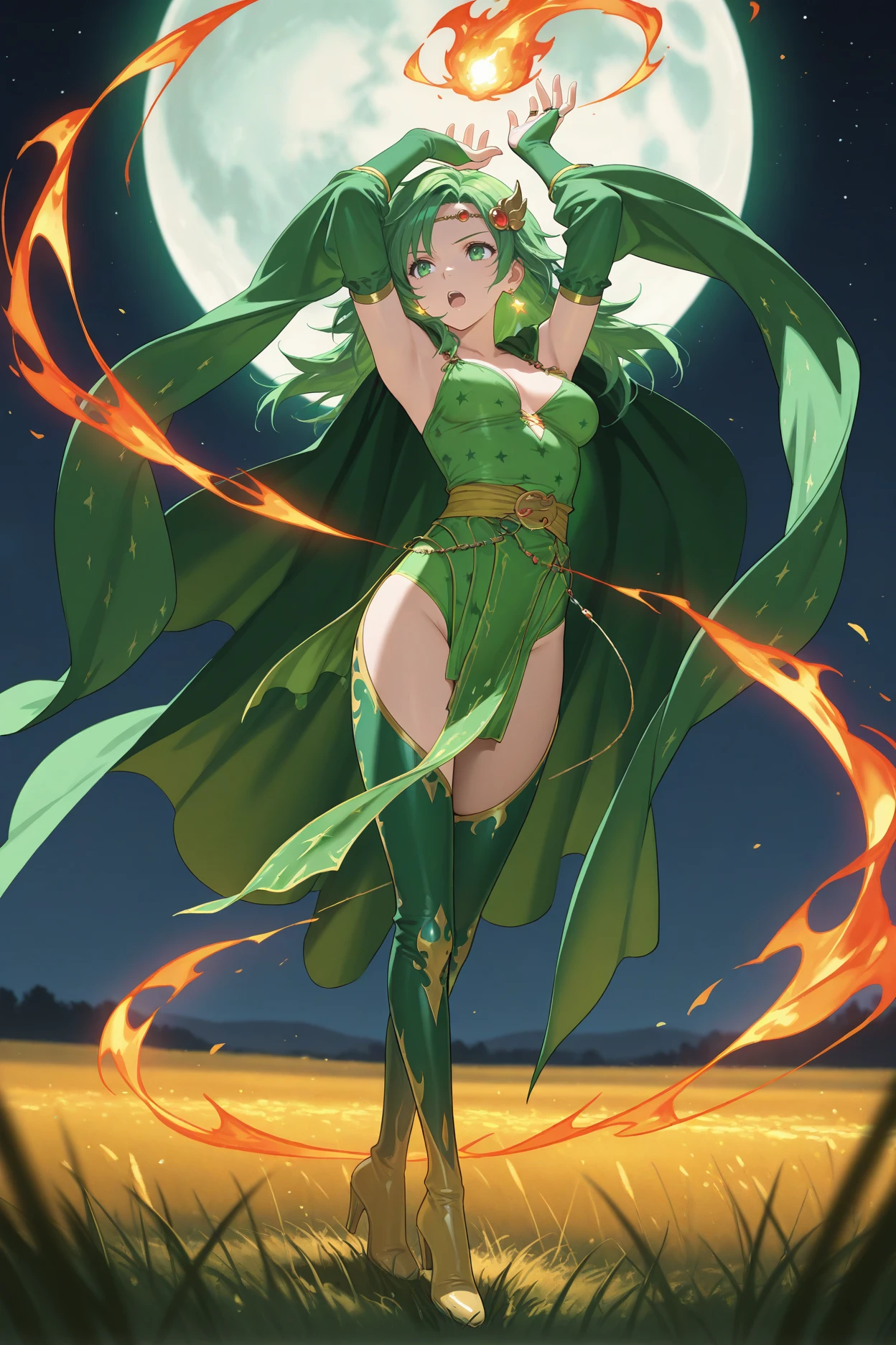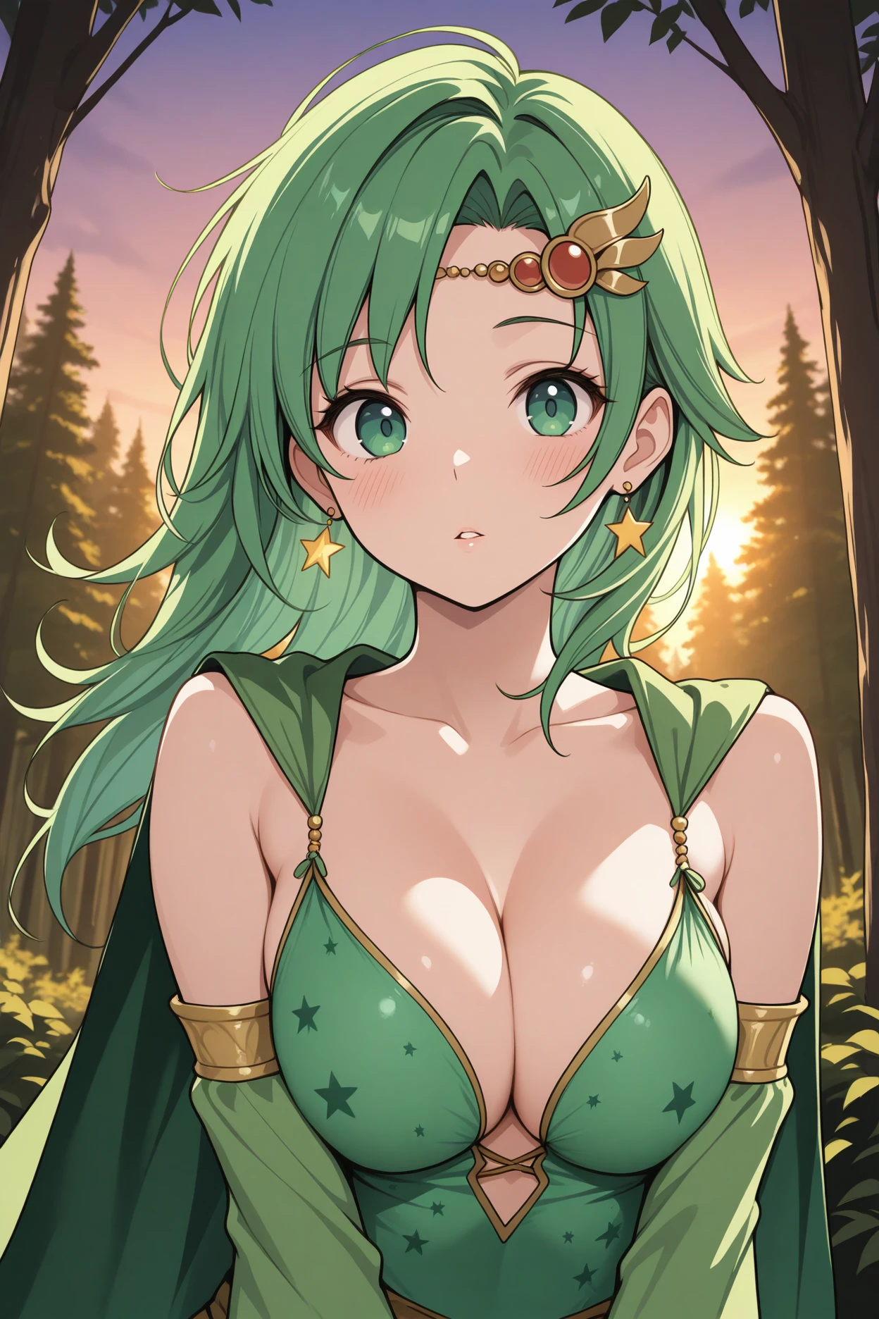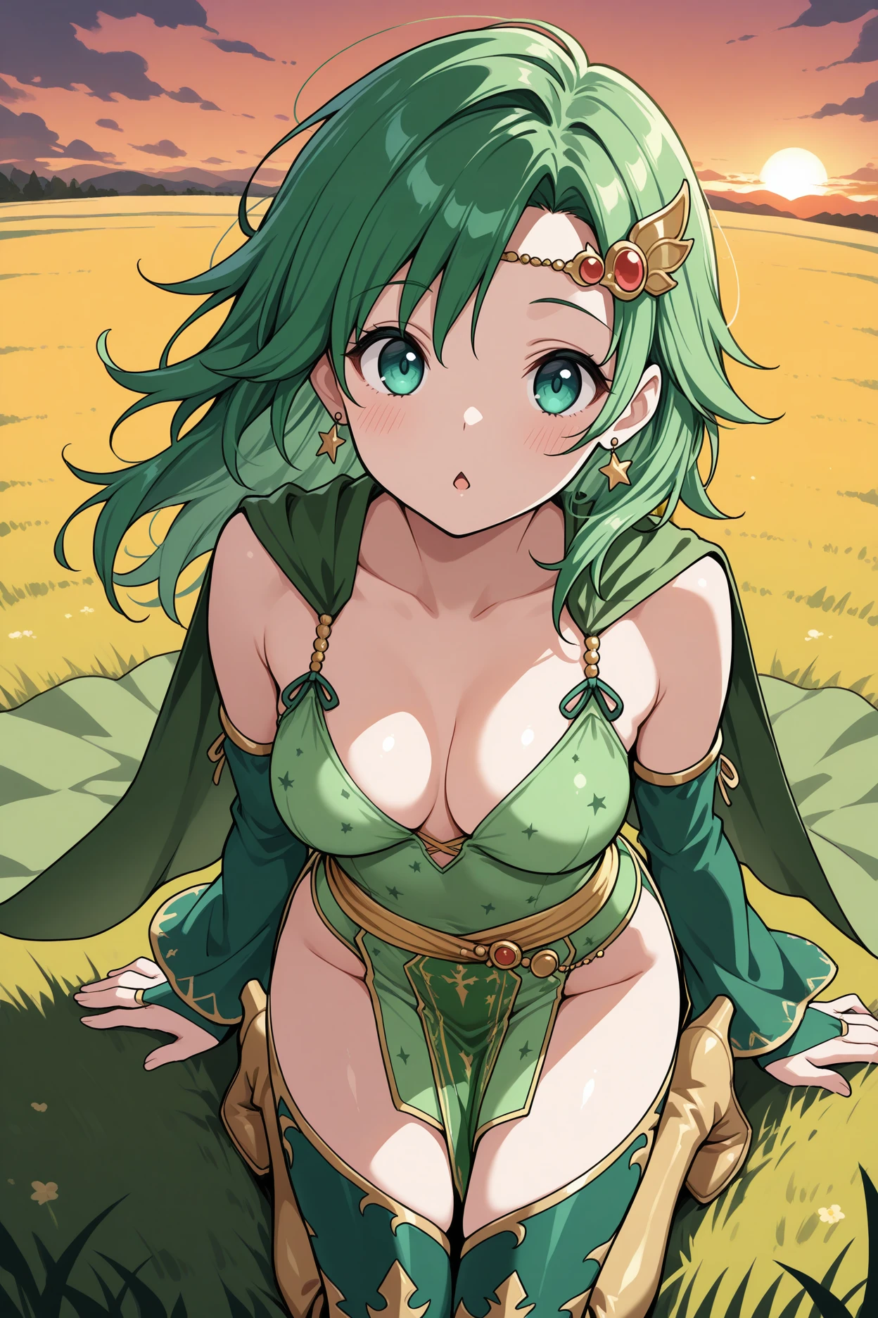 Add "hair ornament, circlet, star earrings, green cape, green dress, cleavage, pelvic curtain, green leotard, detached sleeves, bridal gauntlets, green thighhighs, thigh boots, high heel boots" for her typical look.