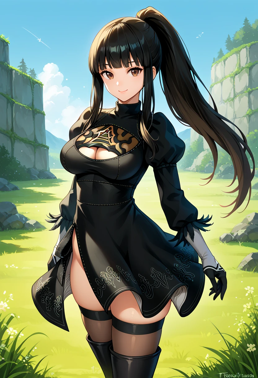 twobskirt, nier dress, cleavage cutout, skirt, thighhighs under boots
