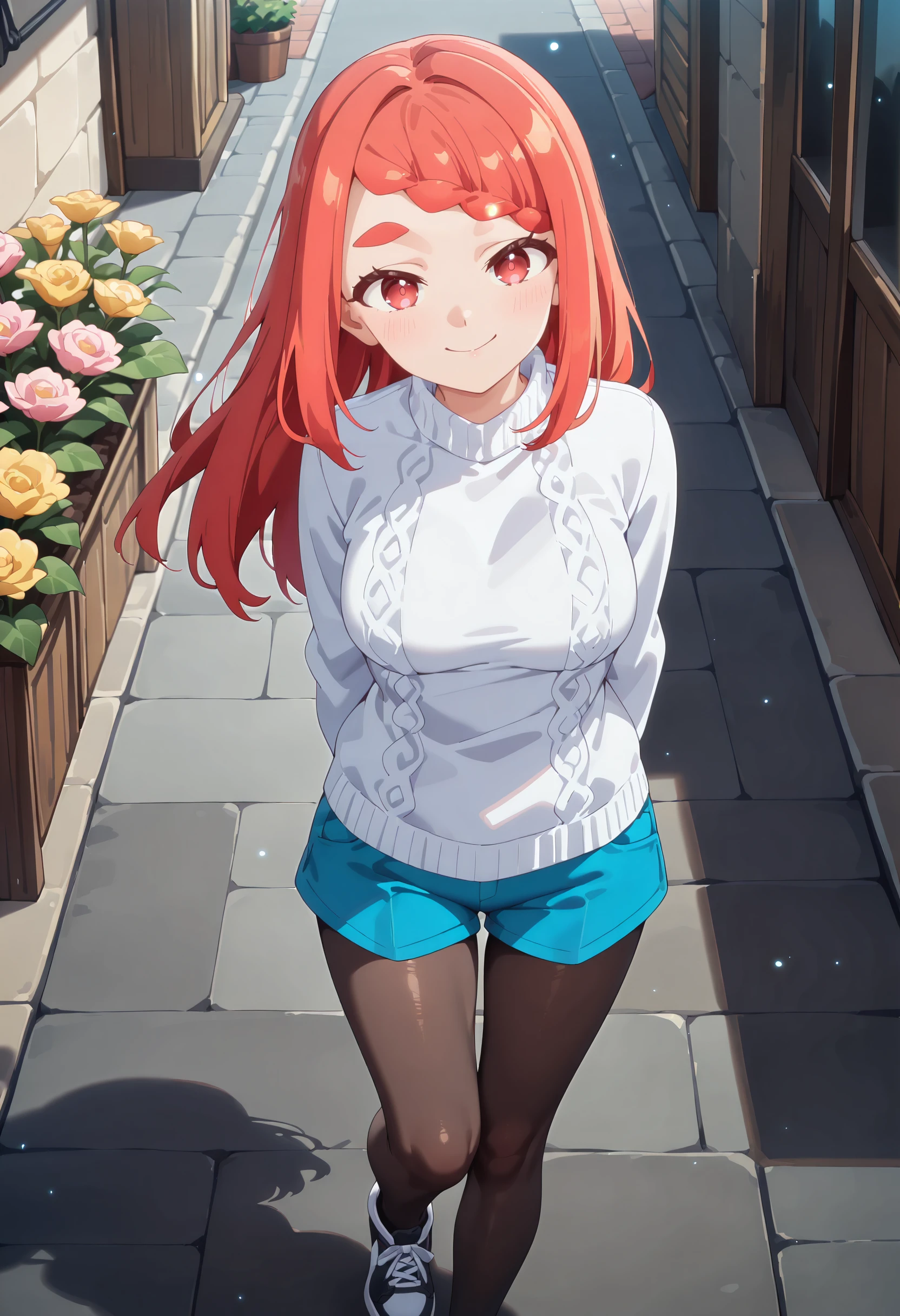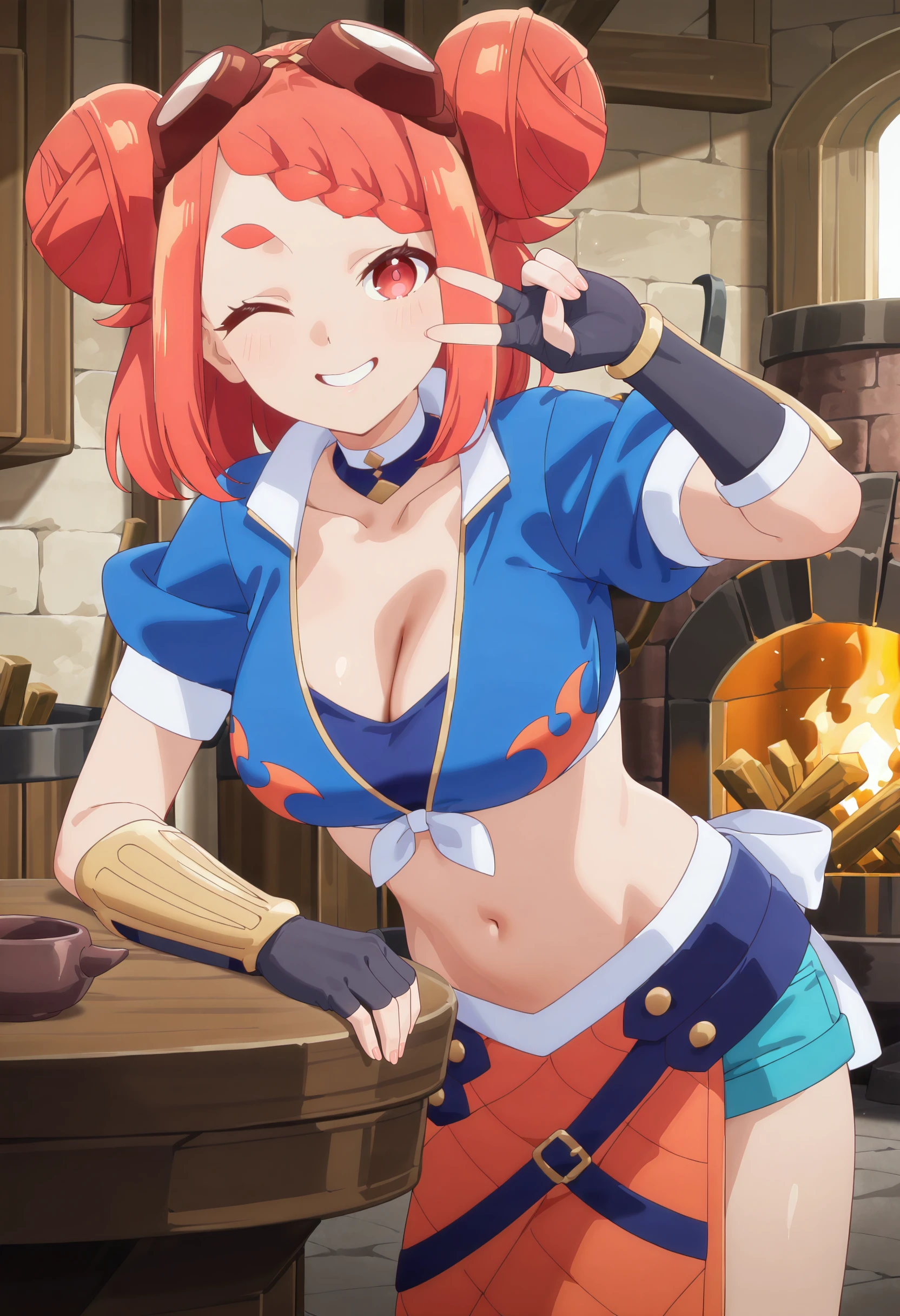 #1: goggles on head, blue choker, blue cropped jacket, blue tube top, black gauntlets, aqua shorts, orange apron, black boots — Use "goggles on eyes" instead if you want the goggles down