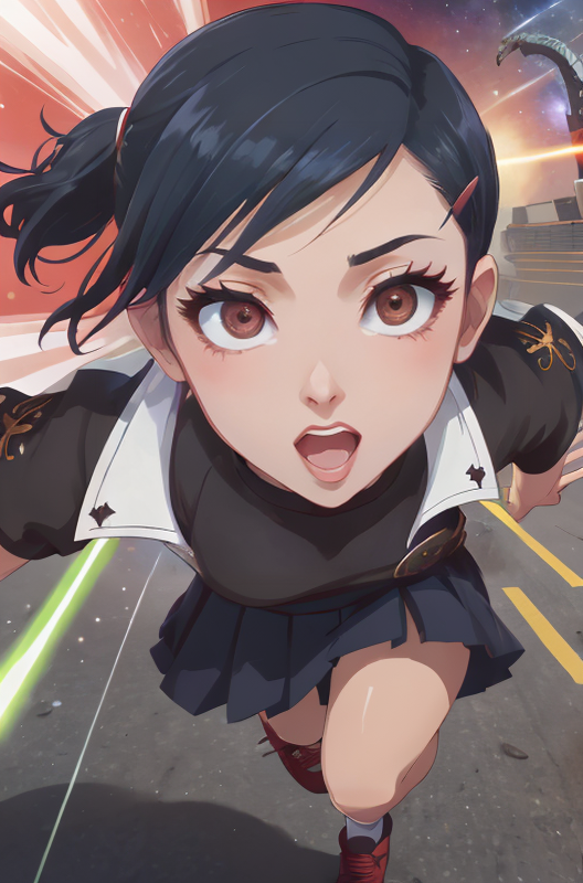 yukop3, short hair, hairclip, dark skin, brown eyes, black hair, gekkoukan high school uniform, skirt, socks, shoes