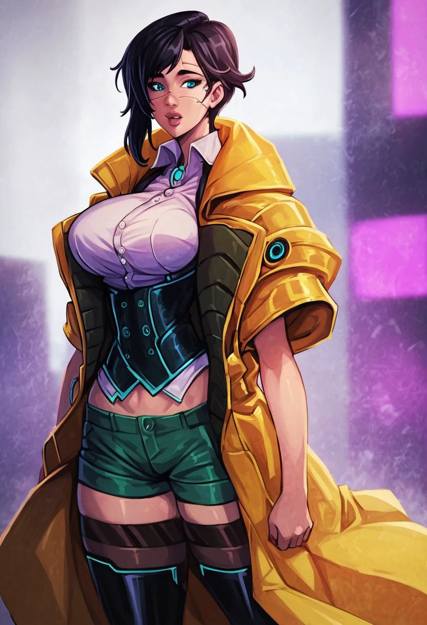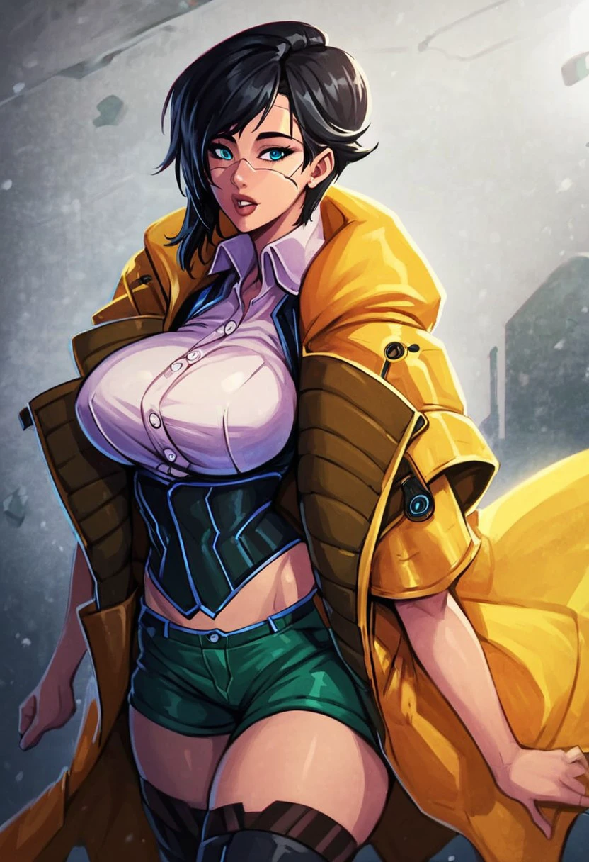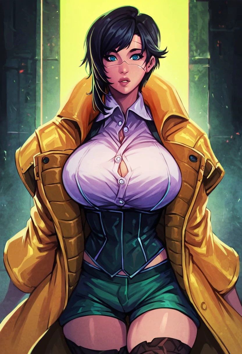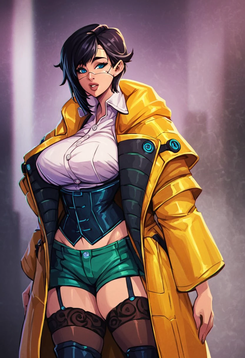 Outfit: yellow trench coat, wide collar coat, white button-up shirt, black corset top, black shorts, black thigh-high stockings, black boots