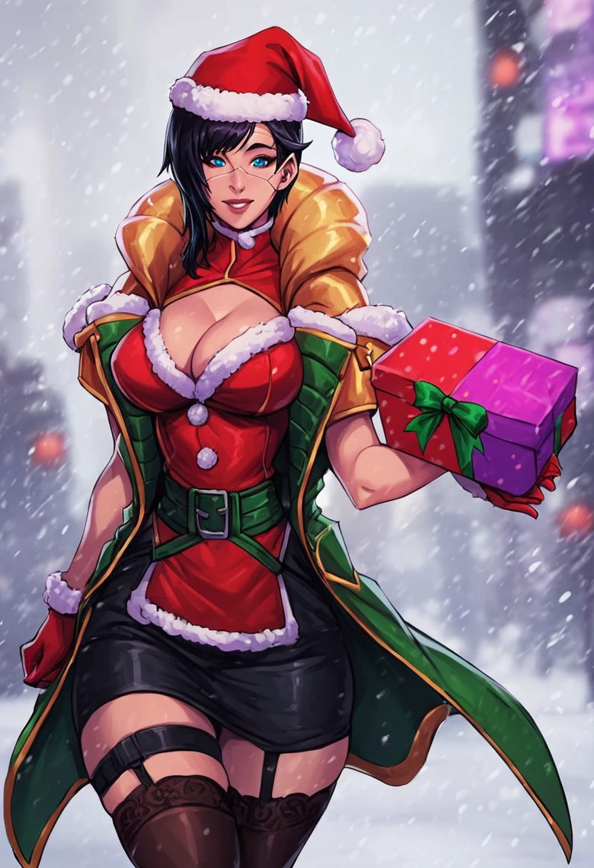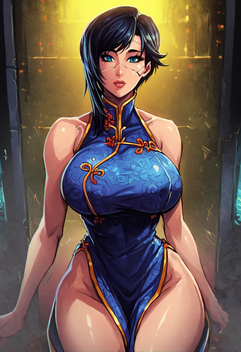 Tags: Mei-Lin Mak, black hair, short hair, long side bangs, teal eyes, lips, large breasts, cyberpunk, cyborg, cyberware