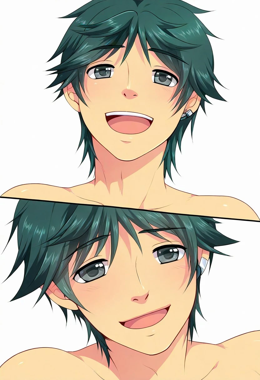 Haruyuki Kano, dark green hair, dark green-gray eyes, single left ear cuff, black tank top, yellow and blue briefs