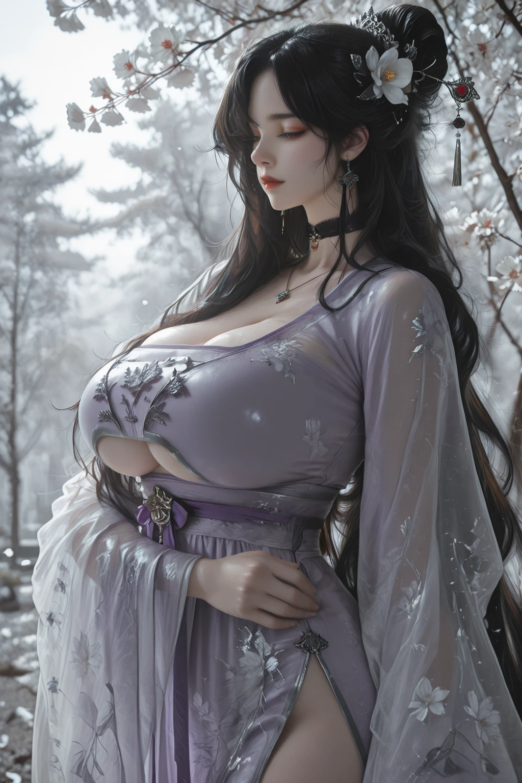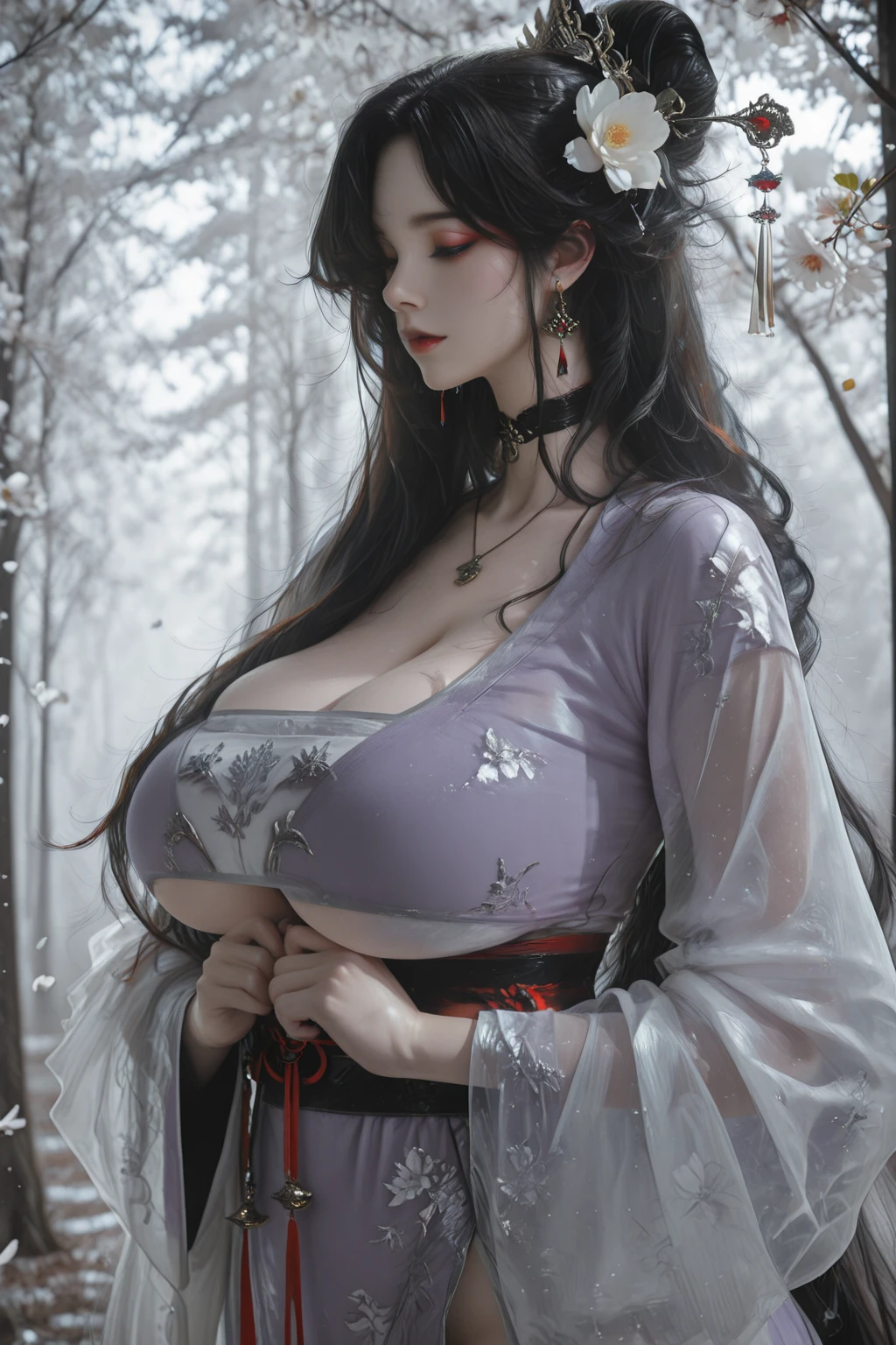 1girl, solo, mature woman, wuxia, black hair, absurdly long hair, hair bun, half updo, parted hair, wavy hair, long bangs, hairpin, crown hair ornament, flower ornament, makeup, thin lips, red lipstick, collarbone, huge breasts, choker, earrings,