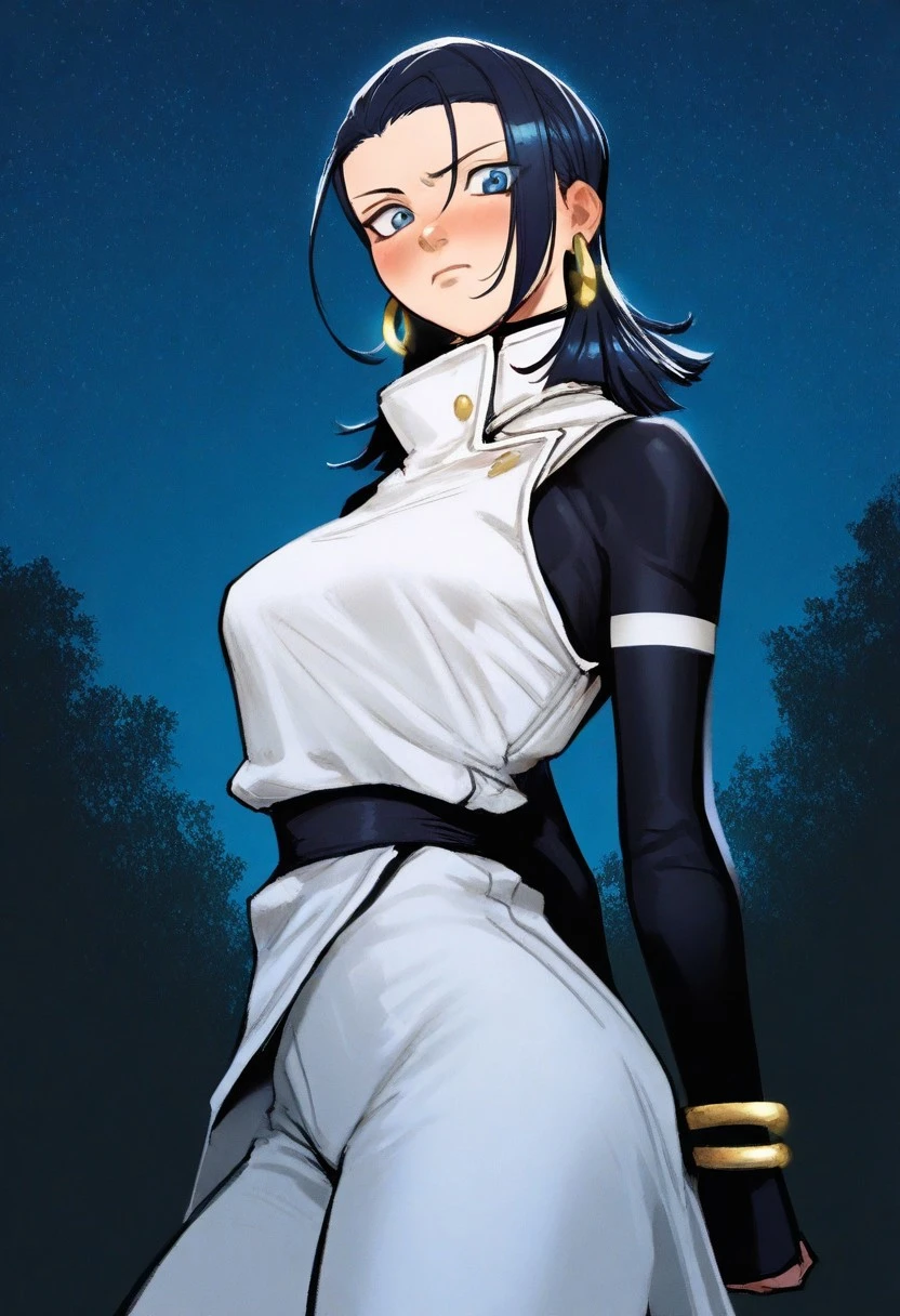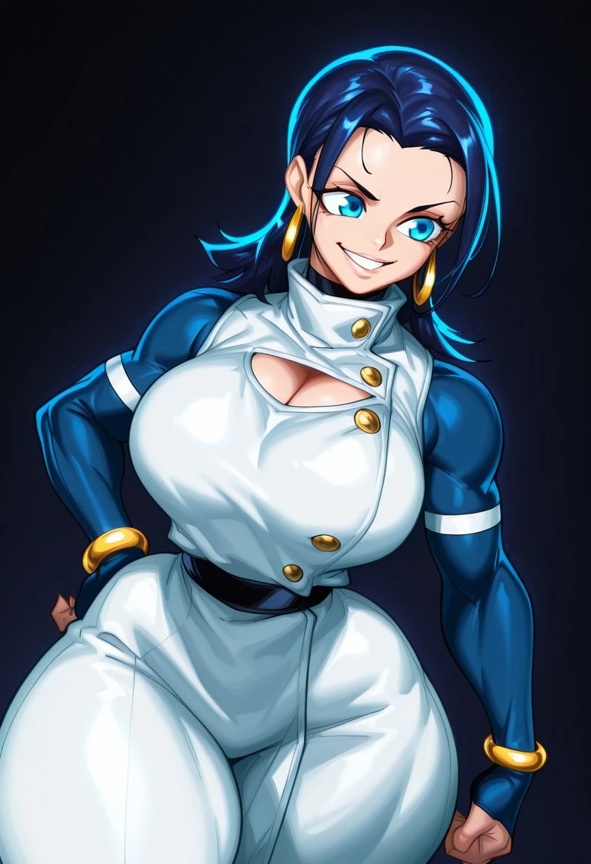 1girl, yuka_okkotsu, medium hair, dark blue hair, parted bangs, blue eyes, hoop earrings, golden earrings,