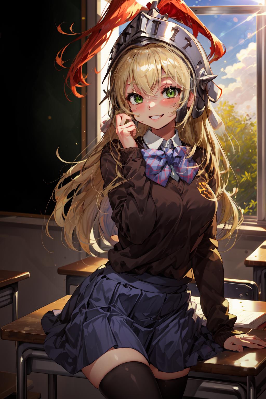 _the school uniform : thighhighs, long sleeves ,long hair, bow , school uniform