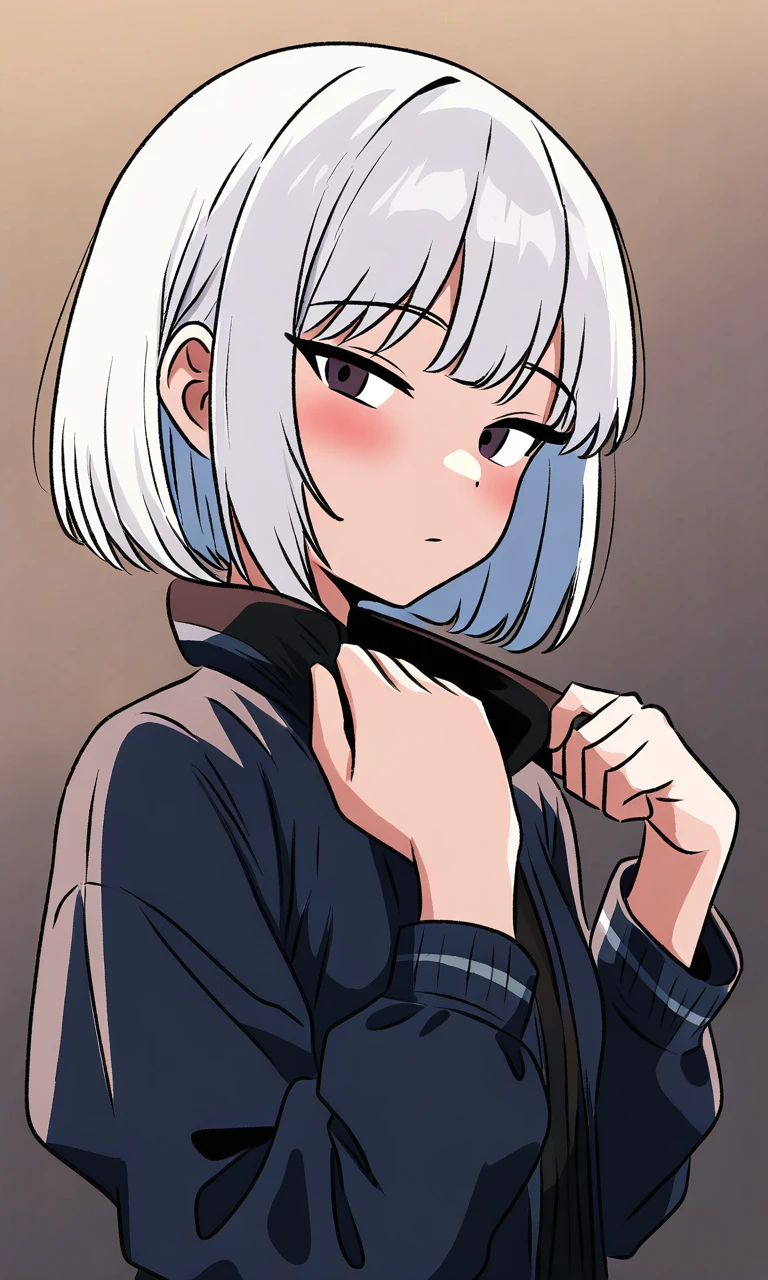 If its working as intended it shouldn't need trigger words, however you could try: white hair, bangs, bob_cut, dark eyes