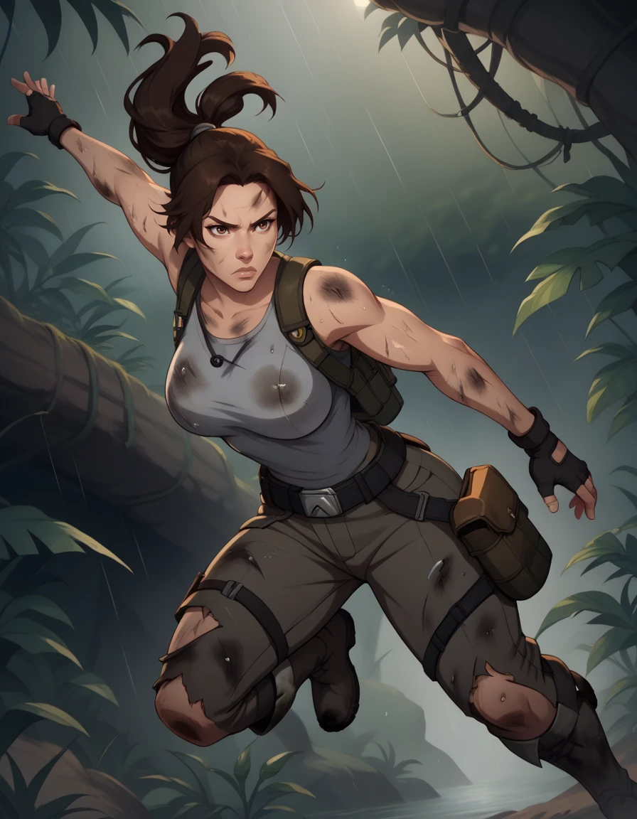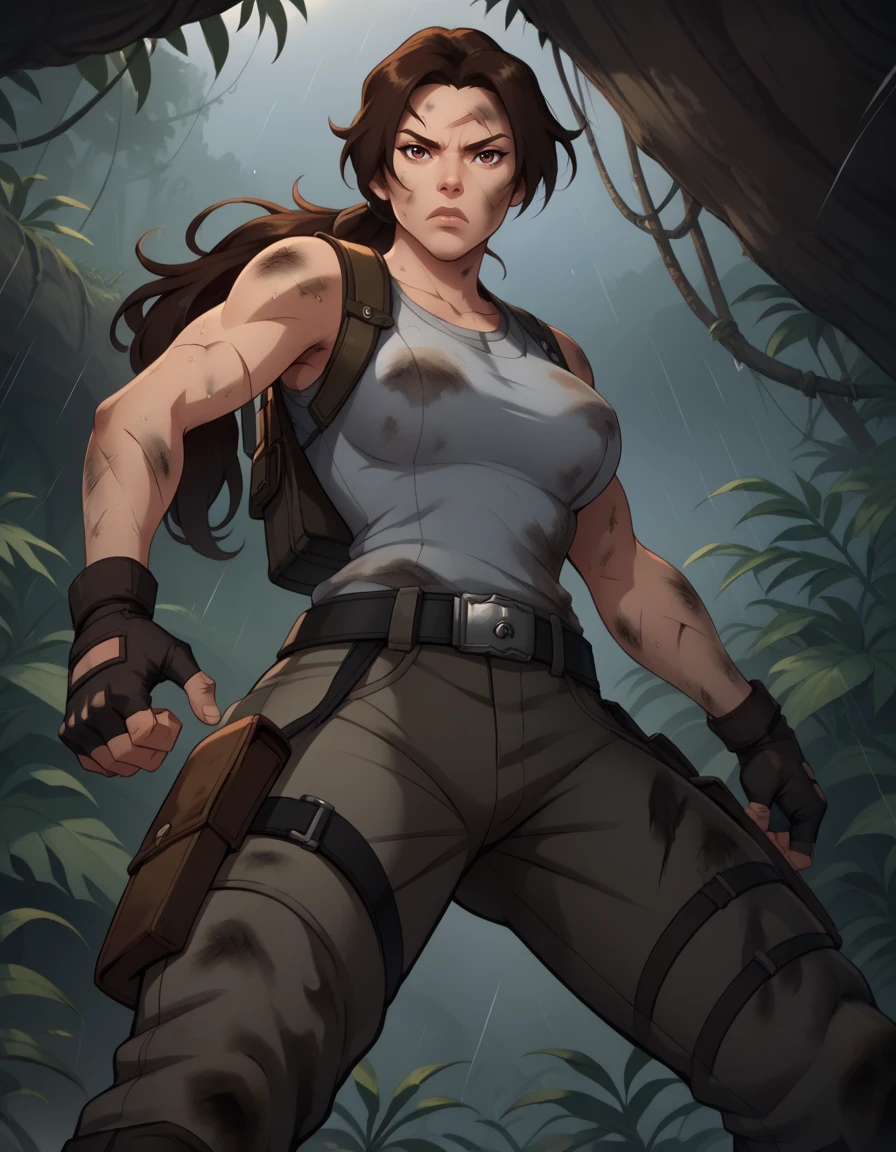 fingerless gloves, boots, belt, pants, tank top, grey shirt,