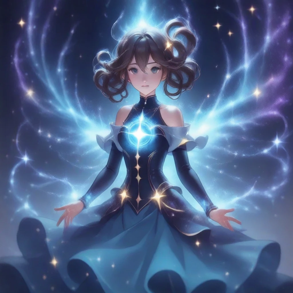 a Great anime style in magical form image generation on the FLUX base lora modelExp prompt"A futuristic spacecraft cruising through deep space, surrounded by nebulae and stars. The ship is sleek with glowing blue engines and metallic hull"