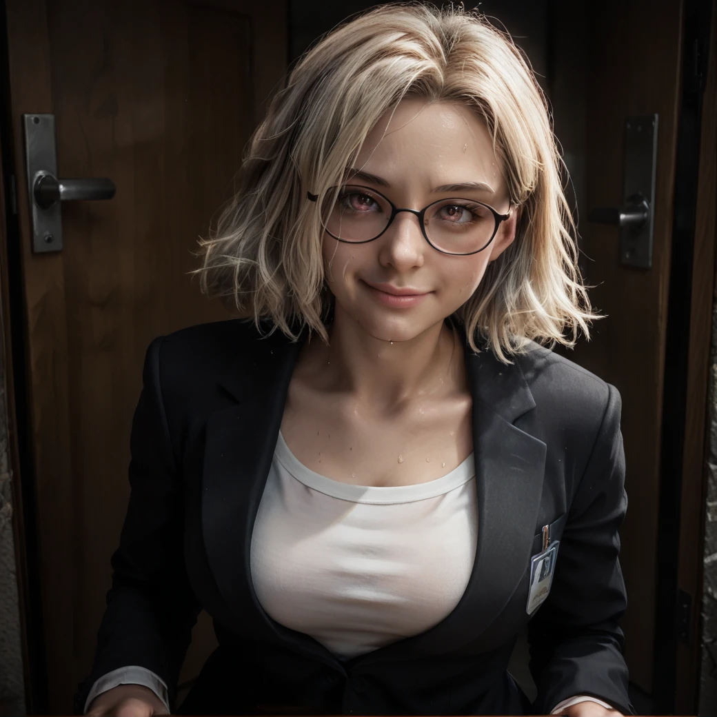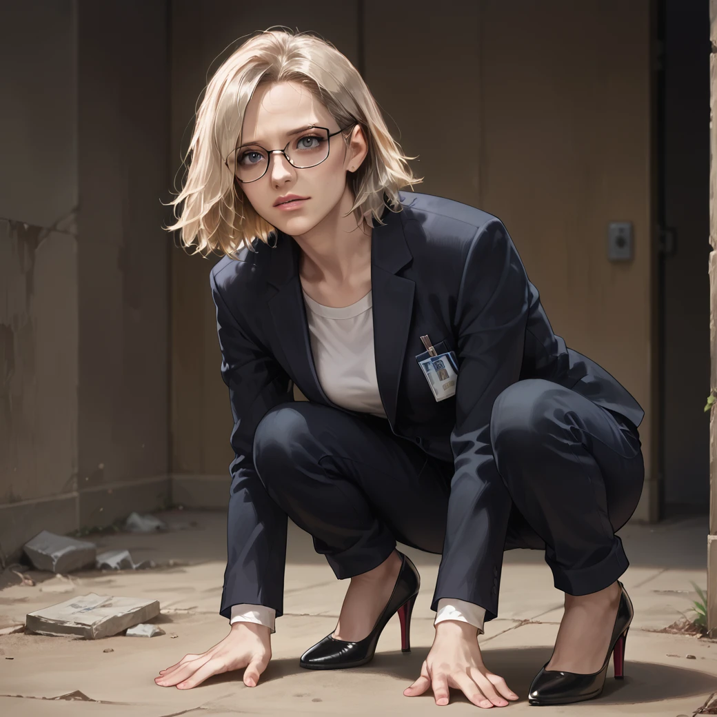 1girl, solo, 25 years old, GraceA, light blonde hair, black blazer, white top, trousers, glasses, high heels