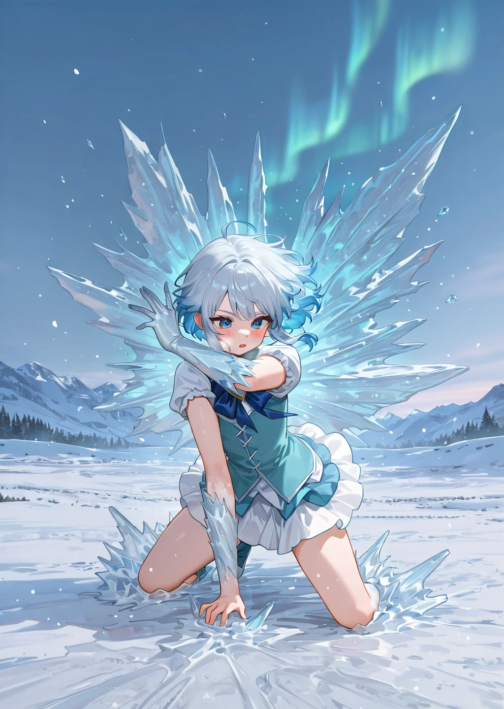 perfect quality, best quality, detailed, intricate, realistic, (cute polar bear:1.4), vast snowy landscape, aurora <lora:Frost [Illustrious]_epoch_12:0.5> frost_glass, scenery, outdoorsNegative: