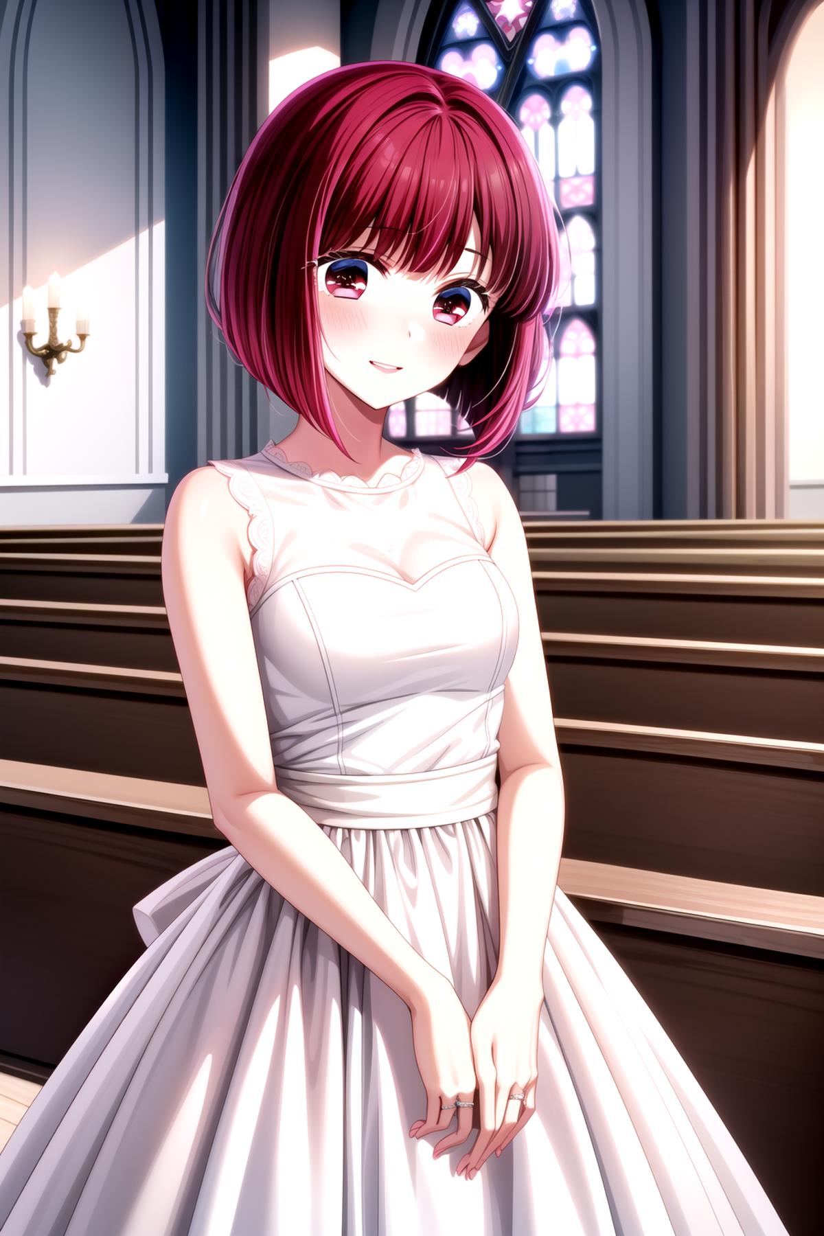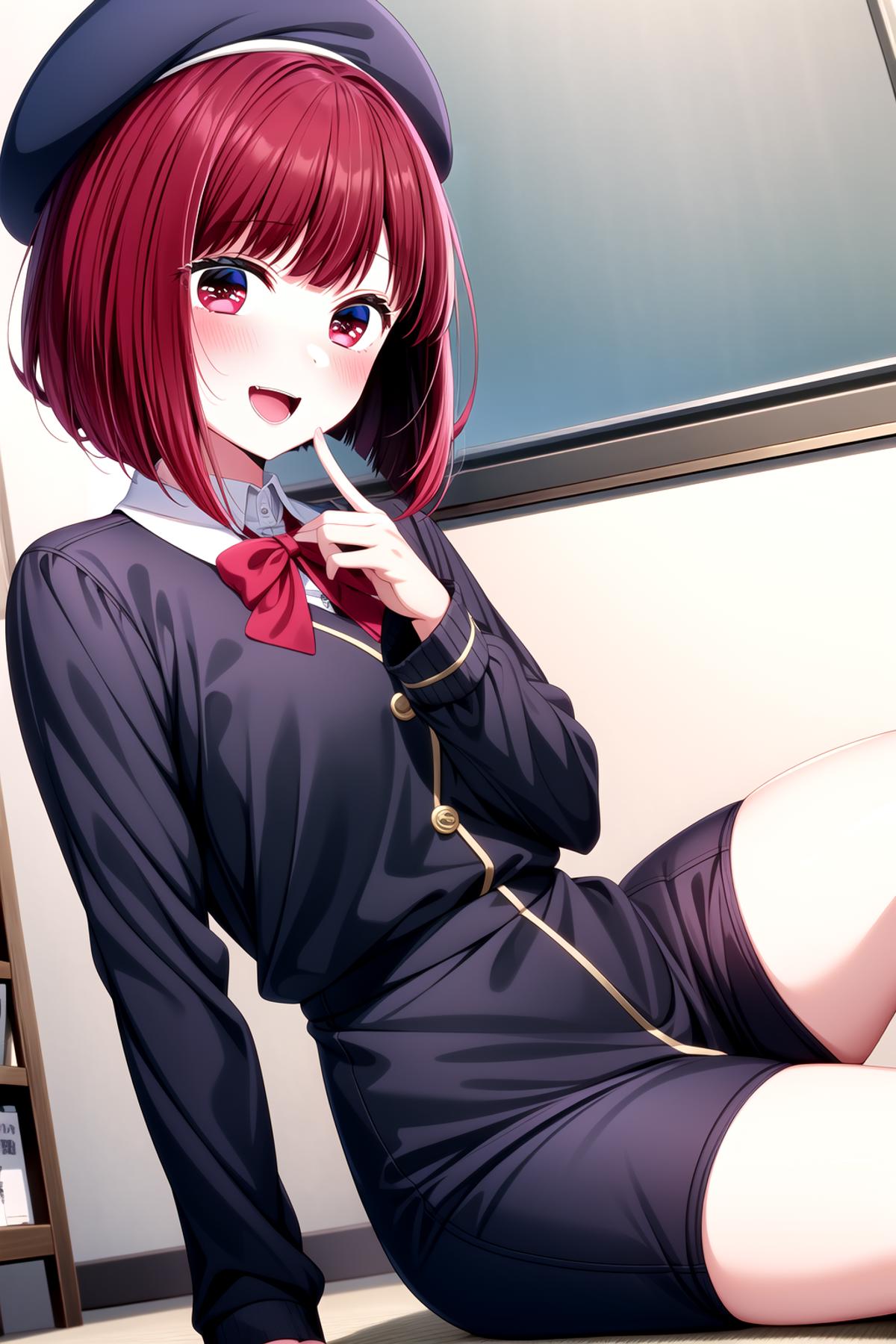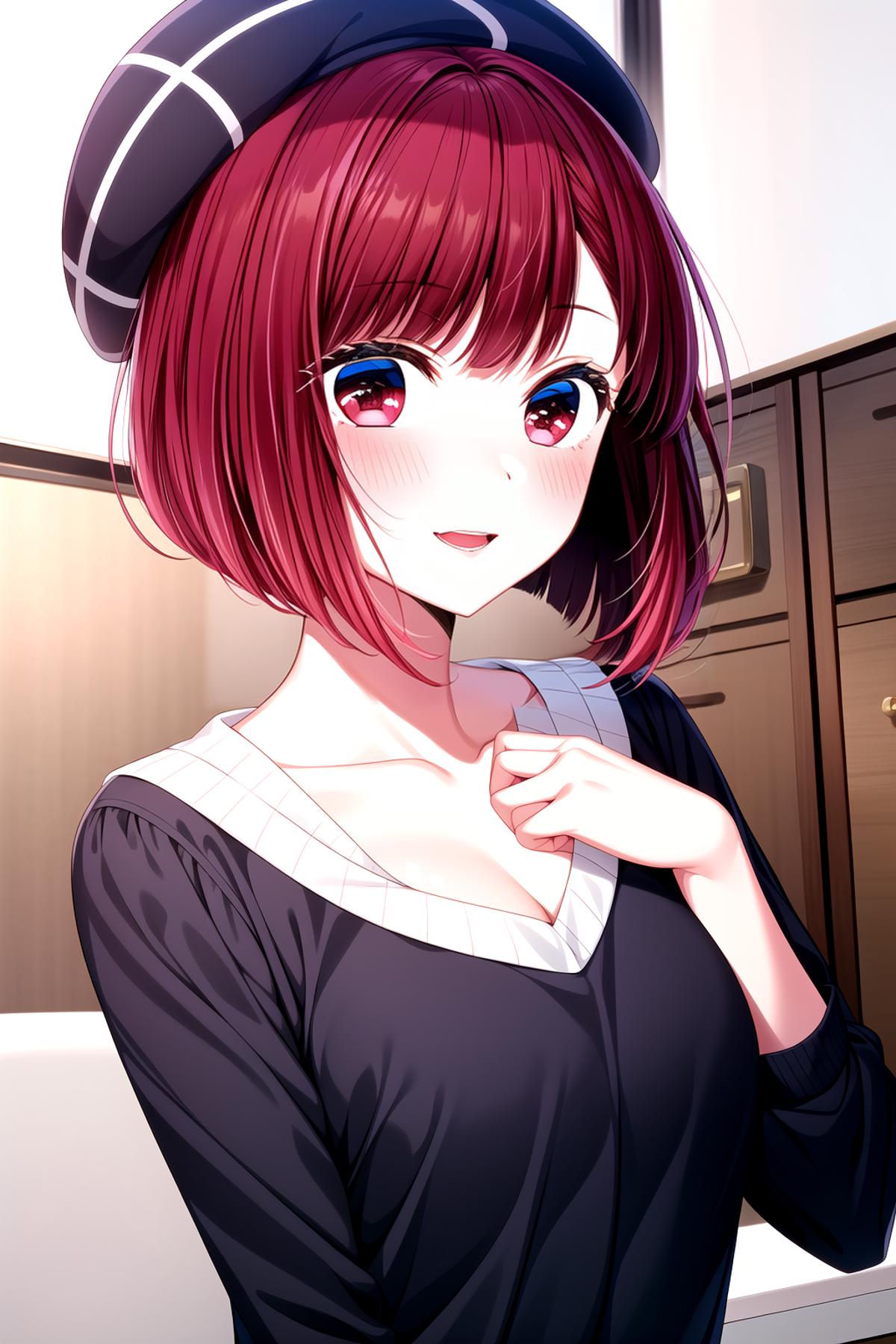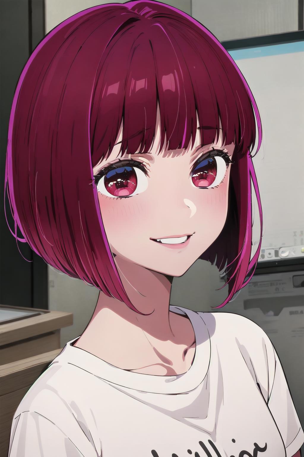 Character: arima kana, red hair, red eyes, bob cut, short hair, small breasts