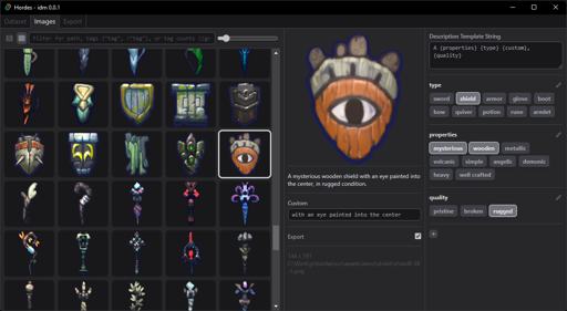 2 - Information about the selected image. Full description and a field for a unique description {custom} for each image. There's also an "Export" checkbox that determines whether the image will be exported or not.