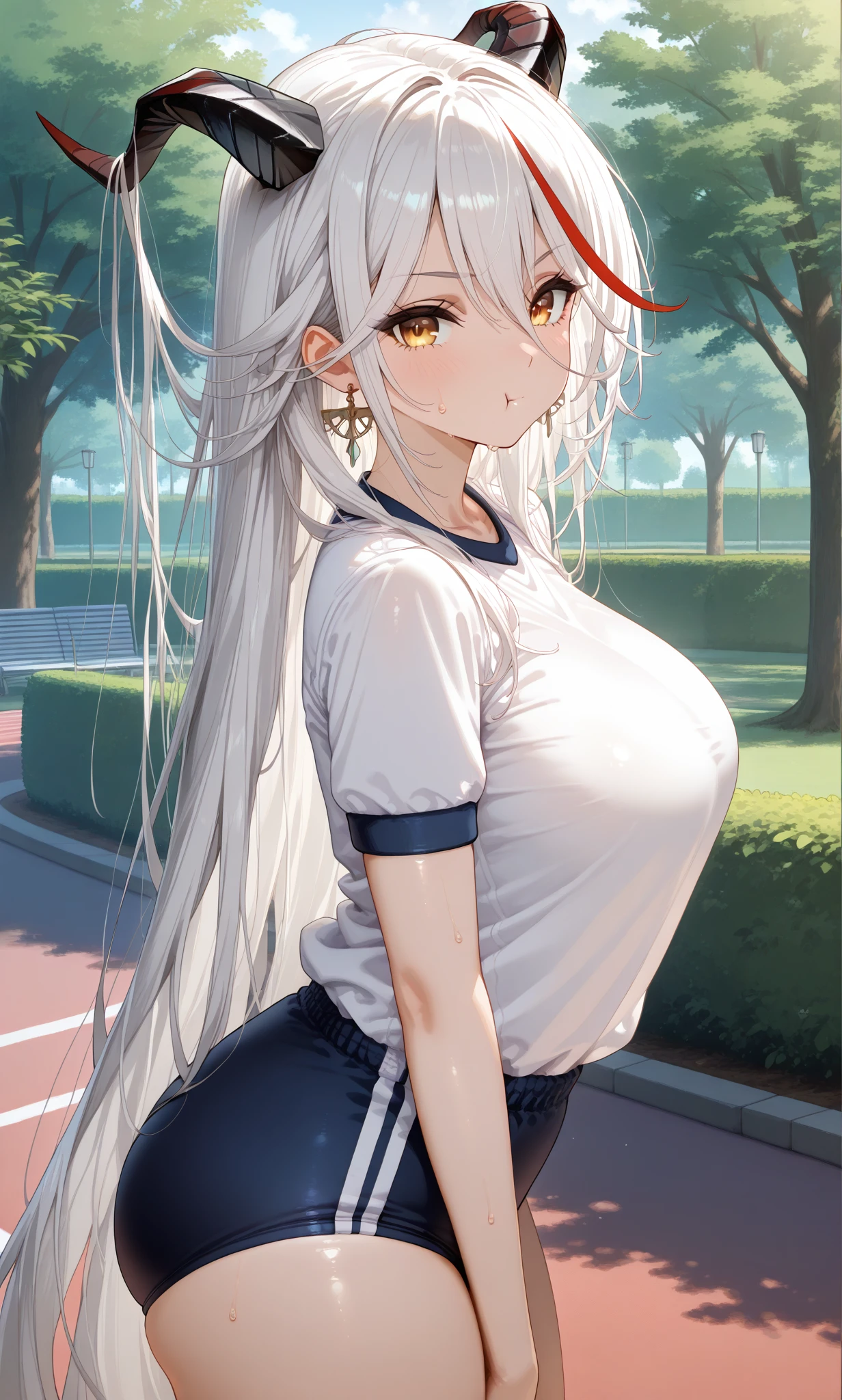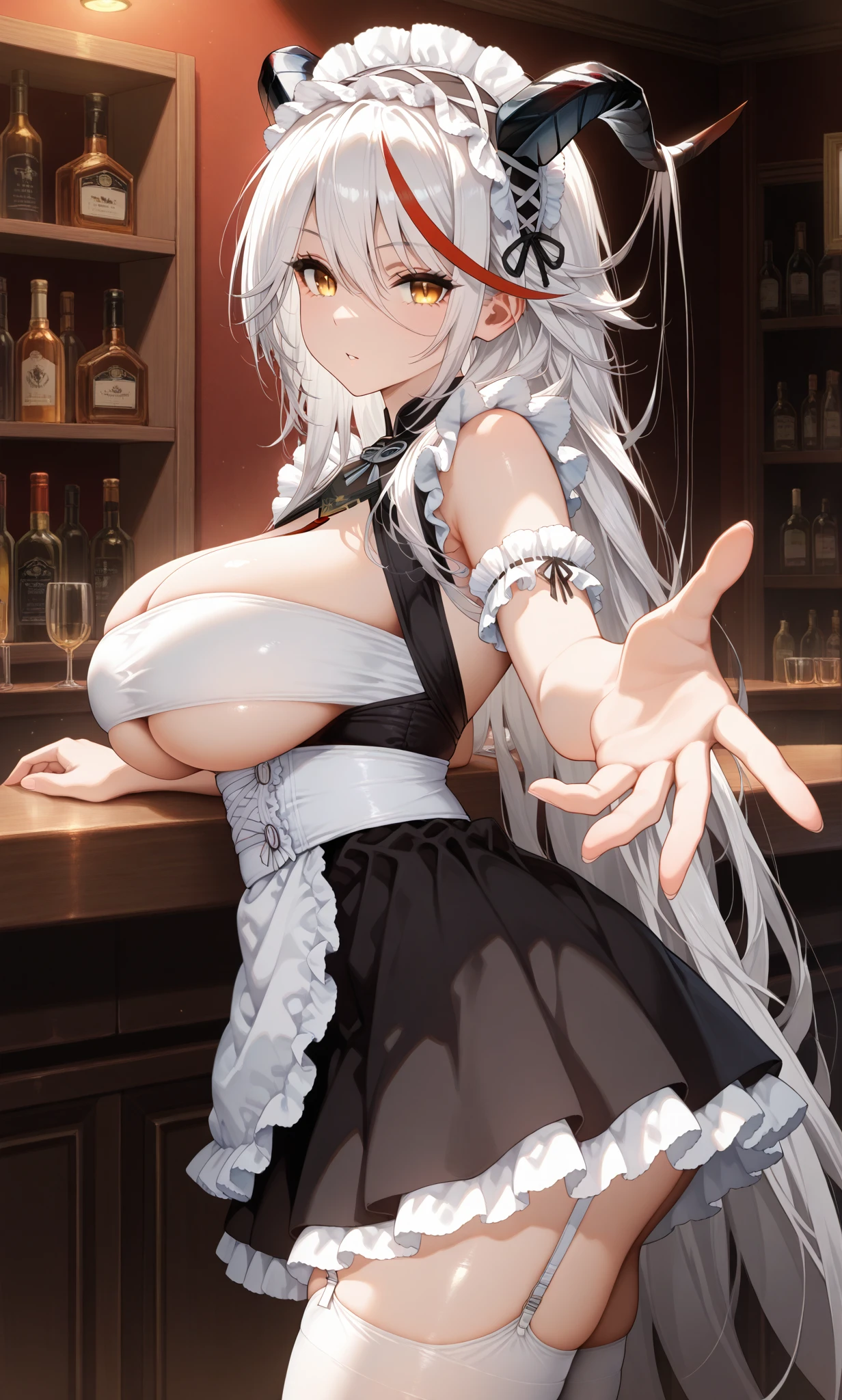 aegir (azur lane), very long hair, streaked hair, white hair, yellow eyes, demon horns, very long hair, hair between eyes, bangs, earrings