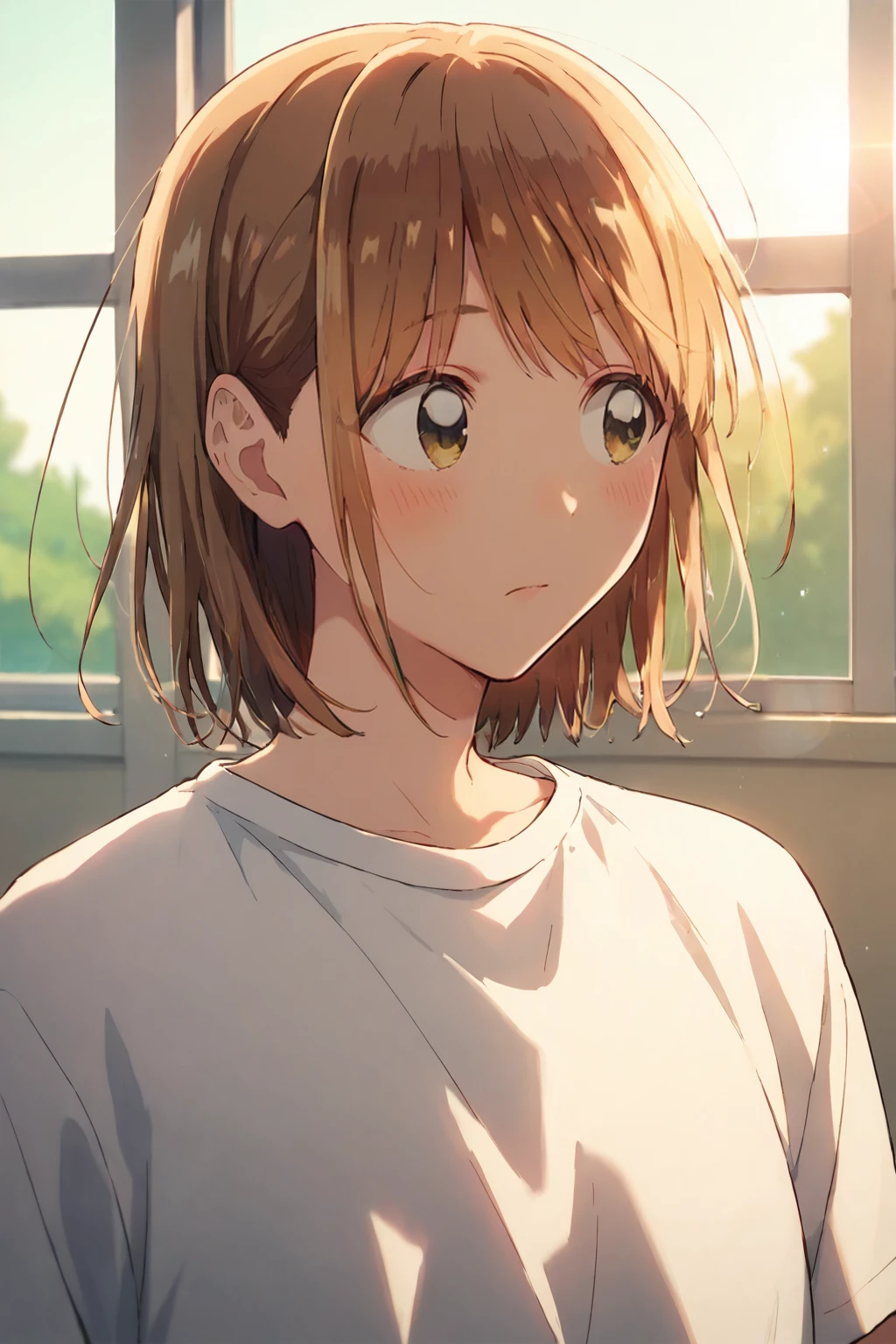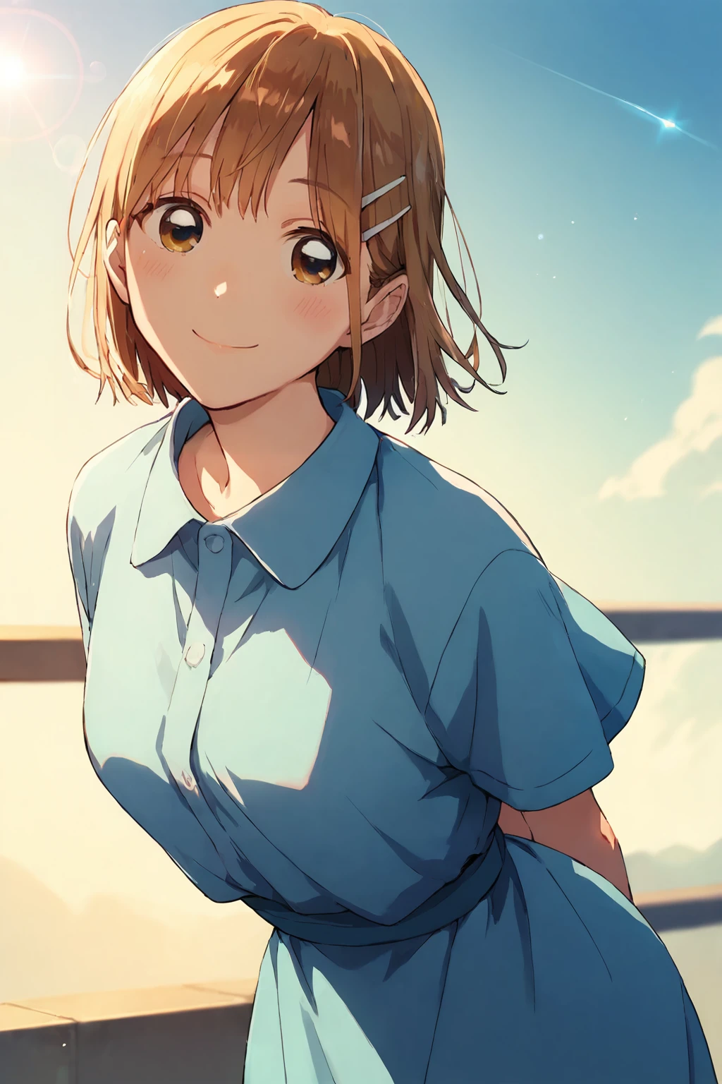 white hairclip,blue dress, short sleeves,