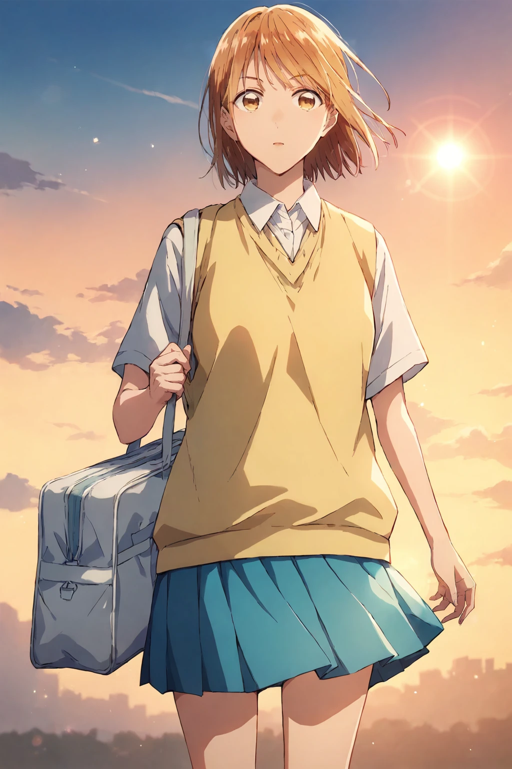 school uniform,yellow sweater vest,white shirt,collared shirt,short sleeves,blue skirt,pleated skirt, white socks, brown footwear, loafers,