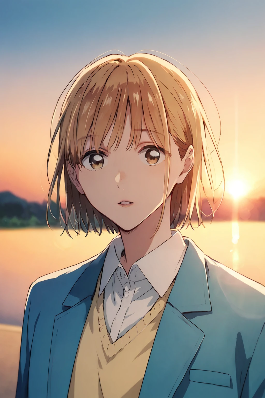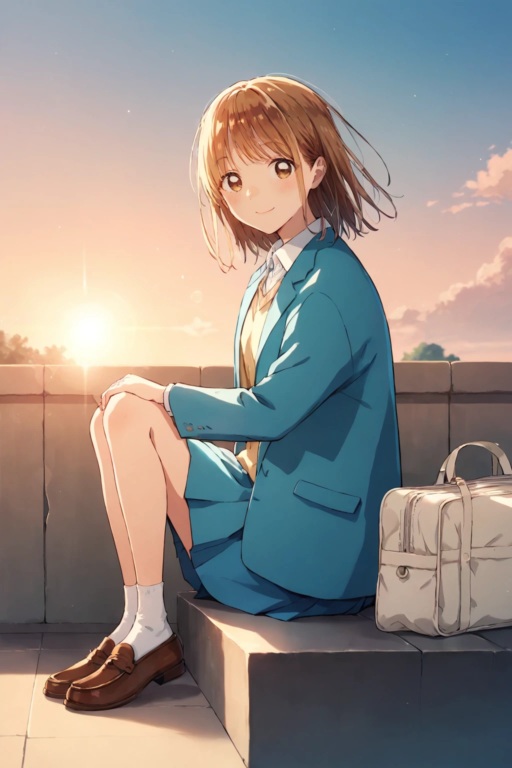 school uniform, blue blazer, long sleeves, yellow sweater, white shirt, collared shirt, blue skirt, pleated skirt, white socks, brown footwear, loafers,
