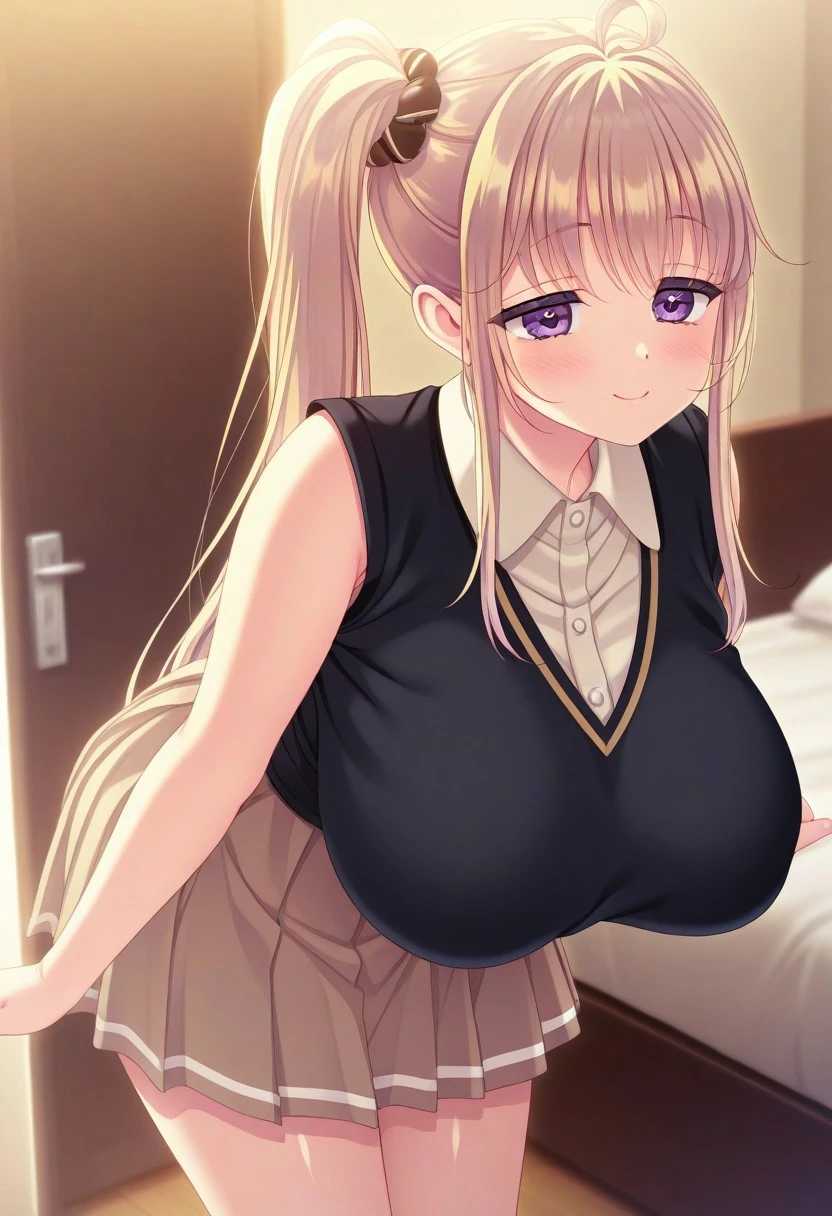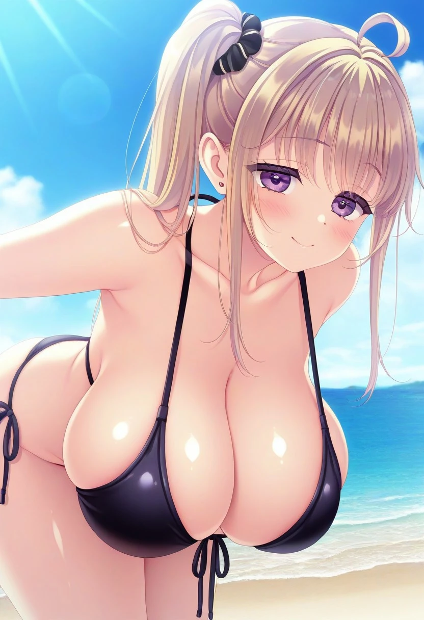 Recommend Prompt:Runa, purple eyes, blonde hair, long hair, side ponytail, hair scrunchie, ahoge, sidelock,
