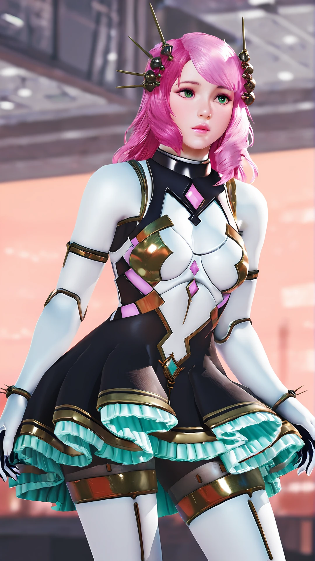 ,Alisatekken7,1girl,solo,pink hair,green eyes,dress,armor,hair ornament,android,joints,robot joints,lips,realistic,