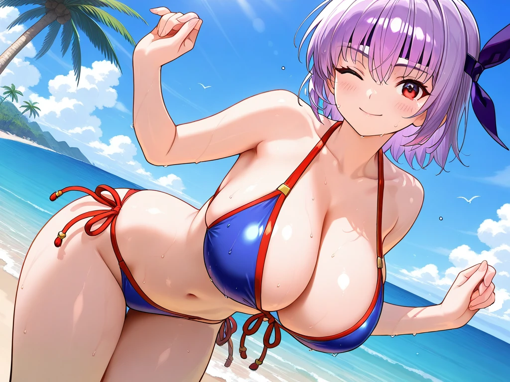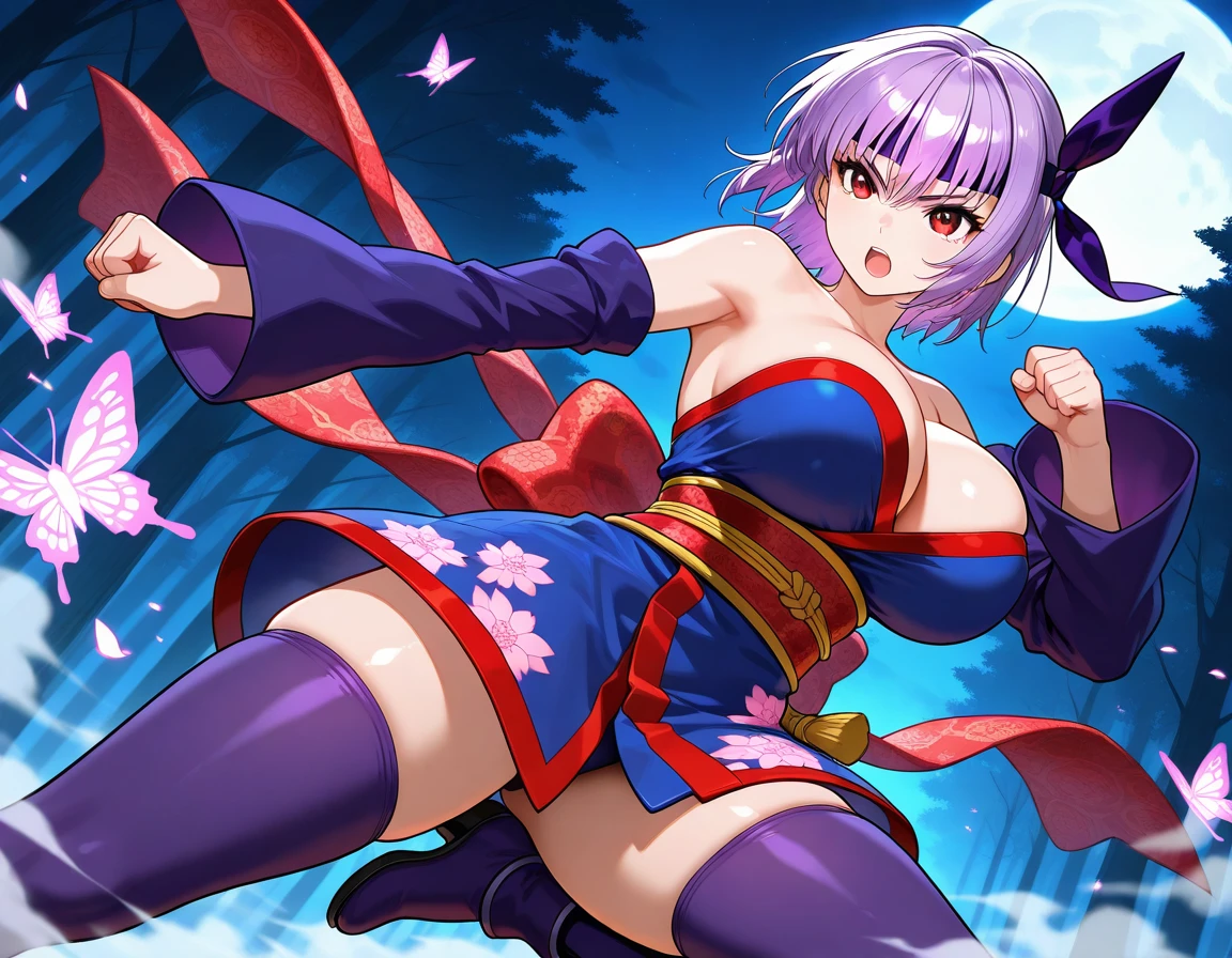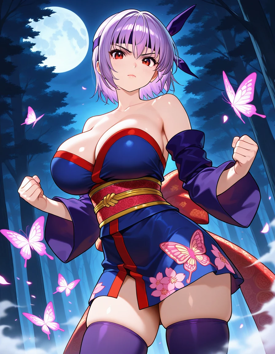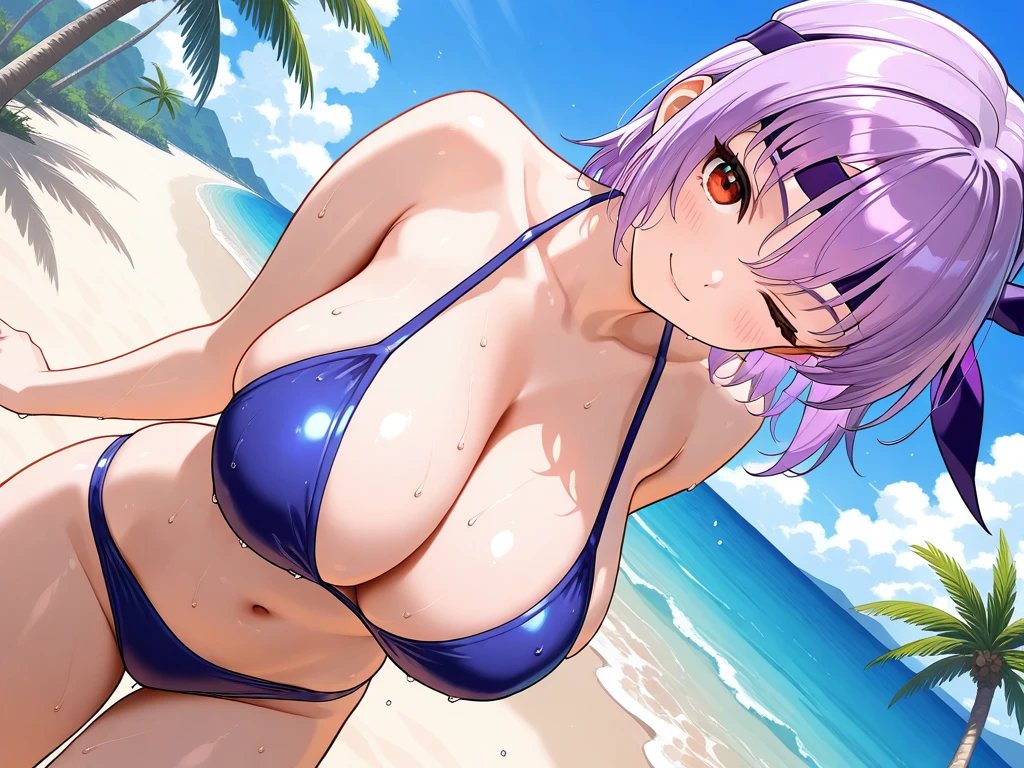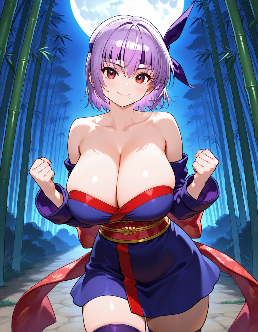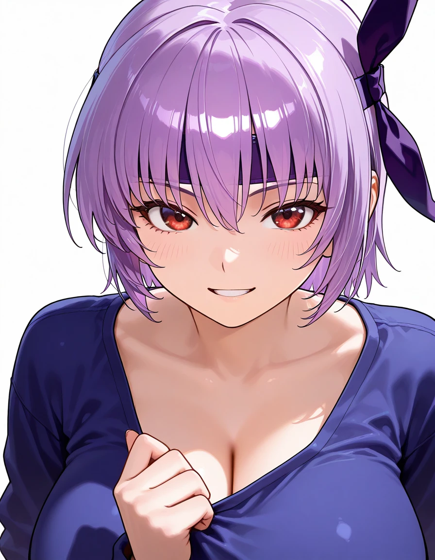 Ayane_DOA, 1girl,solo, short hair, purple hair, ayane (doa), red eyes, purple headband, large breasts, bangs,