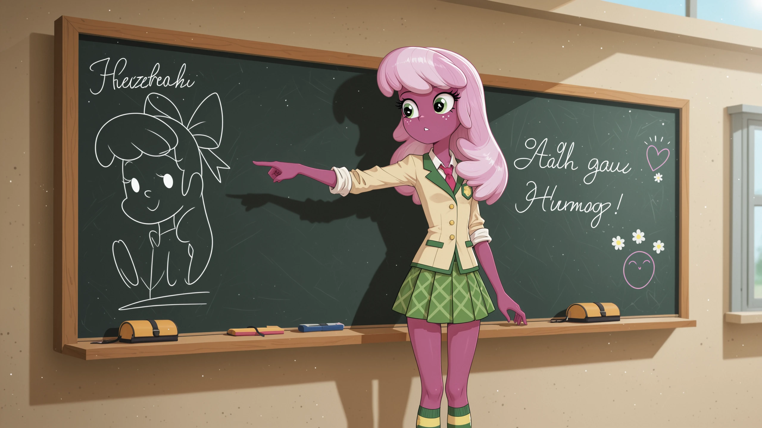 Clothes: a light brown jacket with a white top, a green pleated skirt with a zigzag pattern. On the legs are bright green knee socks, and on the feet are brown shoes with white flowers