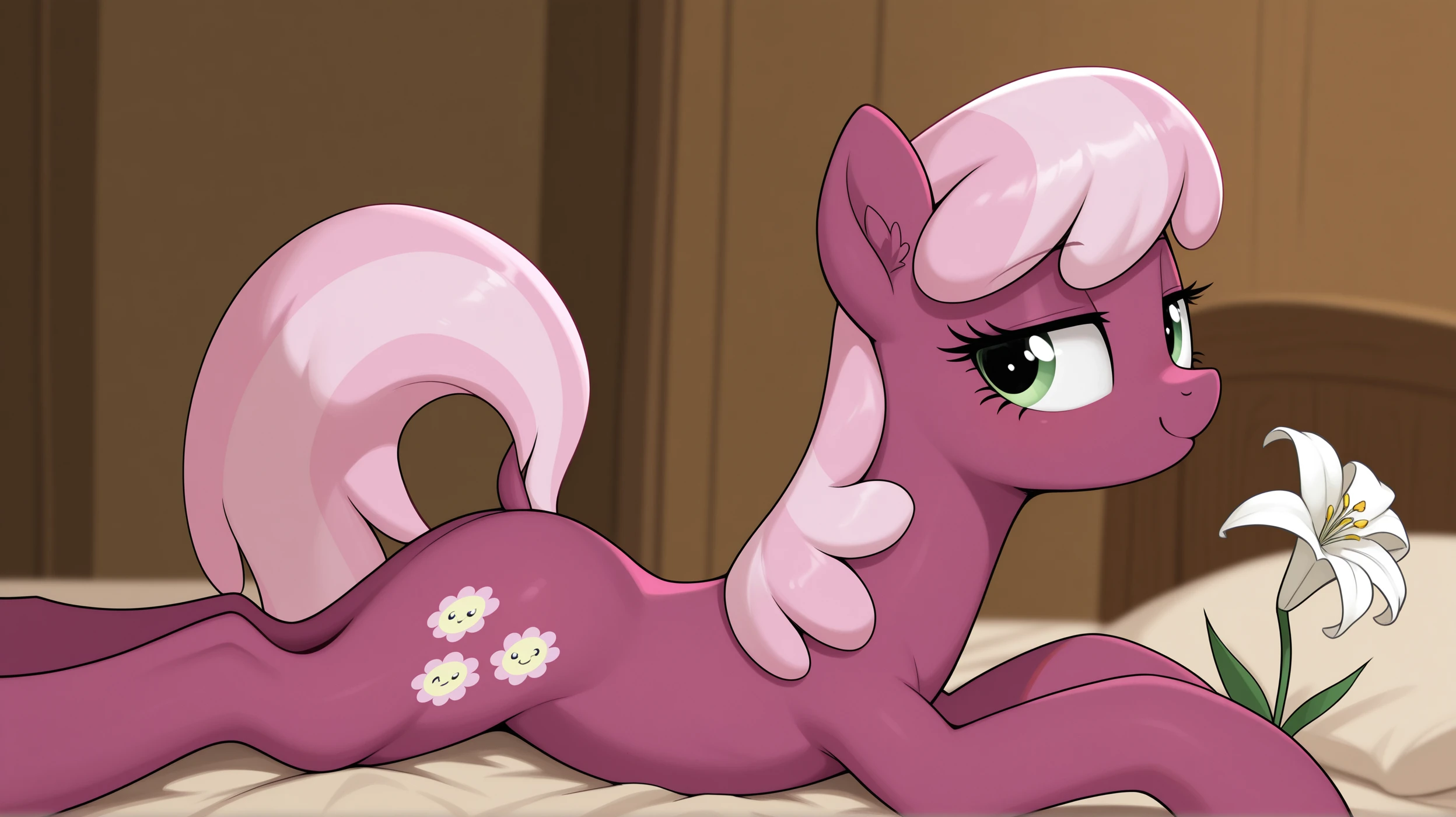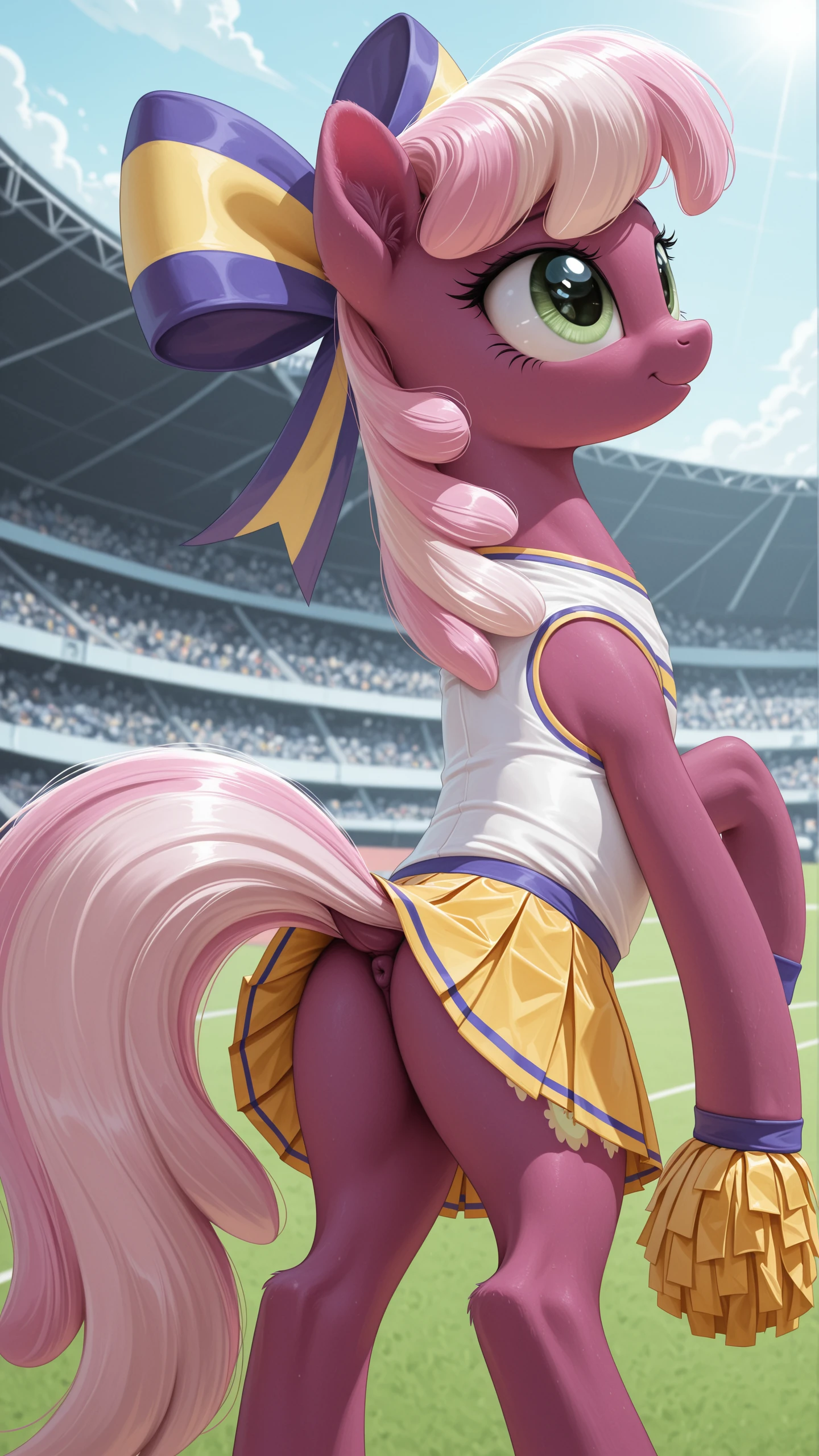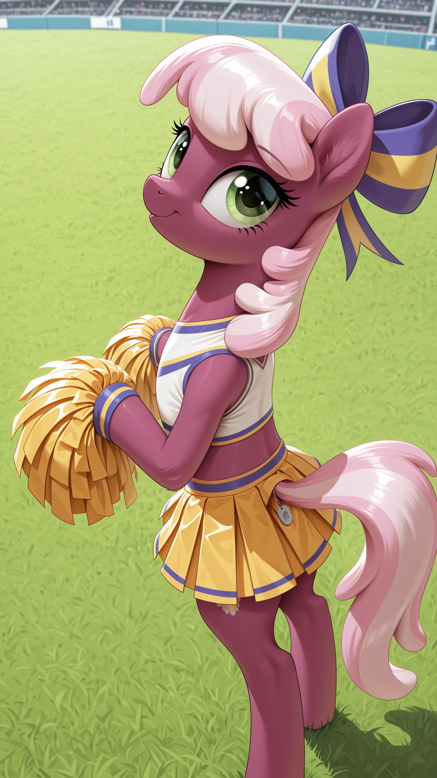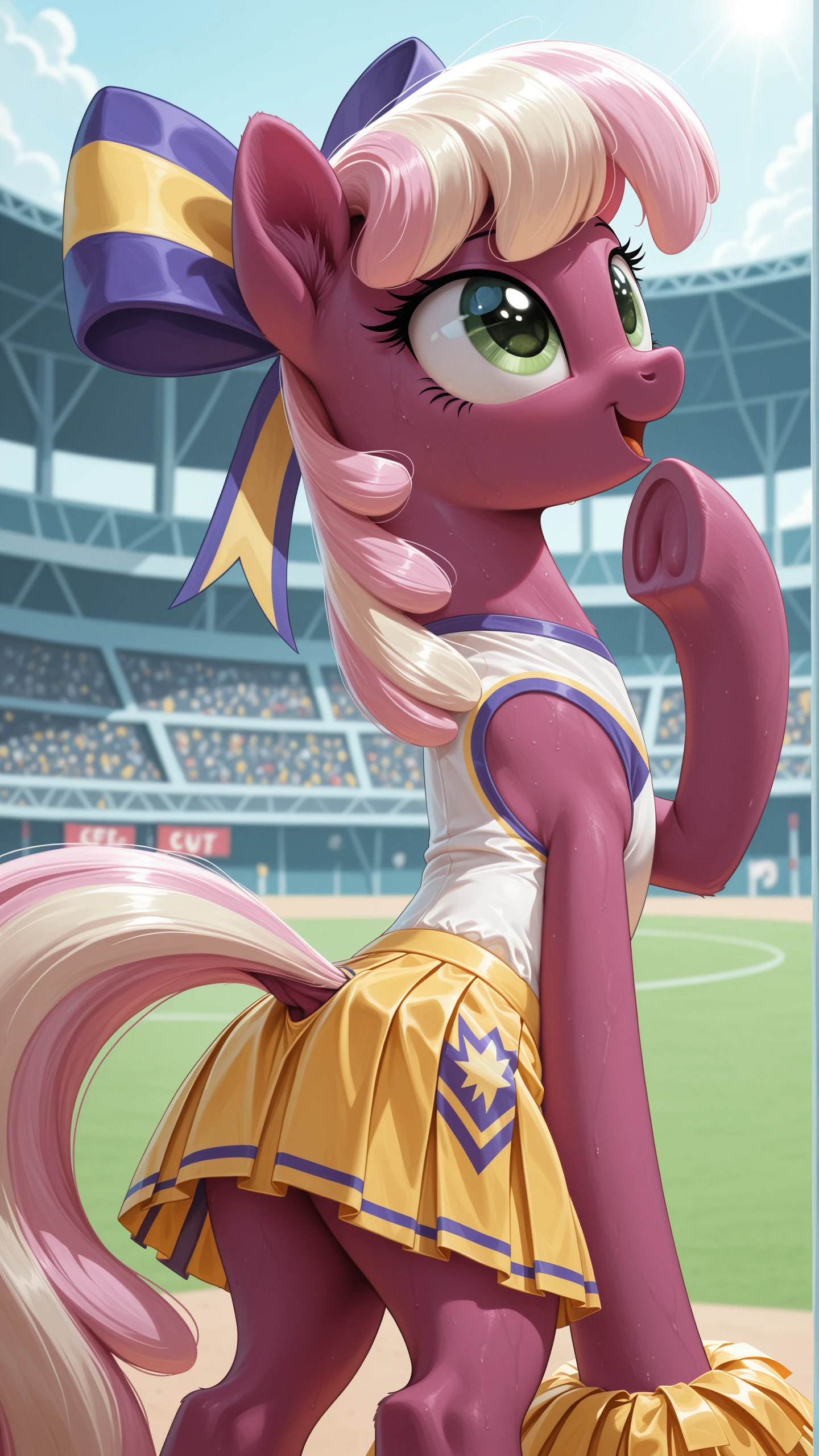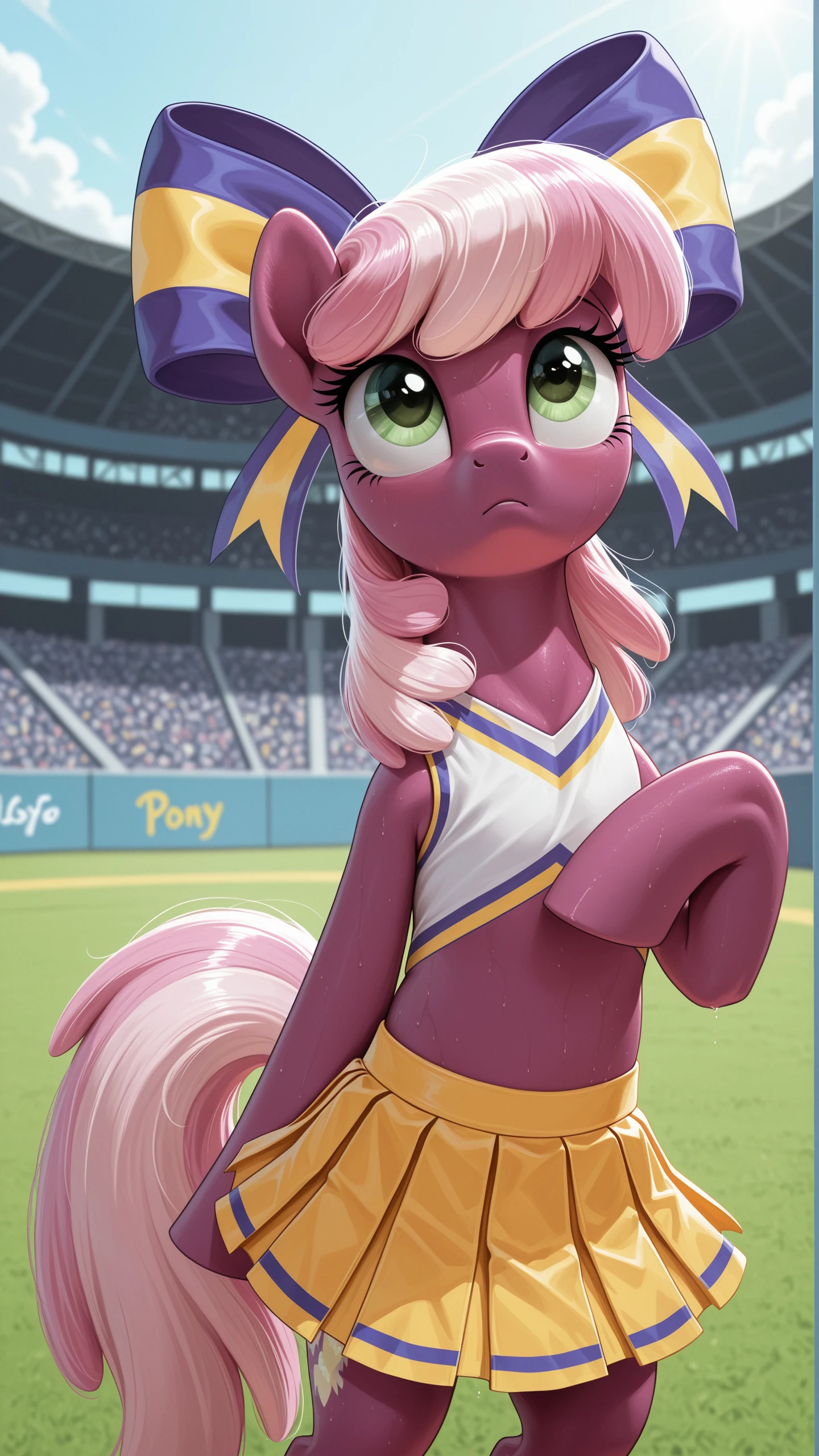 Clothing: cheerleader costume. Purple top with yellow stripes, yellow skirt, multi-layered. A large bow on her head