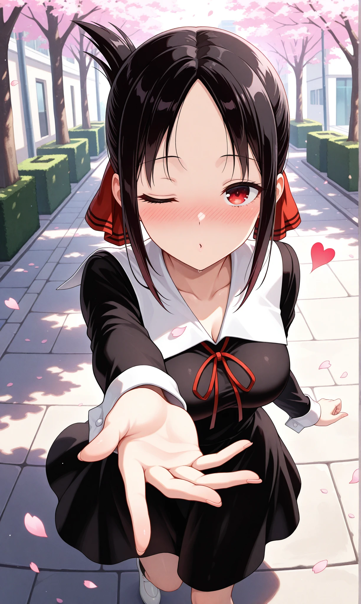 shinomiya kaguya, red eyes, black hair, sidelocks, parted bangs, hair ribbon, red ribbon